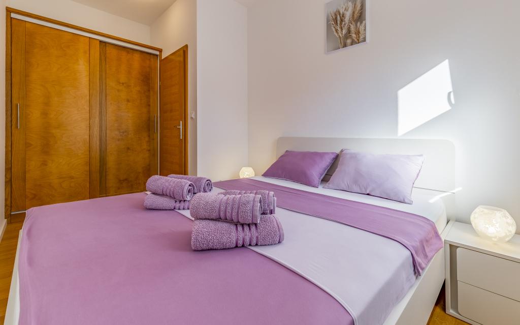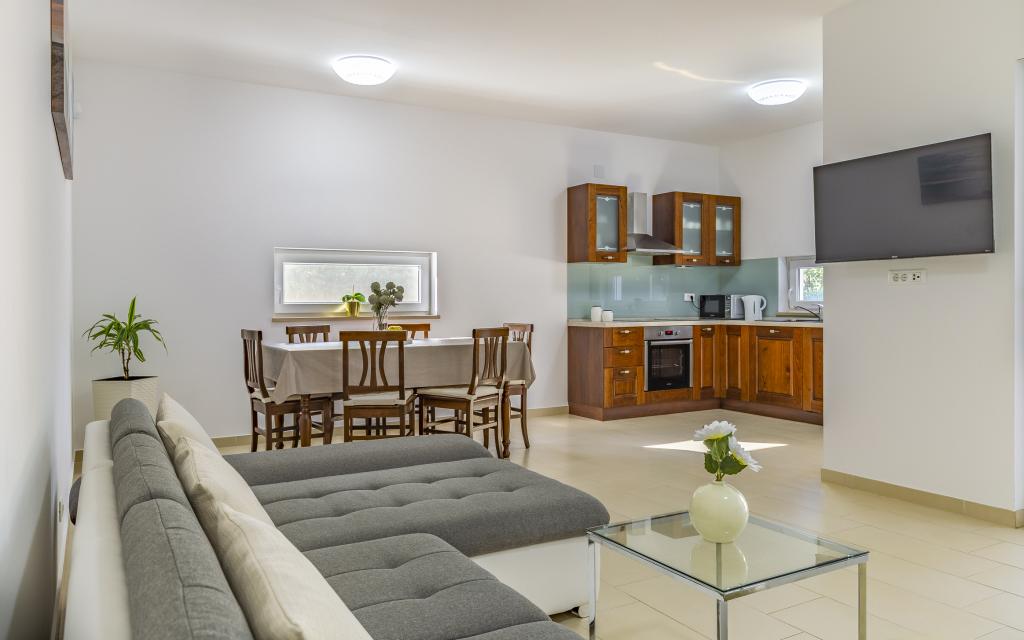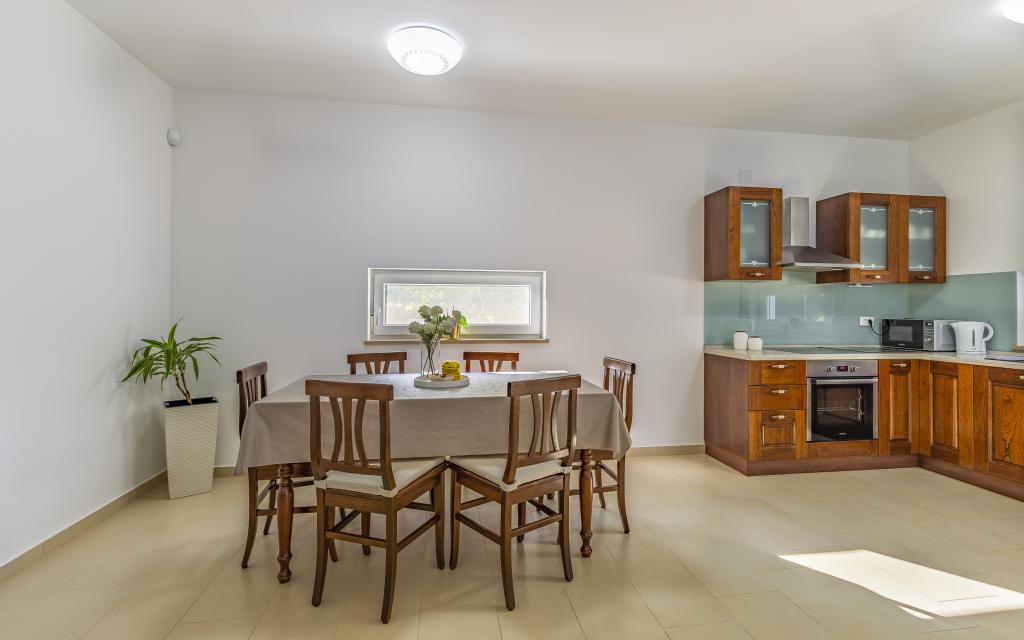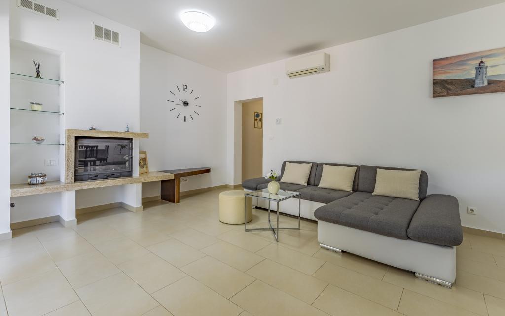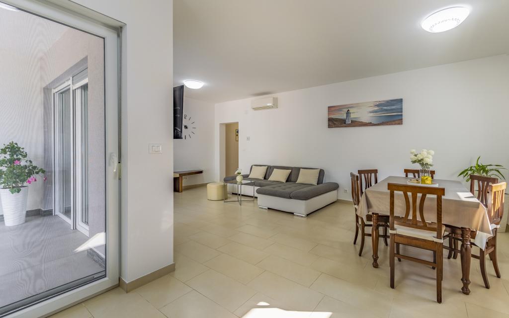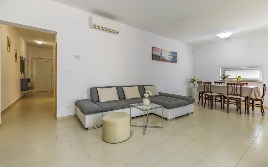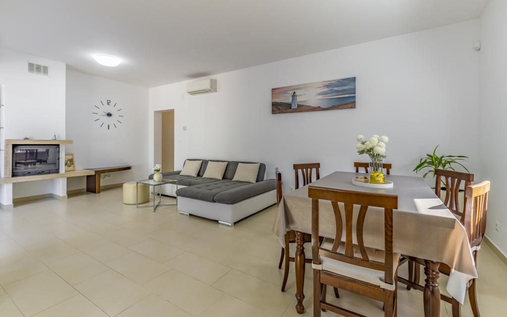 Fuldt møbleret lejlighed (80 m2) i en fremragende beliggenhed i en rolig del af Banjol, kun 5 minutters (300 m) gang fra de smukkeste strande i området. Lejligheden ligger i stueetagen af en boligbygning med kun tre lejligheder. Lejligheden har en privat have (100 m2) med terrasse, bord, liggestole, udendørs bruser og grill, hvilket giver mulighed for behageligt socialt samvær med masser af privatliv og er især velegnet til børnefamilier. Der er en privat parkeringsplads ved siden af bygningen med direkte adgang til haven og terrassen. Haven blev fuldstændig renoveret i 2024. Hele bygningen er beskyttet af et sikkerhedshegn (kortadgang). Lejligheden har 2 soveværelser med dobbeltsenge, 2 badeværelser med toilet og bruser, en rummelig stue med en udtrækkelig sofa, spisestue og køkken. Lejligheden har aircondition og er opvarmet om vinteren (gulvvarme) og har en indendørs pejs, så den også er velegnet til ophold i de koldere efterårs- og vintermåneder. I umiddelbar nærhed af lejligheden er der adskillige barer og restauranter samt dekorerede butikker.