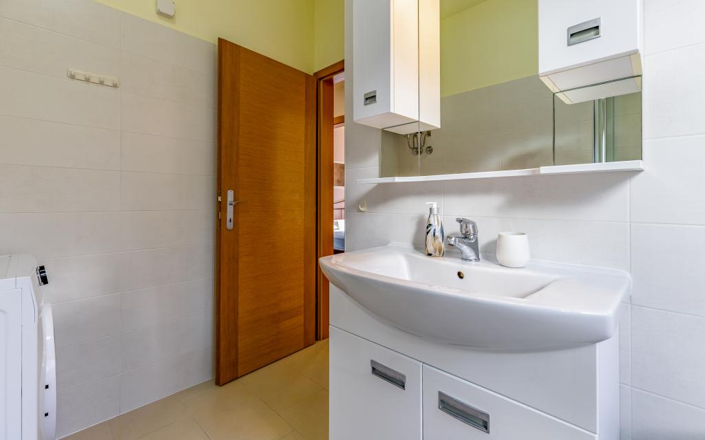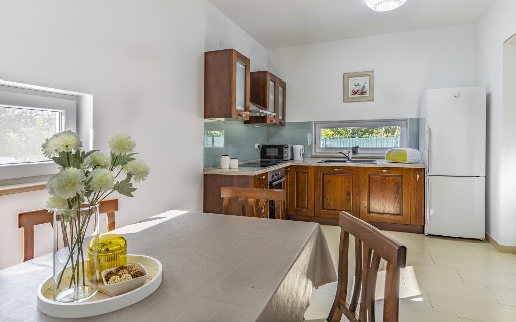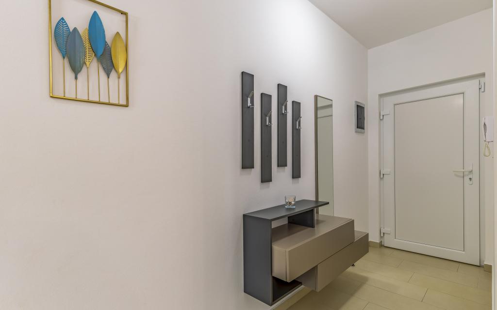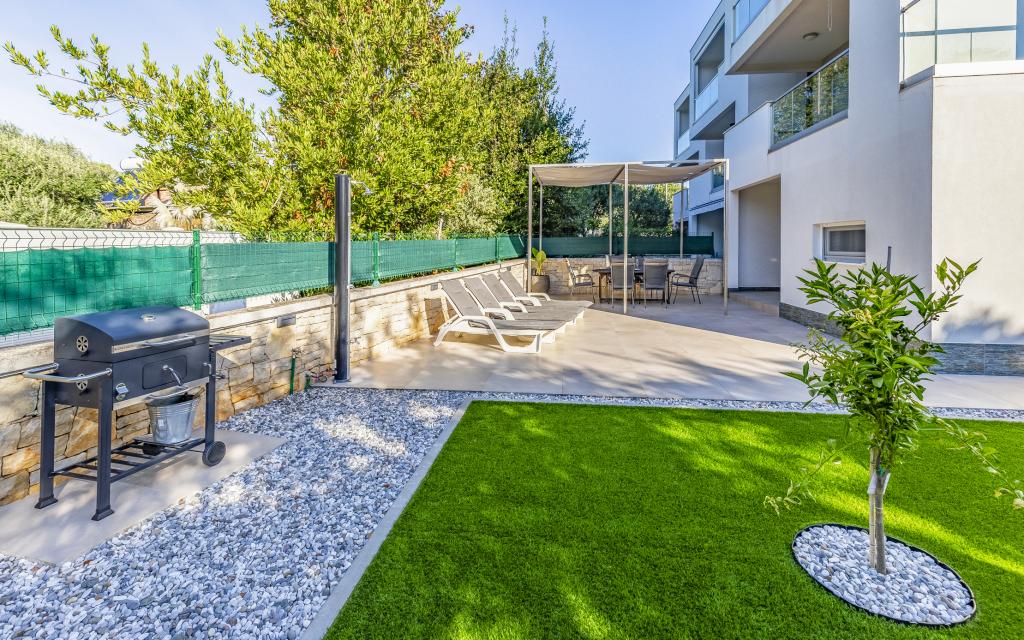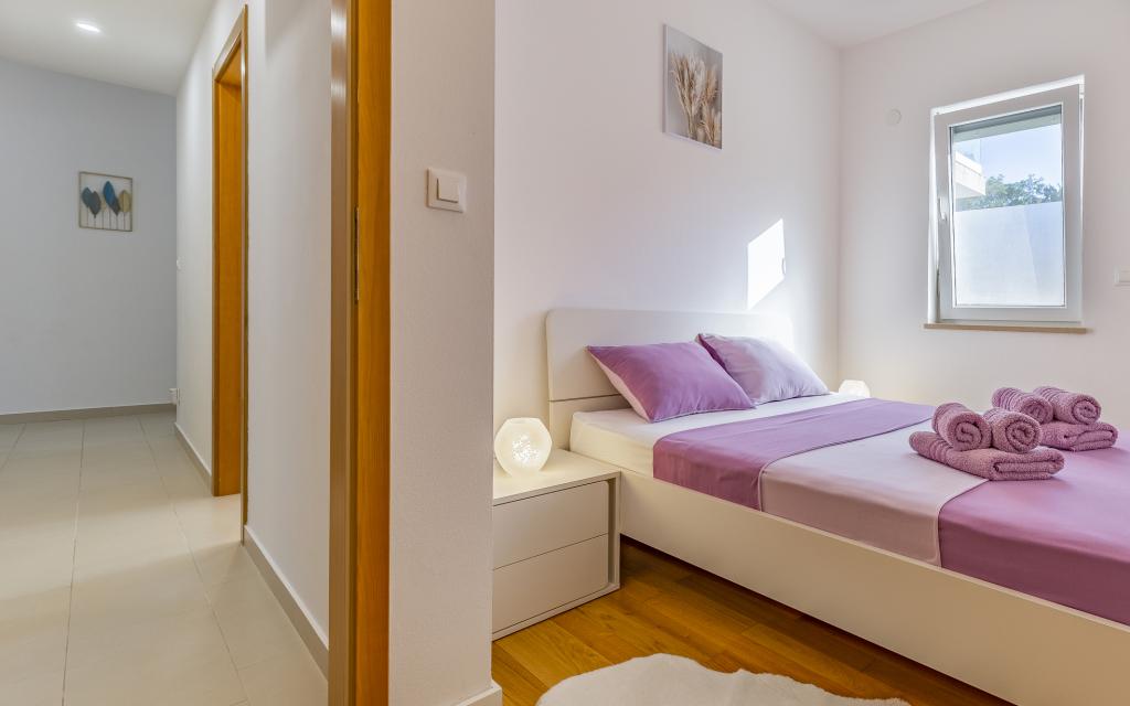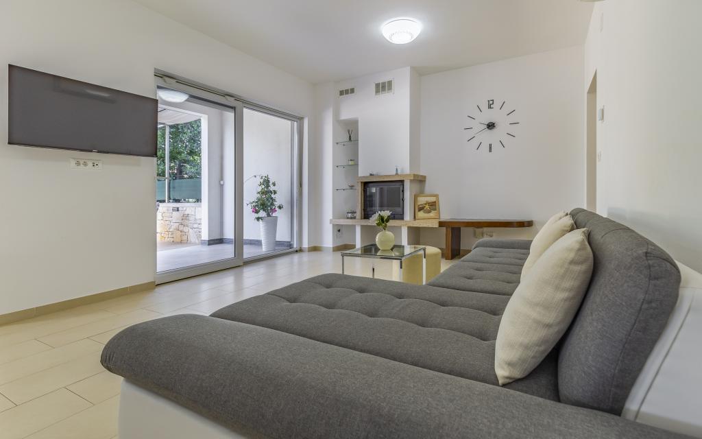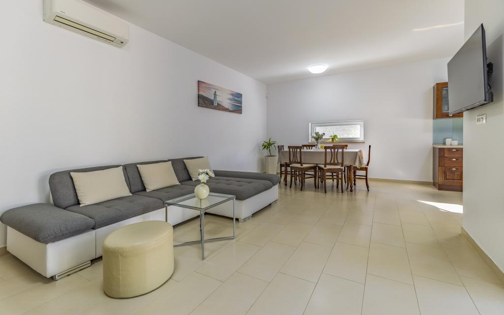 Fuldt møbleret lejlighed (80 m2) i en fremragende beliggenhed i en rolig del af Banjol, kun 5 minutters (300 m) gang fra de smukkeste strande i området. Lejligheden ligger i stueetagen af en boligbygning med kun tre lejligheder. Lejligheden har en privat have (100 m2) med terrasse, bord, liggestole, udendørs bruser og grill, hvilket giver mulighed for behageligt socialt samvær med masser af privatliv og er især velegnet til børnefamilier. Der er en privat parkeringsplads ved siden af bygningen med direkte adgang til haven og terrassen. Haven blev fuldstændig renoveret i 2024. Hele bygningen er beskyttet af et sikkerhedshegn (kortadgang). Lejligheden har 2 soveværelser med dobbeltsenge, 2 badeværelser med toilet og bruser, en rummelig stue med en udtrækkelig sofa, spisestue og køkken. Lejligheden har aircondition og er opvarmet om vinteren (gulvvarme) og har en indendørs pejs, så den også er velegnet til ophold i de koldere efterårs- og vintermåneder. I umiddelbar nærhed af lejligheden er der adskillige barer og restauranter samt dekorerede butikker.