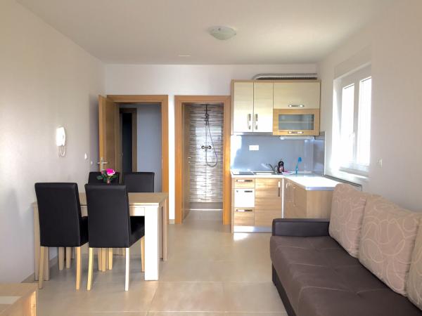 Turistskat er inkluderet i prisen.Den ekstraordinære udsigt fra balkonen er helt sikkert virkeliggørelsen af dine drømme. Gennem glasset på altanens rækværk kan du altid nyde udsigten over Adriaterhavet. Sengene i lejligheden har en behagelig størrelse på 1,60 m bred og 2,00 m lang. Du behøver ikke bekymre dig om sengelinned og håndklæder. Prisen inkluderer en regelmæssig skift af sengelinned og håndklæder. Du kan friske op på badeværelset efter din ferie på havet. Det moderne design af vores badeværelse og badekar vil hjælpe dig med dette. Vi har allerede taget hånd om sengelinned og håndklæder, som vi normalt skifter jævnligt og efter anmodning. I køkkenet kan du vise, at du er en kulinarisk stjerne. Til det tilbyder vi dig tallerkener, gryder og fade. Elkedel, proptrækker, glas, kopper og køleskab med til