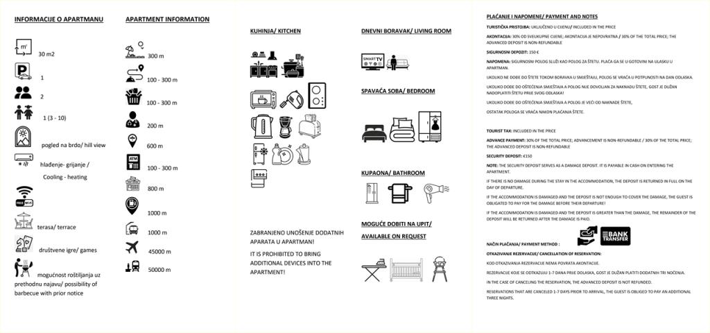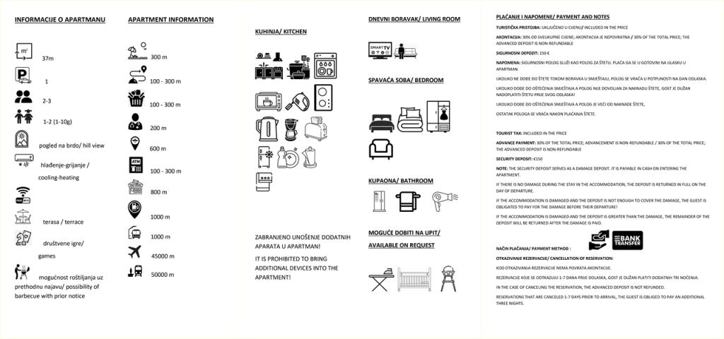 Turistskat er inkluderet i prisen.Forudbetaling er det beløb, som gæsten betaler til ejeren af lejligheden, og det er det beløb, der garanterer gæstens ankomst til ejeren af lejligheden og reservationen af lejligheden til gæsten for en bestemt dato og et bestemt antal personer, og er kompensation i tilfælde af gæstens udeblivelse. Der opkræves et forskud på 30% af den samlede pris, som ikke refunderes. Resten af beløbet betales af gæsten ved ankomst til lejligheden, og efter betaling og indtjekning modtager gæsten en faktura, og dokumenterne returneres. Ved ankomst betaler gæsten et depositum på €150 i tilfælde af skader, som returneres til gæsten på afrejsedagen, hvis gæsten ikke har forårsaget nogen skade. I tilfælde af skade forbliver depositummet hos ejeren af lejligheden for at dække skaden i størrelsesordenen. Hvis skadesbeløbet er større end depositummet, er gæsten forpligtet til at betale med det samme. Hvis gæsten beslutter at afslutte sit ophold før tid, er gæsten forpligtet til at betale det fulde beløb. I tilfælde af overtrædelse af husreglerne har bureauet eller ejeren af lejligheden ret til at annullere reservationen, og beløbet fra den næste dag og indtil opholdets afslutning refunderes.