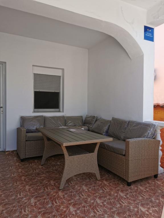 Studiolejlighed med terrasse. Overnatning til 2plus1 personer, badeværelse, køkken, parkering. Tæt på stranden (anden række fra havet), tæt på byens strand (100m) og tæt på centrum af Bibinje med restauranter, caféer.