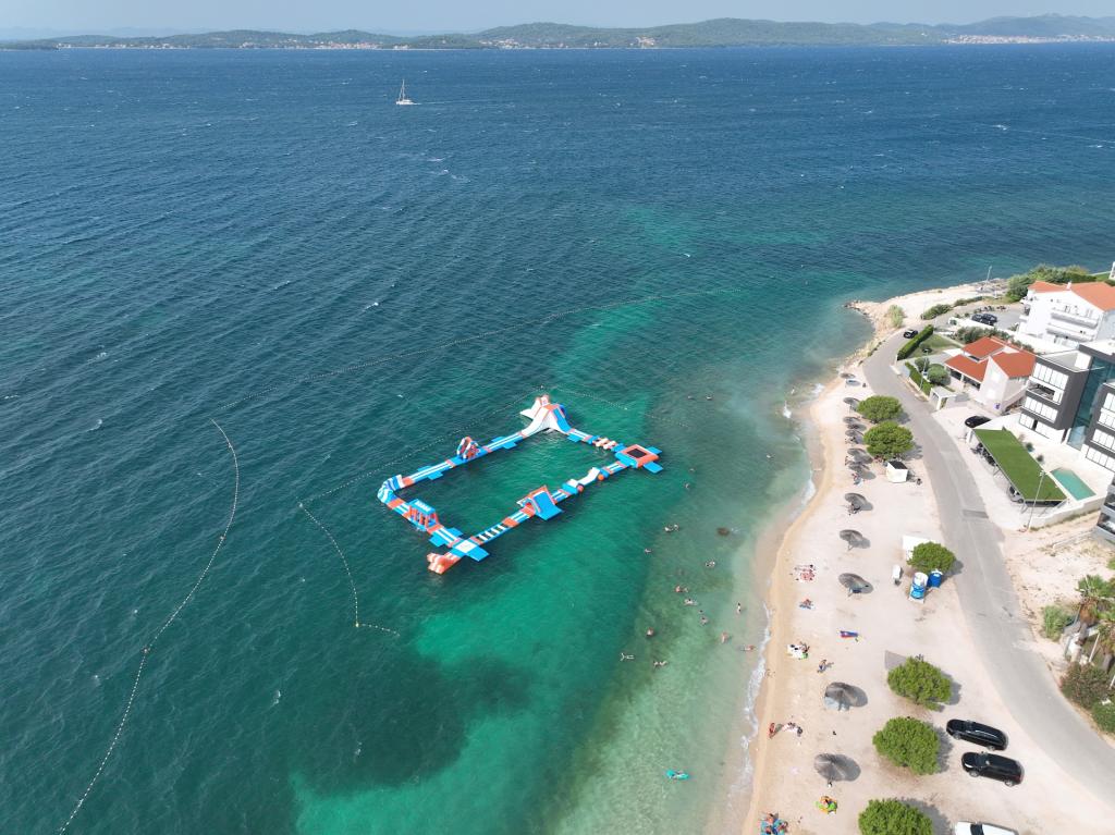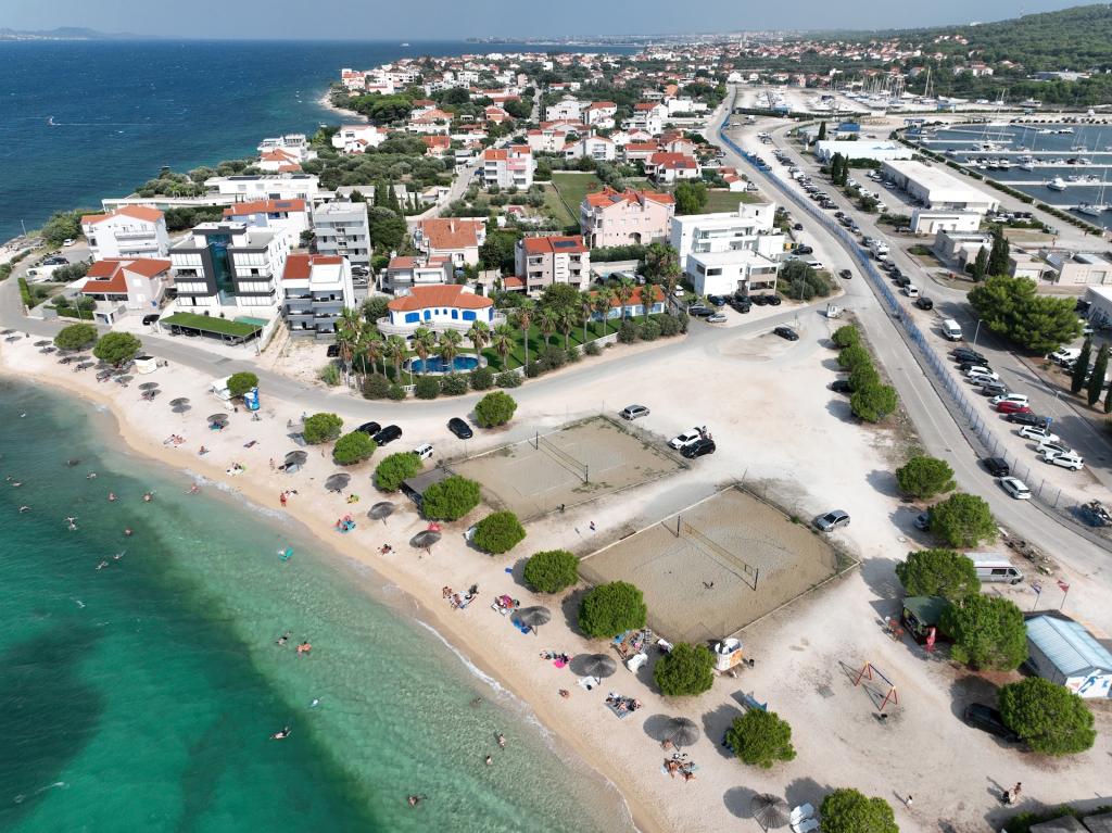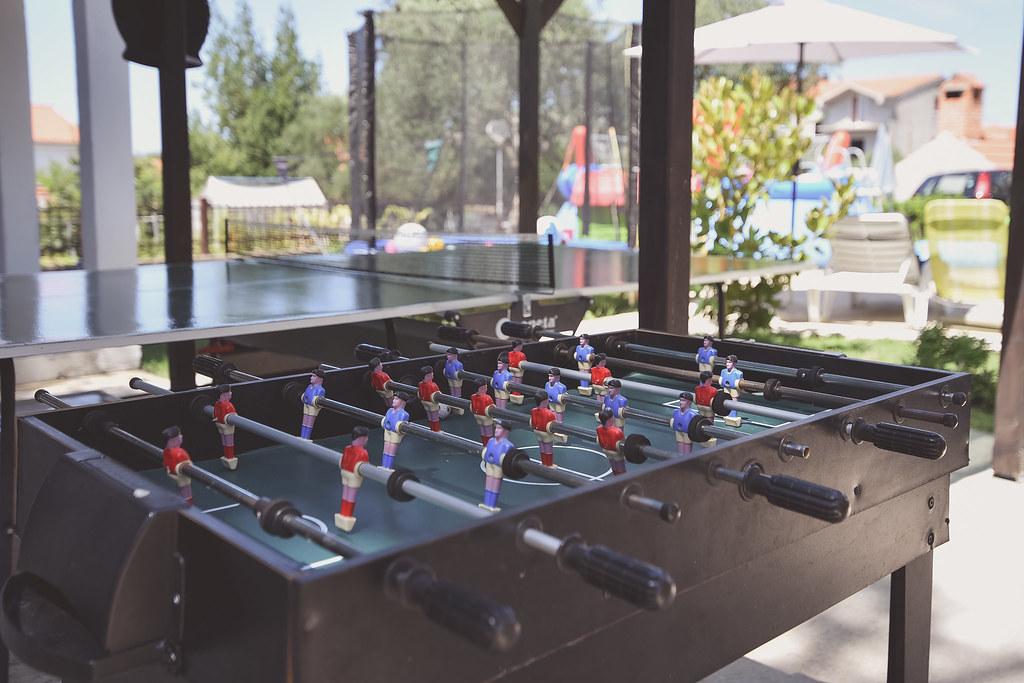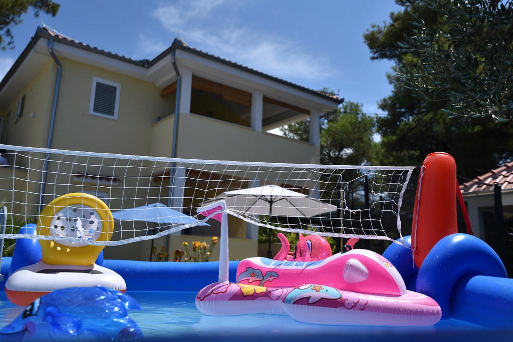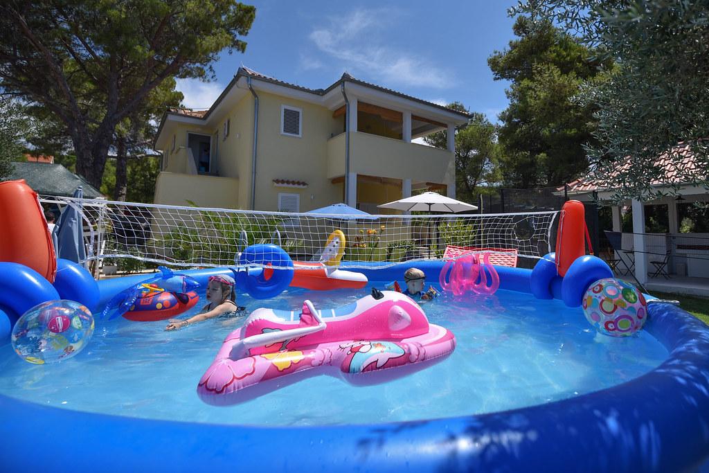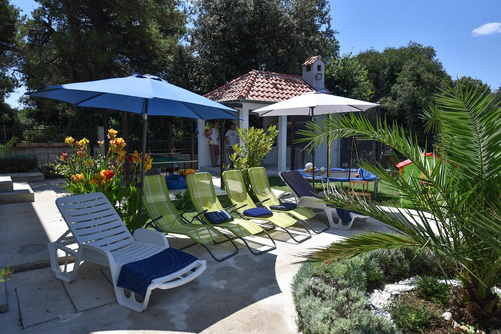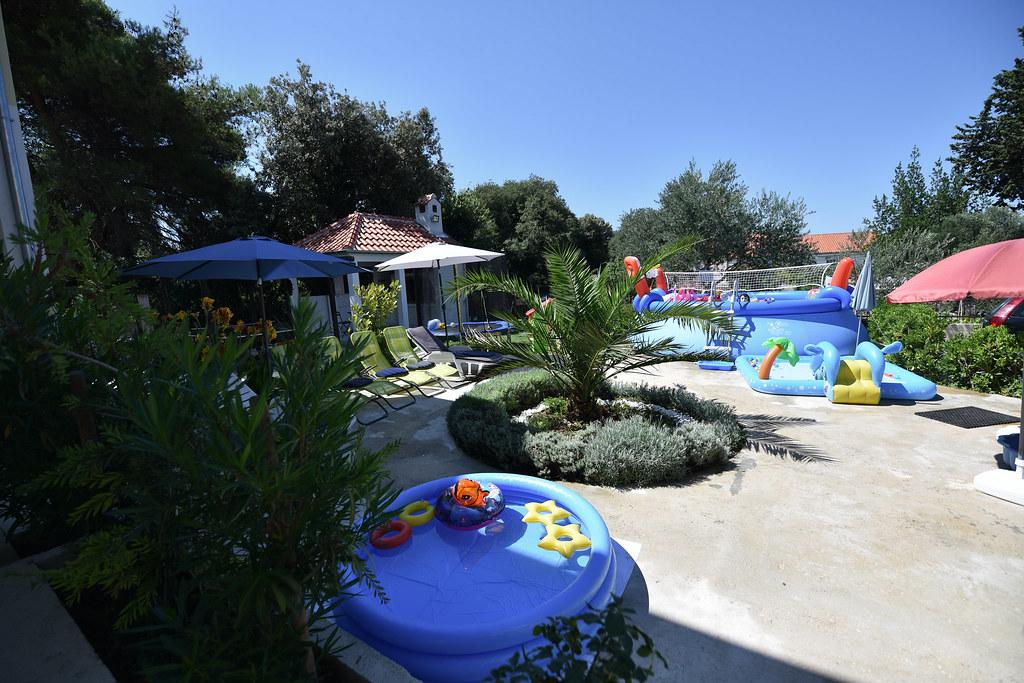 Vores gæster kan frit bruge haven og gårdhaven. Du kan bruge alt, hvad du finder i haven, gratis. Den deles af alle, der bor i vores hus. Du kan finde en swimmingpool, cykler (til børn og voksne, med høje stole), en grill med grill (sac, saće, čripnja), en ismaskine, en frituregryde, 2 køleskabe, en vask, et bærbart elektrisk komfur, træningsudstyr, liggestole med parasoller, et solcellebruser, en havegynge til 4 personer og flere pools (fra den mindste til babyer til den største), børneborde i træ og plastik, et legehus med rutsjebane, stige og gynge, en sandkasse, dart, bordtennis, en trampolin, badminton, en børnegynge og meget andet børnelegetøj.