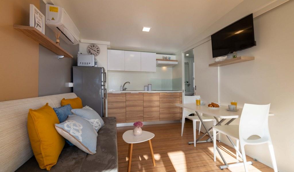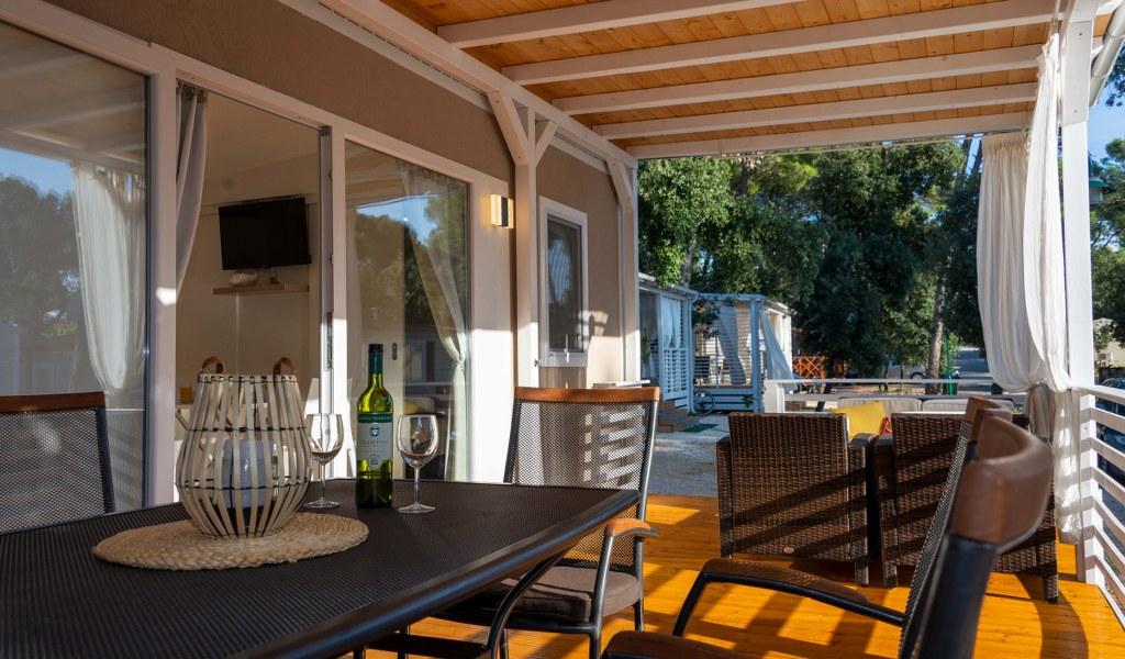 Nyt, moderne og fuldt udstyret mobilhome med to værelser, stue med sovesofa (135x180cm), fuldt udstyret køkken med satellit-tv, aircondition, WIFI, mikroovn, el. grill, små husholdningsapparater osv., to badeværelser og en stor terrasse 7, 5 x 3 meter, ligger i fyrreskoven på campingpladsen Soline i Biograd na moru. Huset ligger 250 meter fra stranden, café, restaurant, og der er en legeplads, vask og tørremaskiner, en hæveautomat, en butik, et bageri og alt hvad du har brug for et behageligt ophold! I nærheden af lejren, ca. 1500 meter væk, ligger centrum af Biograd med forskellige faciliteter samt marinaen Kornati!
