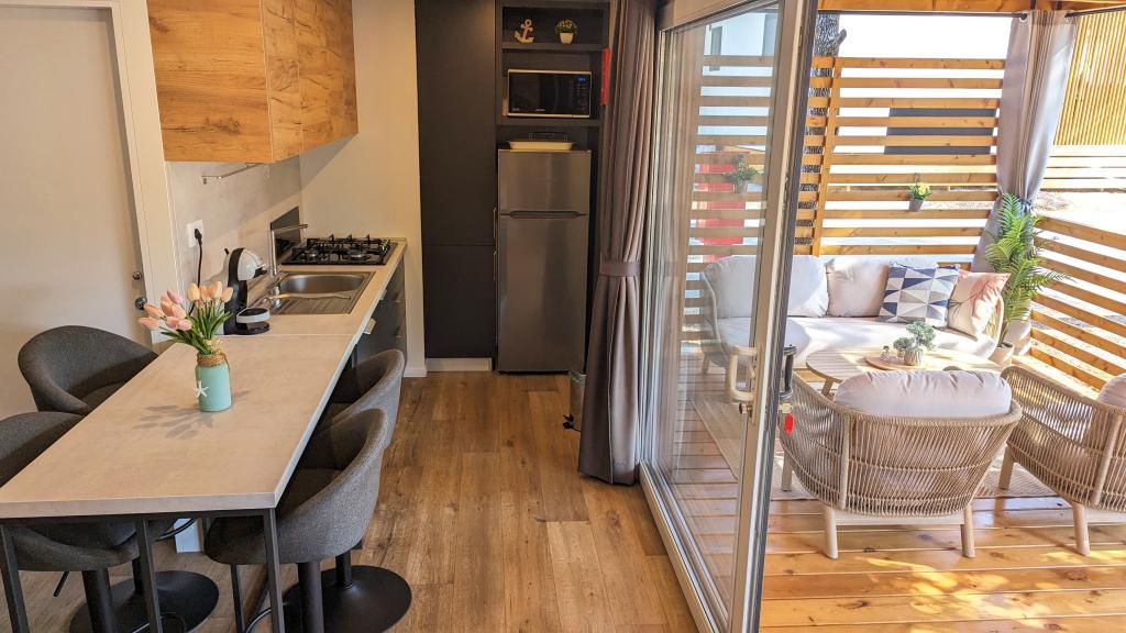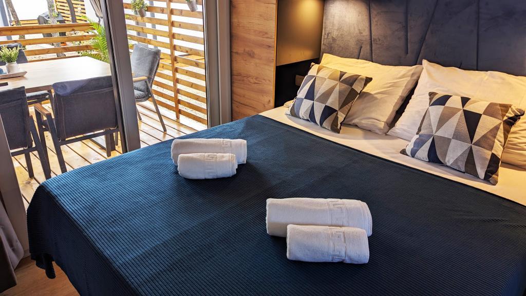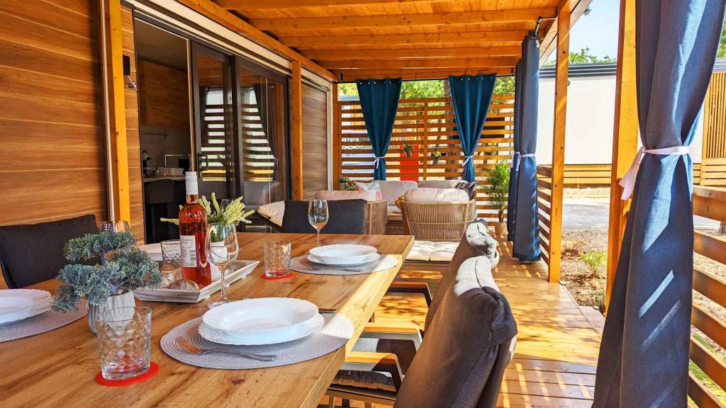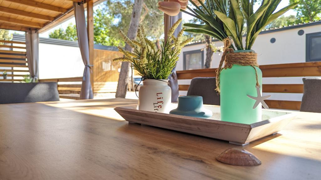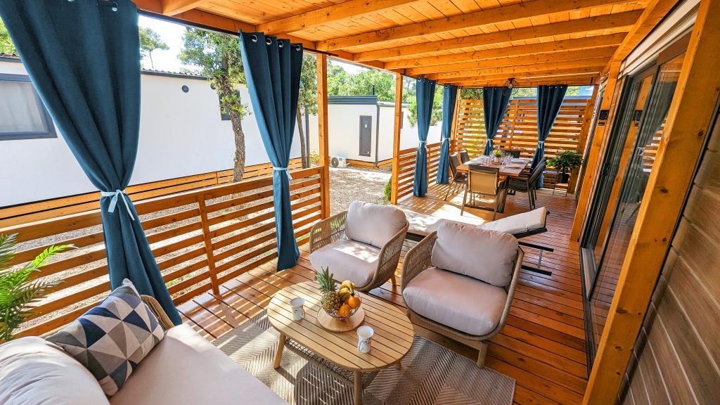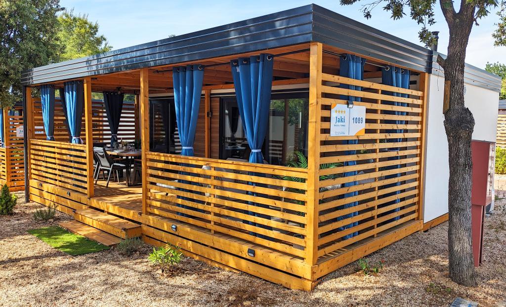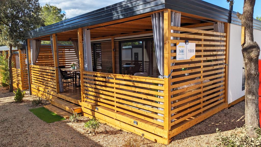 Nyd naturen og komforten: Jaki mobilhomes på Soline Campsite, Biograd na Moru. Beliggende i en rolig del af den 4-stjernede campingplads, omgivet af fyrreskove, er vores moderne udstyrede mobilhomes ideelle til op til 6 personer. Nyd nærheden til stranden (2-5 minutters gang), butikker og restauranter samt promenaden, der fører til byens centrum (15 minutter). Disse huse tilbyder 2 soveværelser og 2 badeværelser, en stue, en stor terrasse med spisebord og opholdsområde samt et fuldt udstyret køkken - opvaskemaskine, mikrobølgeovn, kaffemaskine, brødrister, blender, udendørs grill. Huset inkluderer også gratis WiFi, gratis parkering lige ved siden af huset, Smart TV, aircondition, håndklæder og sengelinned. Campingpladsen tilbyder mange faciliteter for hele familien: smukke sand- og stenstrande, der strækker sig hele vejen til byens centrum, en restaurant med middelhavsspecialiteter, en legeplads, sportsaktiviteter og cykeludlejning. Dalmaland, Kroatiens største temavandland, ligger 15 minutters kørsel væk.