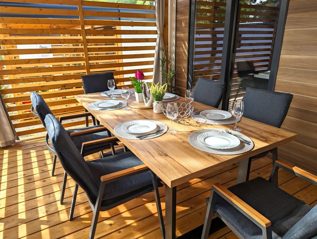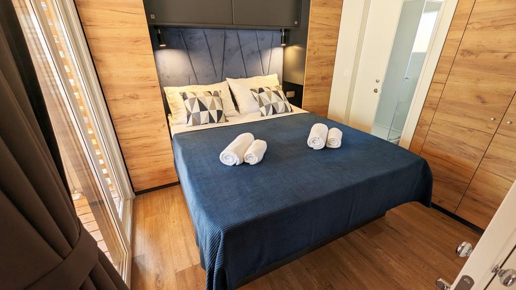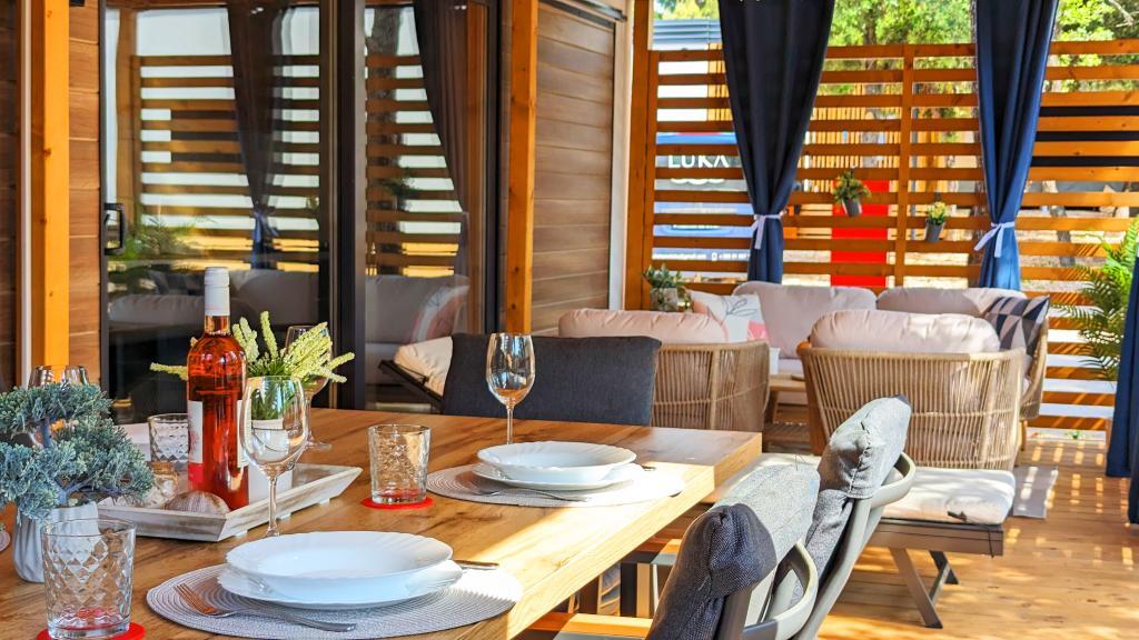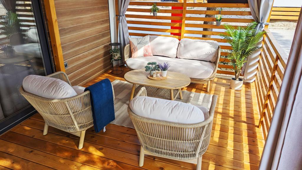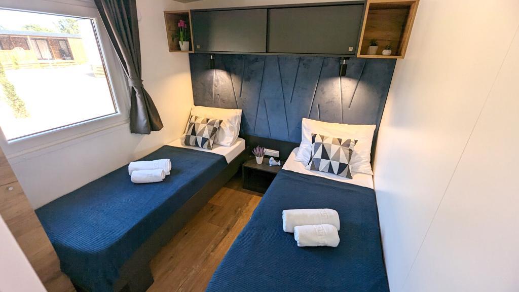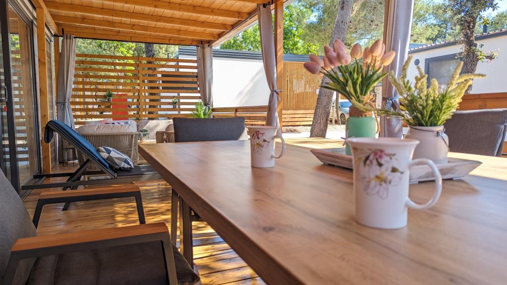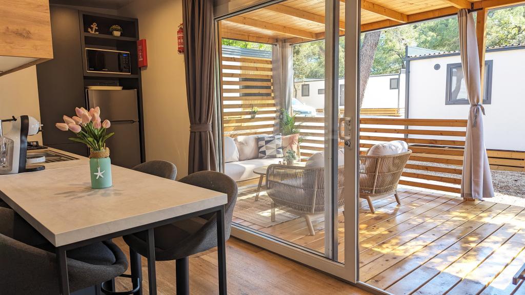 Nyd naturen og komforten: Jaki mobilhomes på Soline Campsite, Biograd na Moru. Beliggende i en rolig del af den 4-stjernede campingplads, omgivet af fyrreskove, er vores moderne udstyrede mobilhomes ideelle til op til 6 personer. Nyd nærheden til stranden (2-5 minutters gang), butikker og restauranter samt promenaden, der fører til byens centrum (15 minutter). Disse huse tilbyder 2 soveværelser og 2 badeværelser, en stue, en stor terrasse med spisebord og opholdsområde samt et fuldt udstyret køkken - opvaskemaskine, mikrobølgeovn, kaffemaskine, brødrister, blender, udendørs grill. Huset inkluderer også gratis WiFi, gratis parkering lige ved siden af huset, Smart TV, aircondition, håndklæder og sengelinned. Campingpladsen tilbyder mange faciliteter for hele familien: smukke sand- og stenstrande, der strækker sig hele vejen til byens centrum, en restaurant med middelhavsspecialiteter, en legeplads, sportsaktiviteter og cykeludlejning. Dalmaland, Kroatiens største temavandland, ligger 15 minutters kørsel væk.