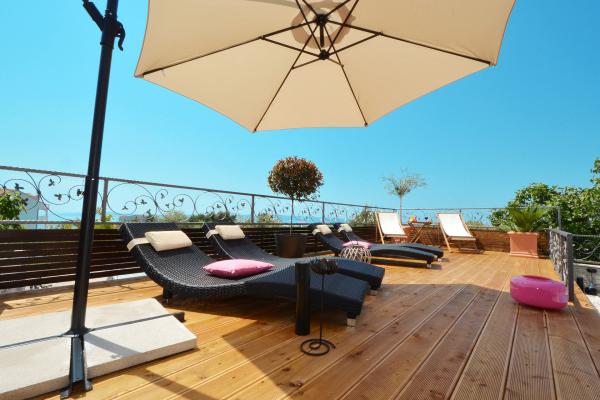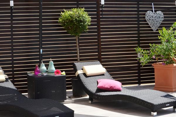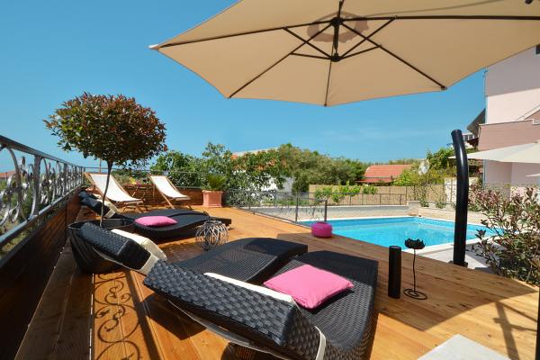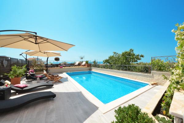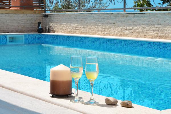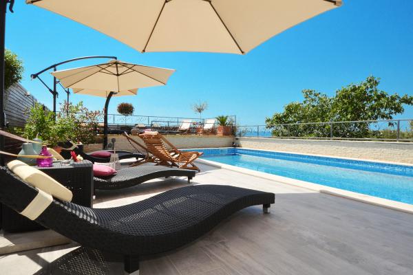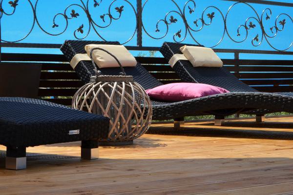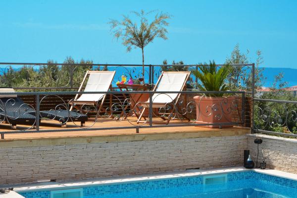 Foran huset er der en 35m2 stor hydro-massage pool udstyret med liggestole, gynger, bord og stole og en grill.
