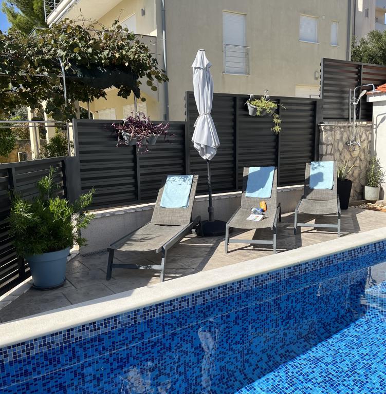 Vi boede i en lejlighed i en uge, to voksne og tre børn. Vi elskede stedet! Fantastisk lejlighed, ren og frisk. Balkonen og udsigten var fantastisk! Vi brugte poolen dagligt og var mere end tilfredse. Vi grillede også nede ved poolen et par aftener, og børnene syntes, det var hyggeligere end en restaurant. Beliggenheden er fantastisk! Der er flere forskellige muligheder for at svømme, enten på stranden eller på klipperne. Vores yngste er fire år gammel, og det var ikke noget problem for ham at gå til de forskellige steder. Det var lidt ind til "centrum" og et større købmandsforretning, men intet der føltes som et besvær uden en rimelig udflugt. Vi tog nemt med Uber til blandt andet Trogir. Darko er en vidunderlig vært, der kom med mange forskellige tips, og man kunne altid få fat i ham. Han var meget bekymret for vores velbefindende! Vi kommer tilbage.