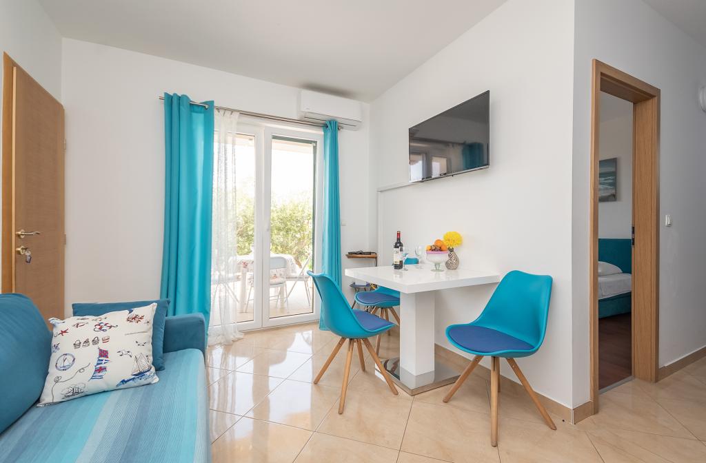 Lejligheder Rejo ligger i den lille by Dugi Rat, på Riviera of Omis, i et roligt miljø med smuk panoramaudsigt over havet og øen Brac. Fra midten af stedet er vi omkring 400m væk, og alle turistfaciliteter er placeret i bizini. Vi har 2 lejligheder til leje. Hver lejlighed er egnet til højst 4 personer, der er mest velegnet til 2 voksne og 2 børn. Begge lejligheder er beliggende på første sal. Hver lejlighed har 1 soveværelse med en stor dobbeltseng, en stue med en sovesofa til 2 personer, et køkken, et badeværelse, en balkon med havudsigt og en terrasse på nordsiden af huset.