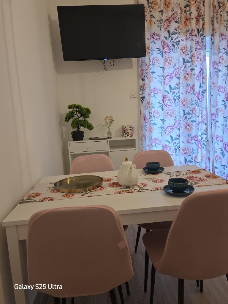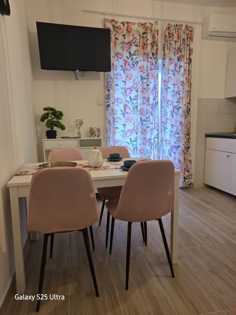Vi boede i Ariana-lejligheden på anden sal. Det er ret rummeligt og udstyret med alt hvad du behøver, selv en vaskemaskine. Begge værelser har aircondition, hvilket gav os privatliv, fordi vi ikke behøvede at holde værelsesdøren åben. Altanen har en smuk udsigt over havet og bjerget, den er stor nok til at spise middag på den, den vender ud mod den stille side, hvor ingen biler kører forbi. Parkering er sikker i husets gård. Vi kommer gerne igen.