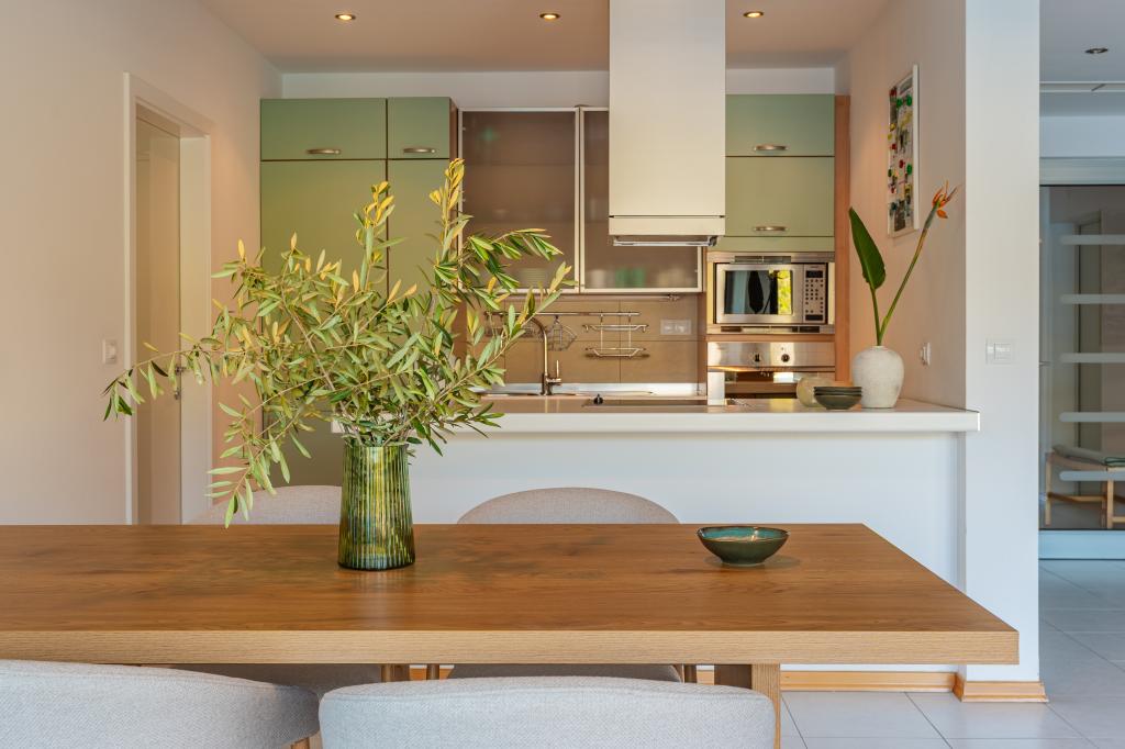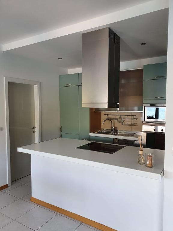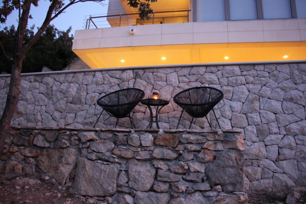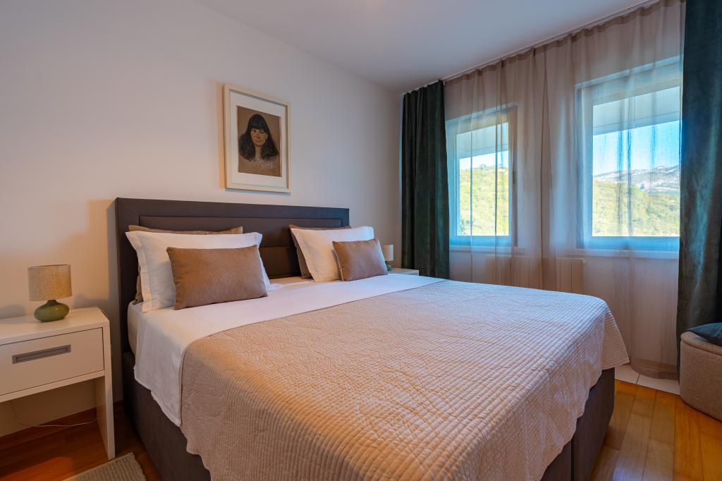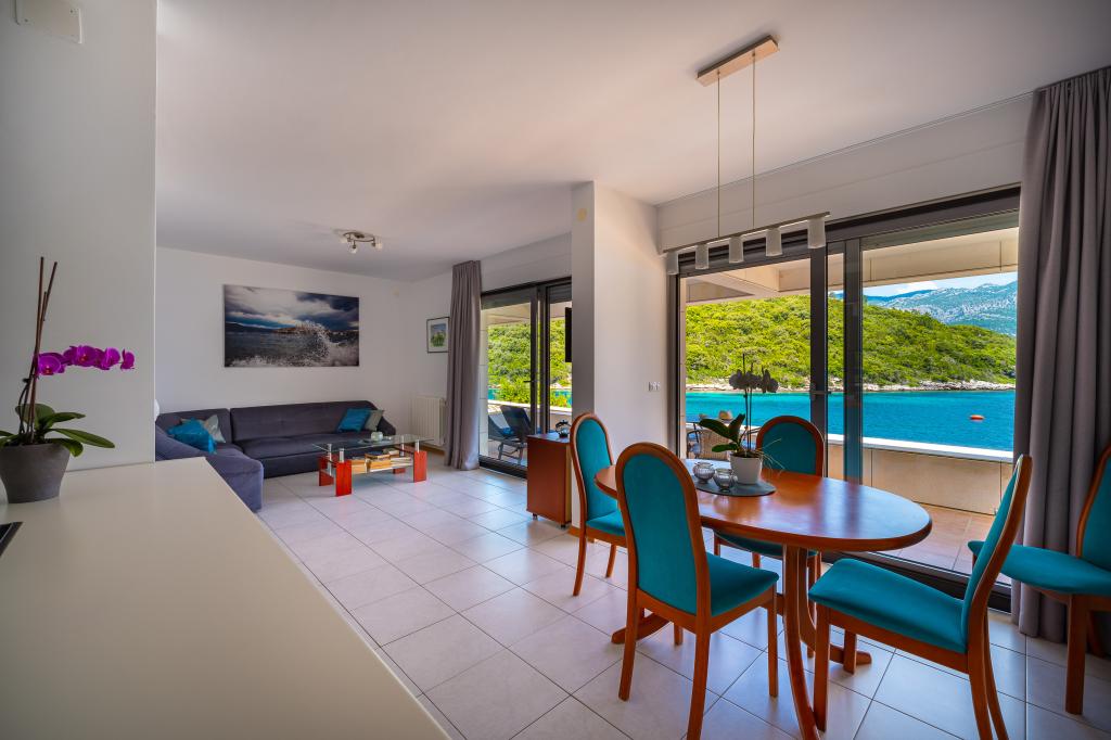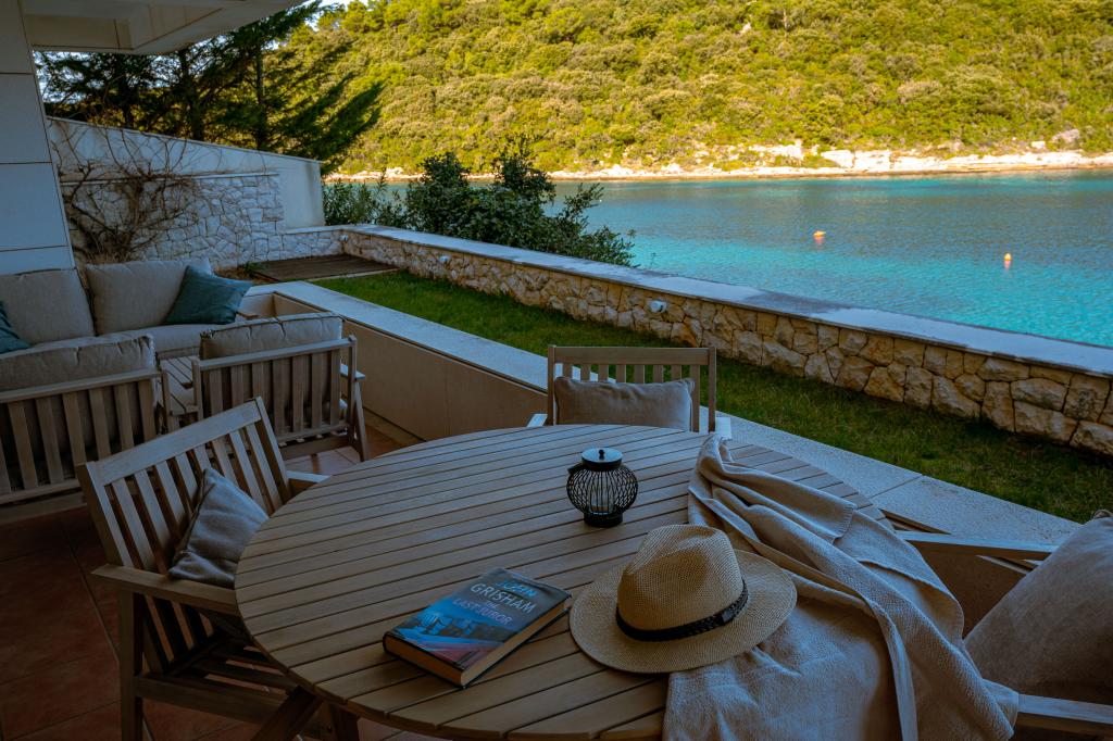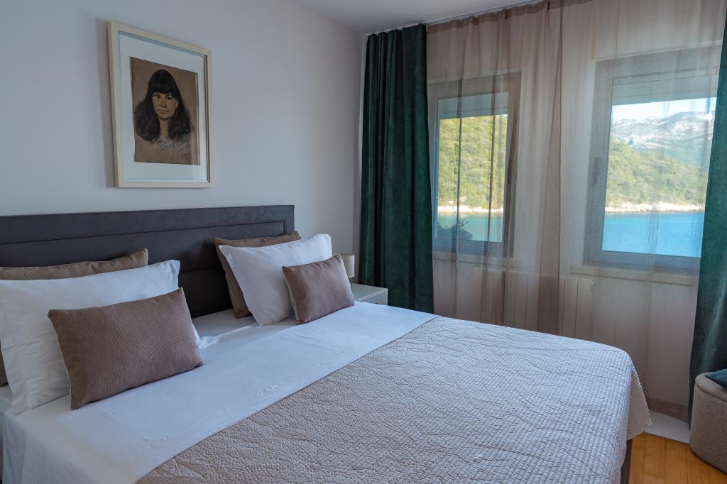 Villa Avantgarde - lejlighed direkte ved havet til 4 personer - meget stille bugt - øen Korčula - Kroatien Det er værket af en berømt kroatisk og verdenskendt arkitekt. Det ligger i en rolig bugt, ca. 4 km fra byens centrum. I villaen råder du over en komfortabel lejlighed på ca. 100 m2, som består af 2 soveværelser, badeværelse, samt stue med veludstyret køkken, spisestue og stue, hvorfra der er udgang til rummelig terrasse med direkte udgang til privat strand. Stranden ligger 9 m fra lejligheden. Der er kun én lejlighed til leje i Villaen. Det er omgivet af velplejede græsplæner, grønne områder, fuglesang og havet. Lukket privat parkering er tilgængelig for gæster. Soveværelset, stuen, spisestuen og terrassen vender direkte mod havet. Den kan bruges hele året, da den er udstyret med centralvarme.
