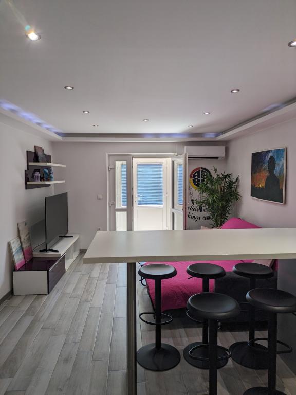 Velkommen til vores moderne, nyindrettede og centralt beliggende lejlighed i hjertet af Makarska på den ældste gade Kalalarga, lige ved siden af hovedtorvet. Lejligheden har to soveværelser, to badeværelser, to airconditionanlæg, et 160 cm tv, Netflix, opvaskemaskine, vaskemaskine, et fuldt udstyret køkken og en opholdsstue med store vinduer. Lejligheden ligger i stueetagen og har to separate indgange. Helt adskilt fra resten af huset. Fuldstændig privatliv.