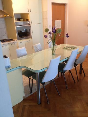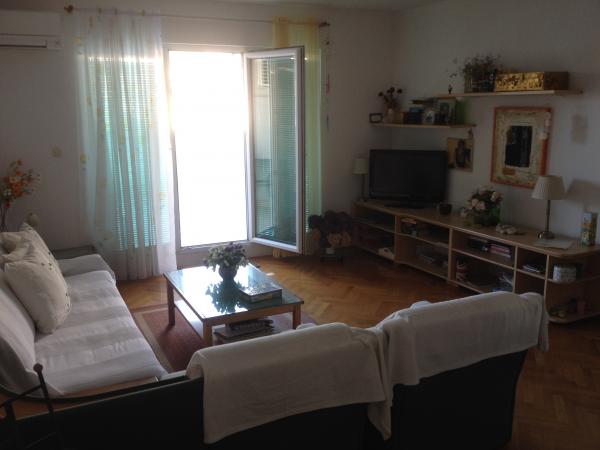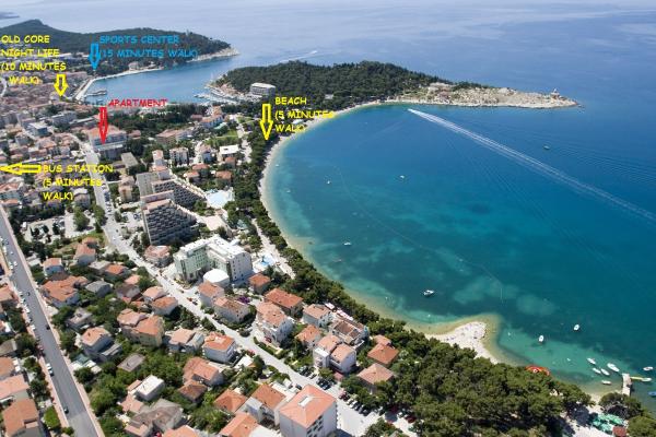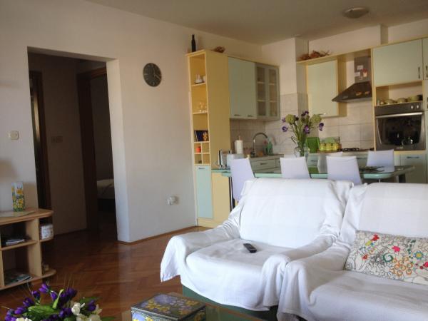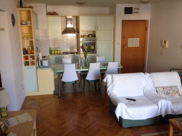 Lejligheden er beliggende i centrum af Makarska. Det er 5 minutters gang fra busstationen og 5 minutters gang fra stranden. Lejligheden er beliggende på første sal, mens stueetagen er der en stor kolonialvarer. Det tager dig 10 minutter at nå den gamle bydel i Makarska. Sportscenter er kun 15 minutters gang fra lejligheden. Diskoteker for underholdning er inden for 15 minutters gang fra lejligheden. Lejligheden er smukt indrettet og inden det er der to soveværelser, badeværelse, stue, stor terrasse, køkken og spisestue.