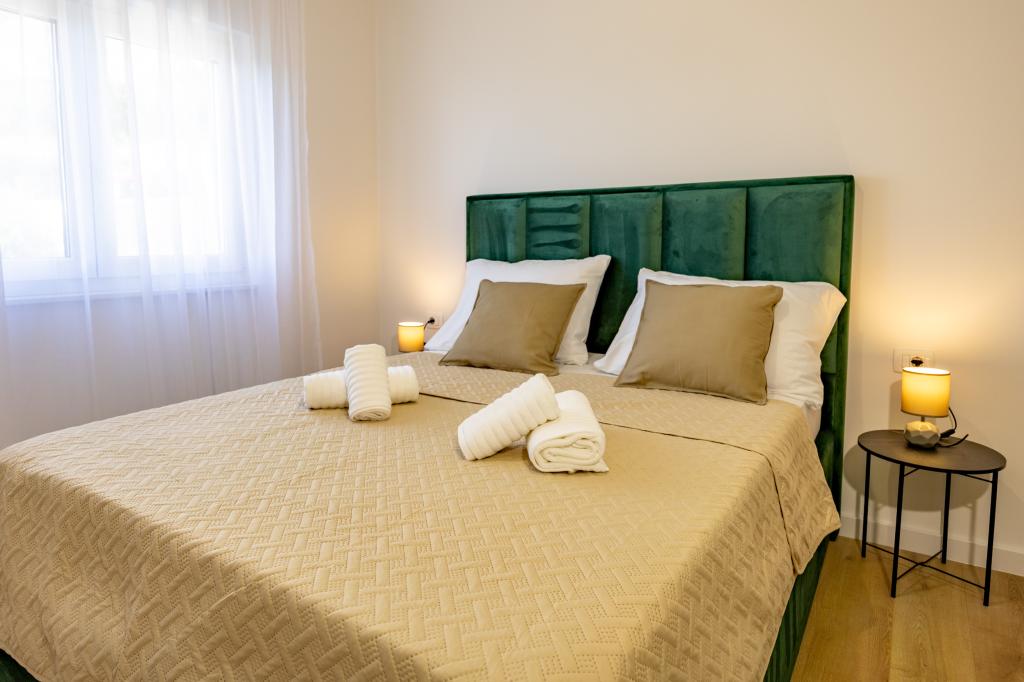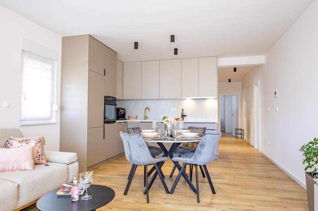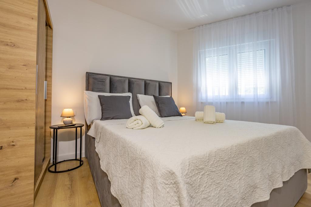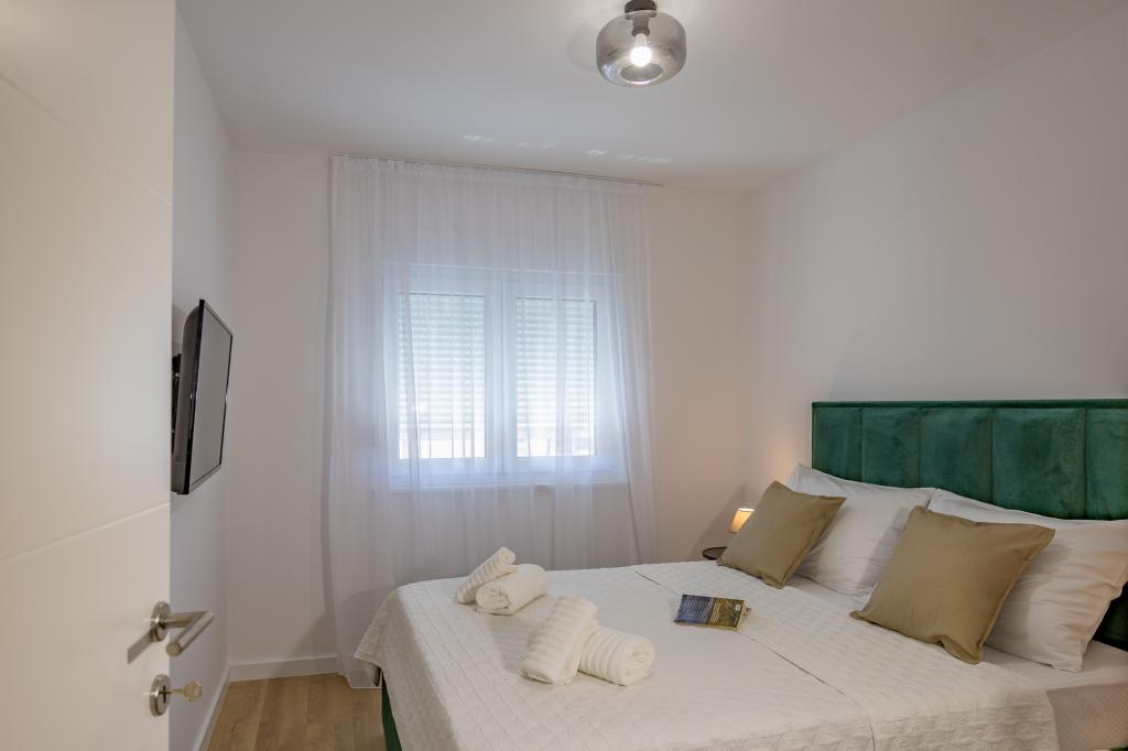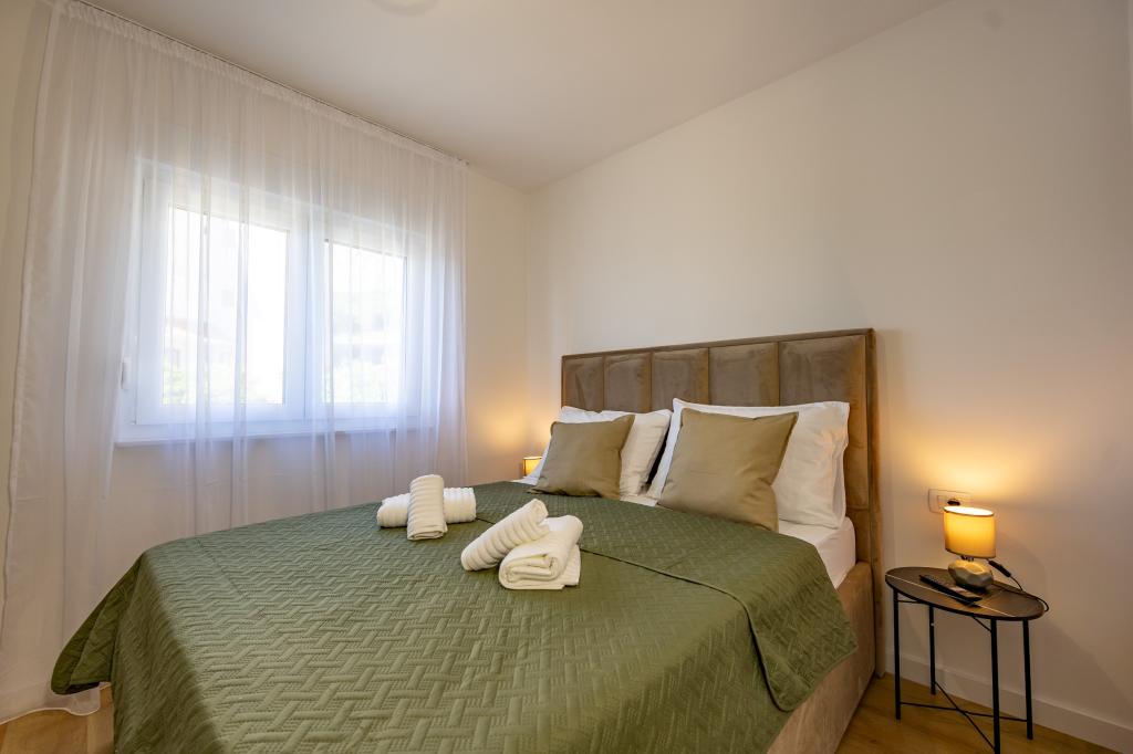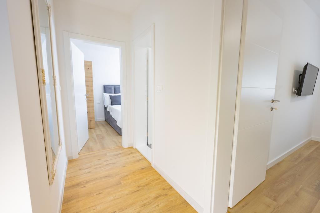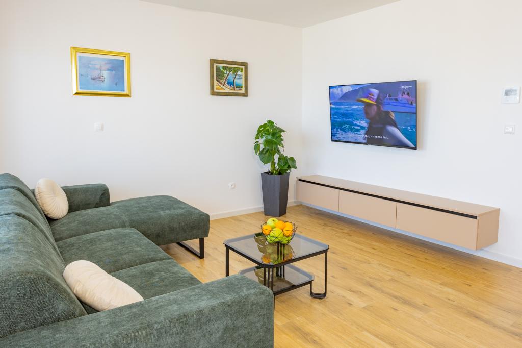 Hver lejlighed udstråler moderne design og nyrenoveret interiør. I den rummelige stue, der er indrettet med smagfulde møbler og moderne detaljer, vil du føle dig hjemme. Det åbne koncept forbinder naturligt stuen med et fuldt udstyret køkken, hvor elegante bordplader, kvalitetsapparater og al den plads, du har brug for til at tilberede dine yndlingsmåltider, venter på dig. Opholdsstuen åbner ud til en behagelig balkon - et ideelt sted til morgenkaffe eller aftenafslapning med et glas vin og en uforglemmelig solnedgang over Adriaterhavet. Hver lejlighed har to komfortable soveværelser med dobbeltsenge, udstyret med blødt sengetøj og masser af opbevaringsplads, et moderne badeværelse og et ekstra toilet. Lejlighederne har aircondition og er fuldt udstyrede: TV/SAT, internet, vaskemaskine, opvaskemaskine, kaffemaskine og alt hvad du behøver for et behageligt og ubekymret ophold.