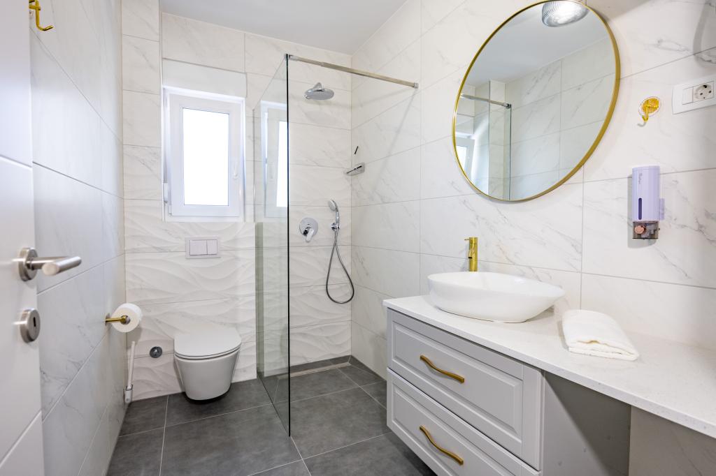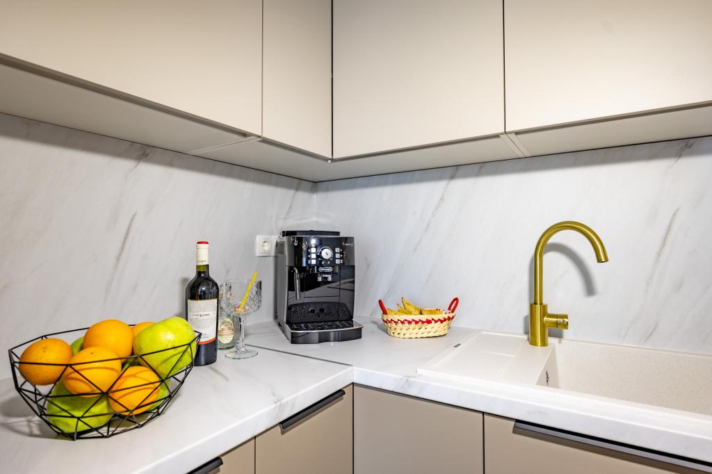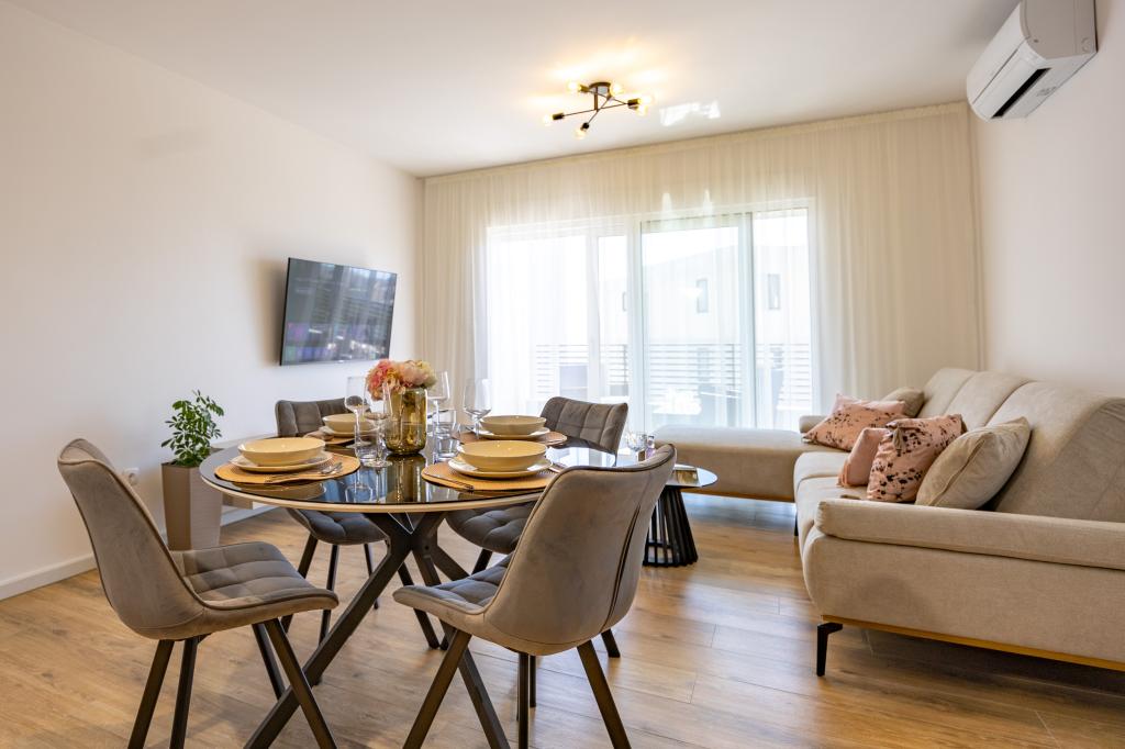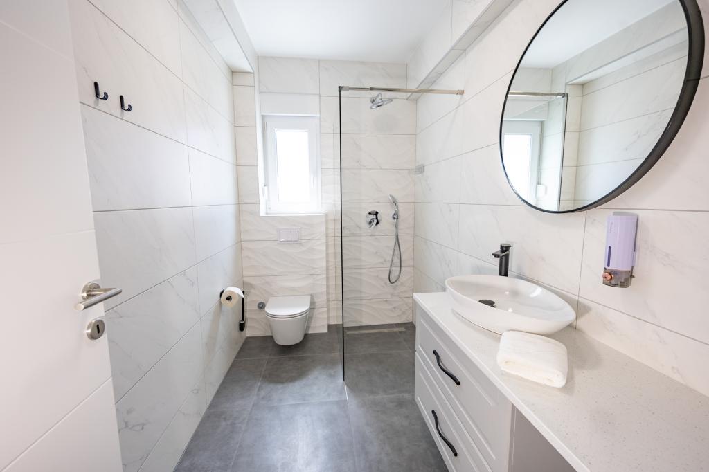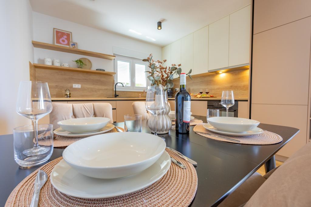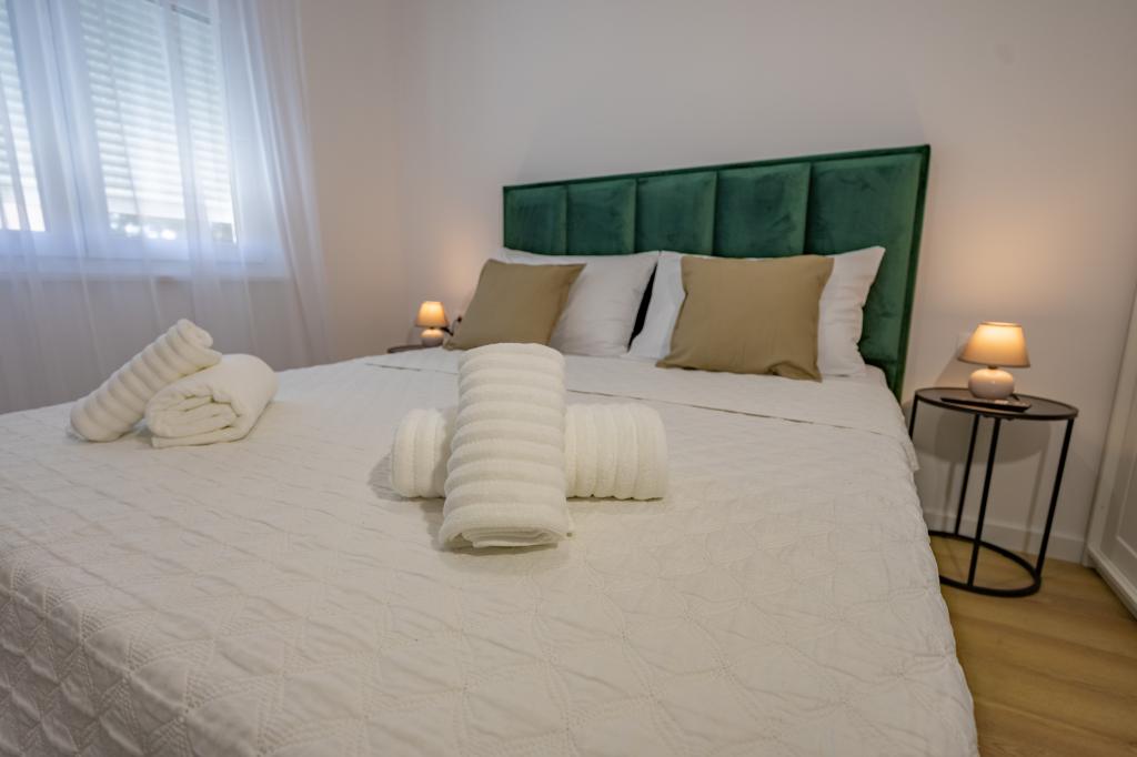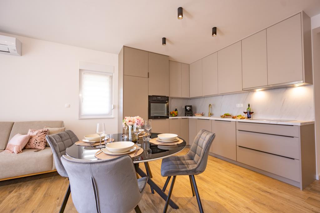 Hver lejlighed udstråler moderne design og nyrenoveret interiør. I den rummelige stue, der er indrettet med smagfulde møbler og moderne detaljer, vil du føle dig hjemme. Det åbne koncept forbinder naturligt stuen med et fuldt udstyret køkken, hvor elegante bordplader, kvalitetsapparater og al den plads, du har brug for til at tilberede dine yndlingsmåltider, venter på dig. Opholdsstuen åbner ud til en behagelig balkon - et ideelt sted til morgenkaffe eller aftenafslapning med et glas vin og en uforglemmelig solnedgang over Adriaterhavet. Hver lejlighed har to komfortable soveværelser med dobbeltsenge, udstyret med blødt sengetøj og masser af opbevaringsplads, et moderne badeværelse og et ekstra toilet. Lejlighederne har aircondition og er fuldt udstyrede: TV/SAT, internet, vaskemaskine, opvaskemaskine, kaffemaskine og alt hvad du behøver for et behageligt og ubekymret ophold.