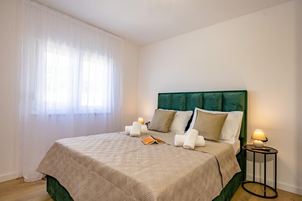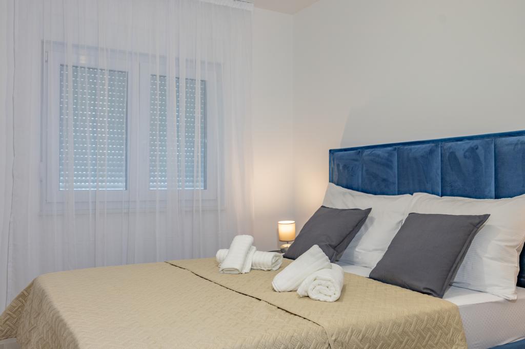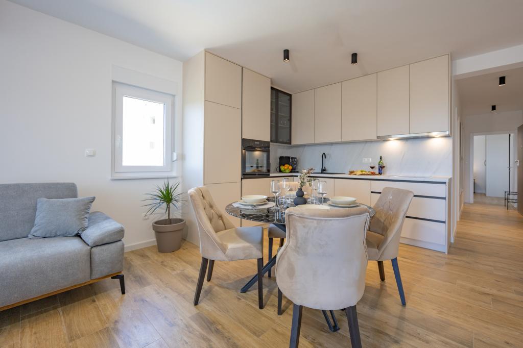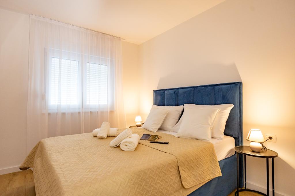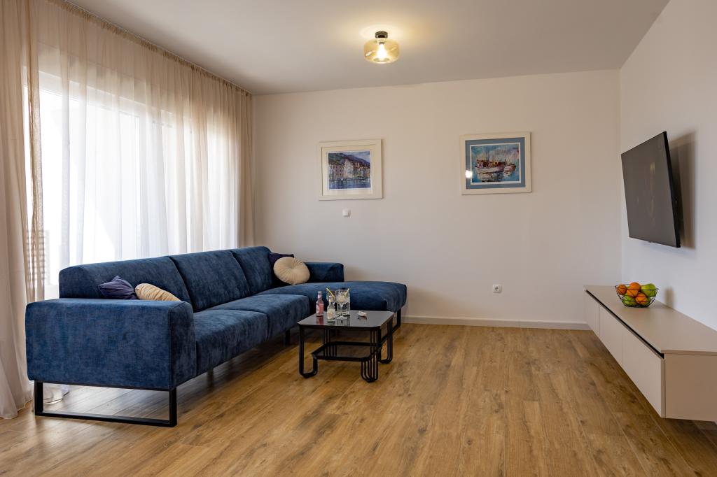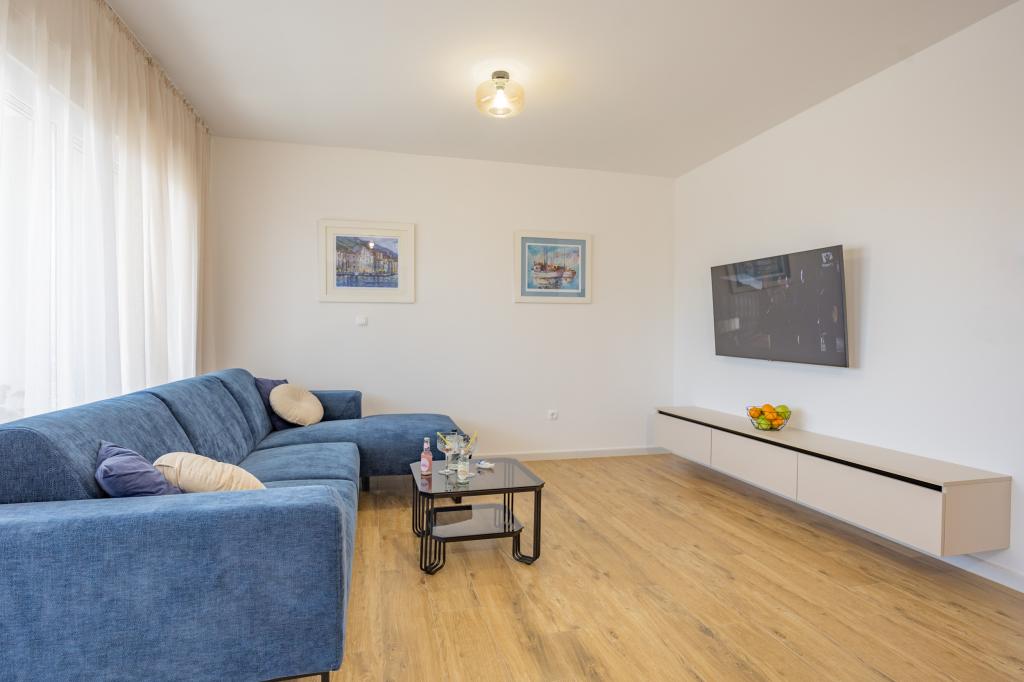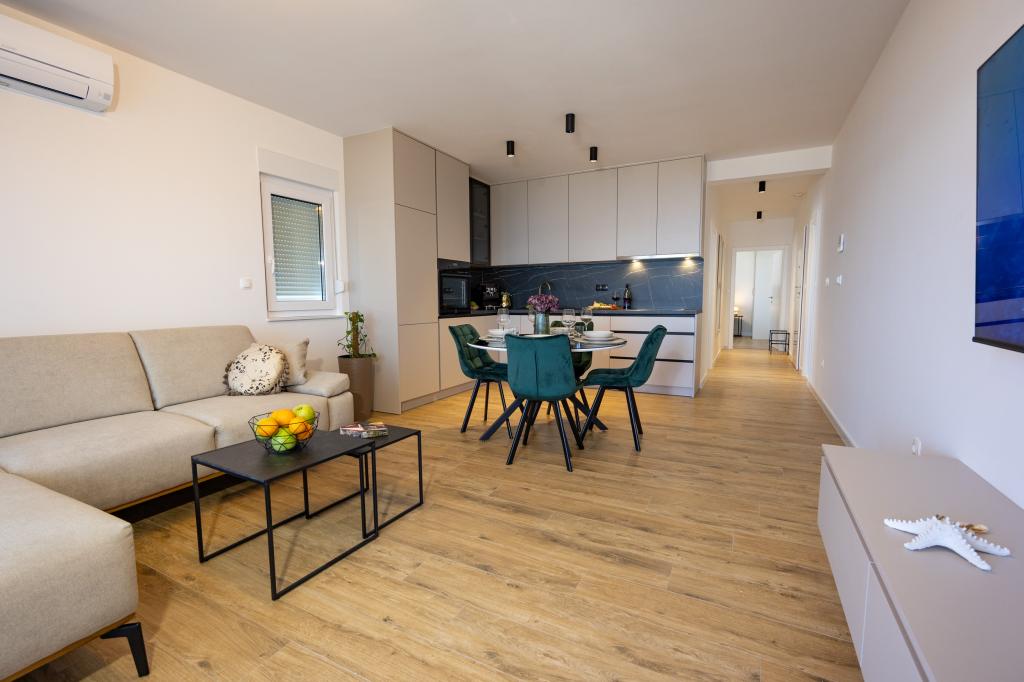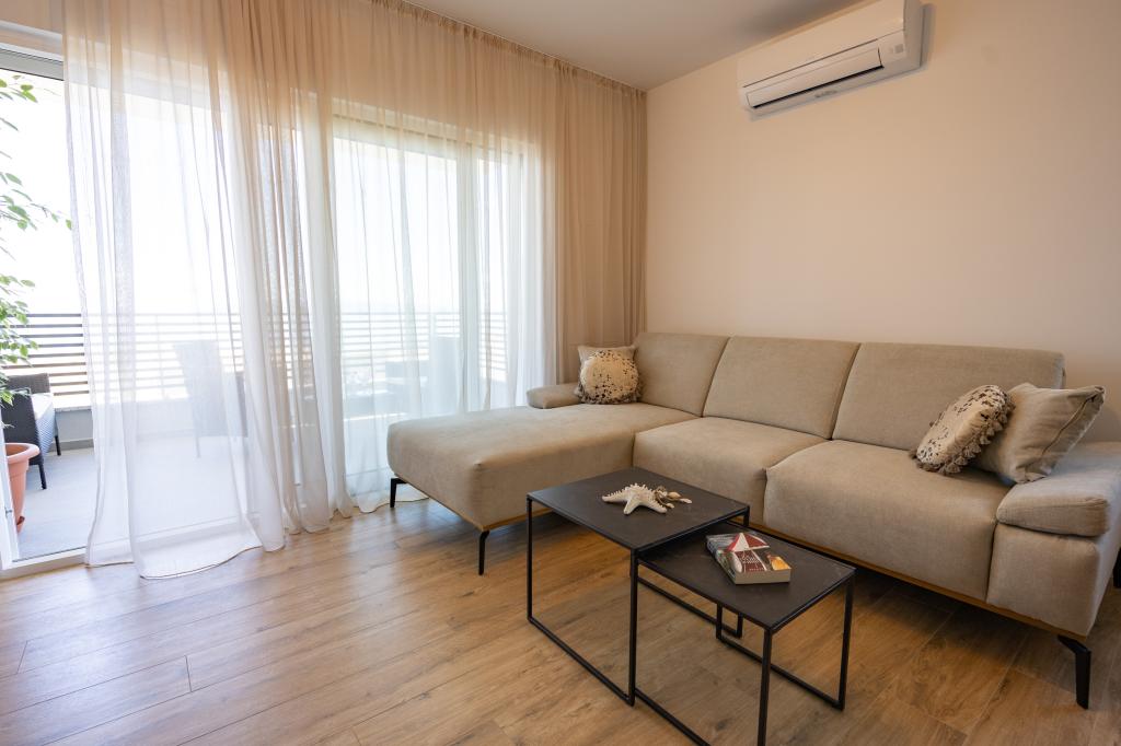Hver lejlighed udstråler moderne design og nyrenoveret interiør. I den rummelige stue, der er indrettet med smagfulde møbler og moderne detaljer, vil du føle dig hjemme. Det åbne koncept forbinder naturligt stuen med et fuldt udstyret køkken, hvor elegante bordplader, kvalitetsapparater og al den plads, du har brug for til at tilberede dine yndlingsmåltider, venter på dig. Opholdsstuen åbner ud til en behagelig balkon - et ideelt sted til morgenkaffe eller aftenafslapning med et glas vin og en uforglemmelig solnedgang over Adriaterhavet. Hver lejlighed har to komfortable soveværelser med dobbeltsenge, udstyret med blødt sengetøj og masser af opbevaringsplads, et moderne badeværelse og et ekstra toilet. Lejlighederne har aircondition og er fuldt udstyrede: TV/SAT, internet, vaskemaskine, opvaskemaskine, kaffemaskine og alt hvad du behøver for et behageligt og ubekymret ophold.
