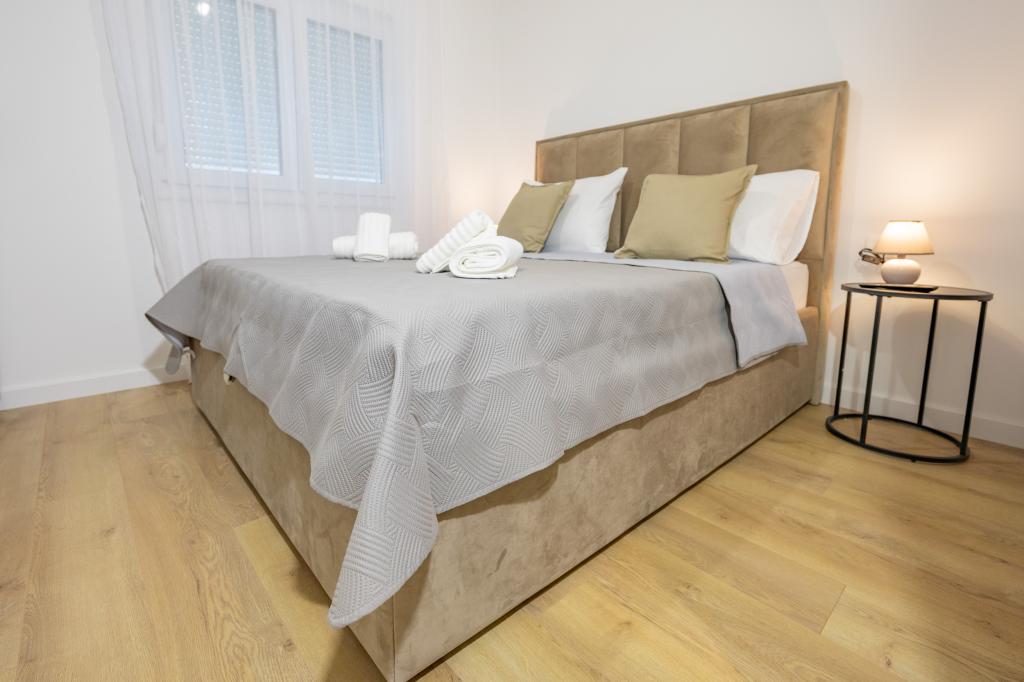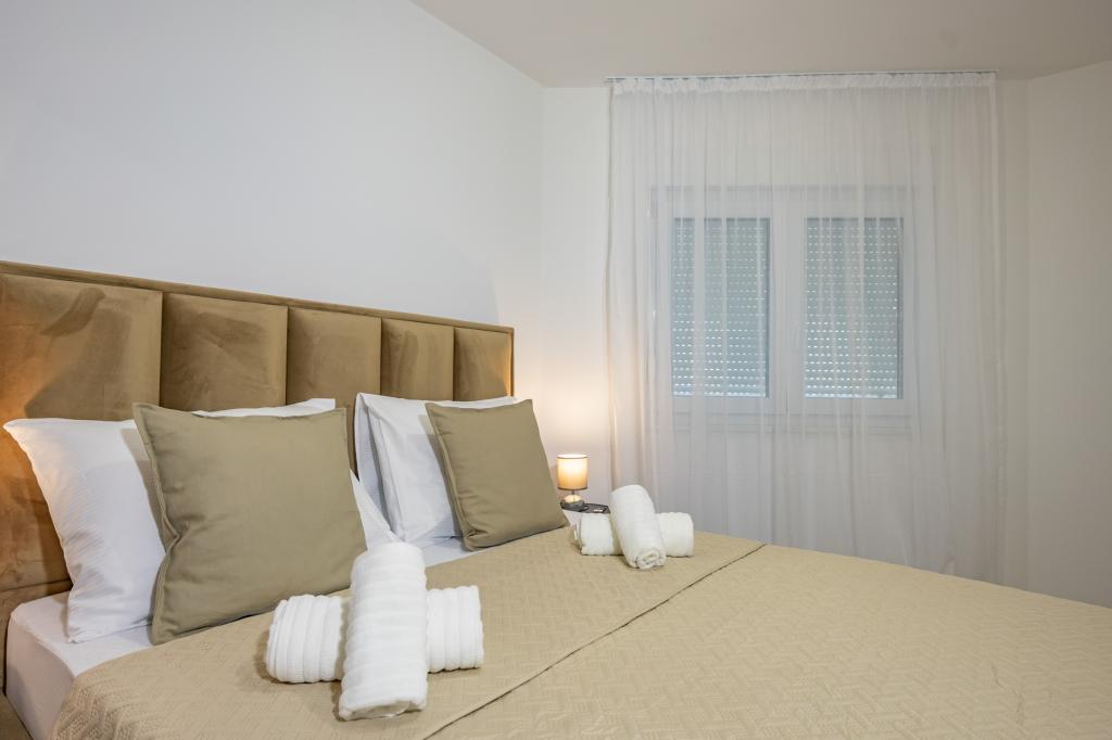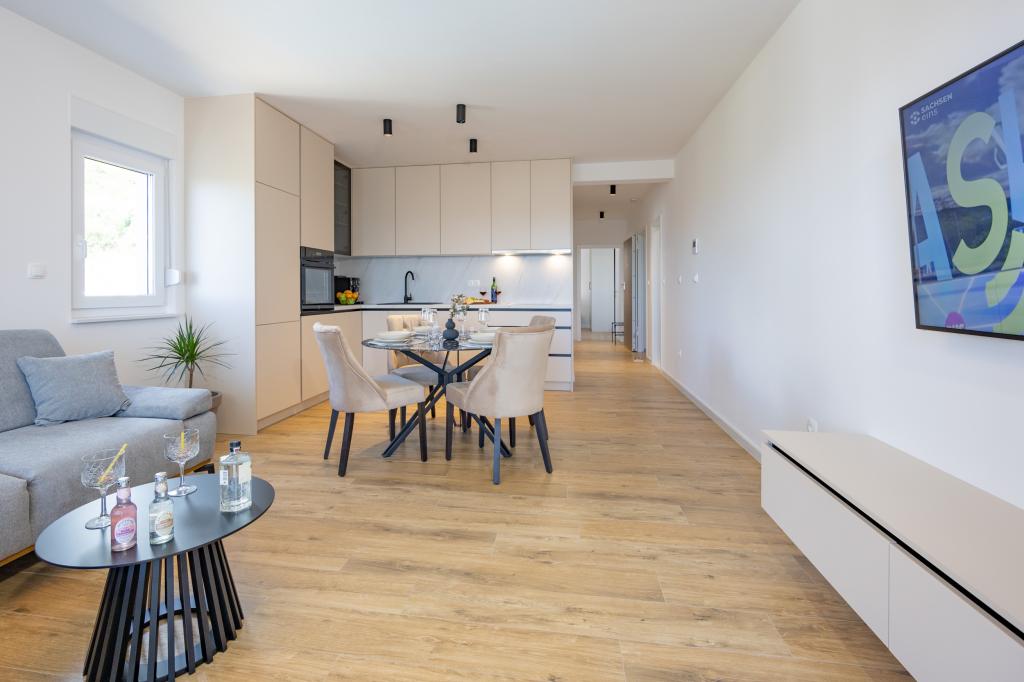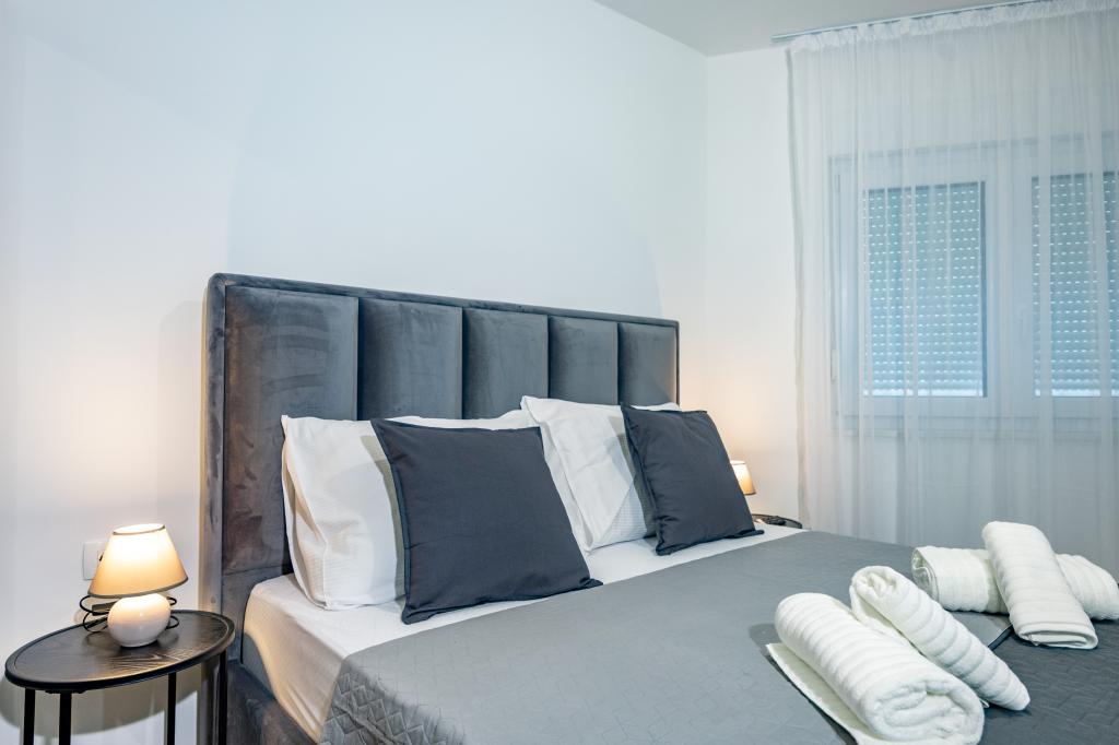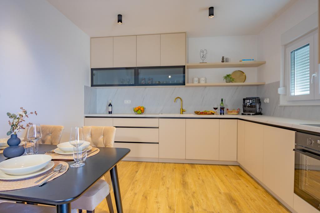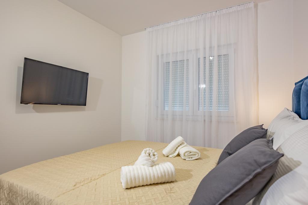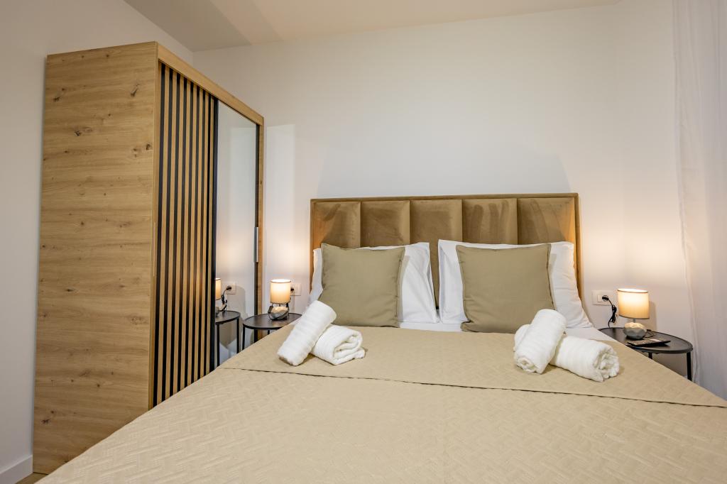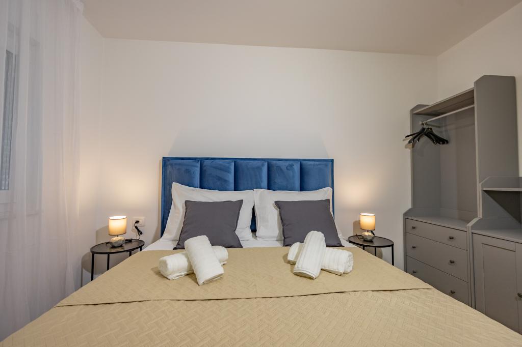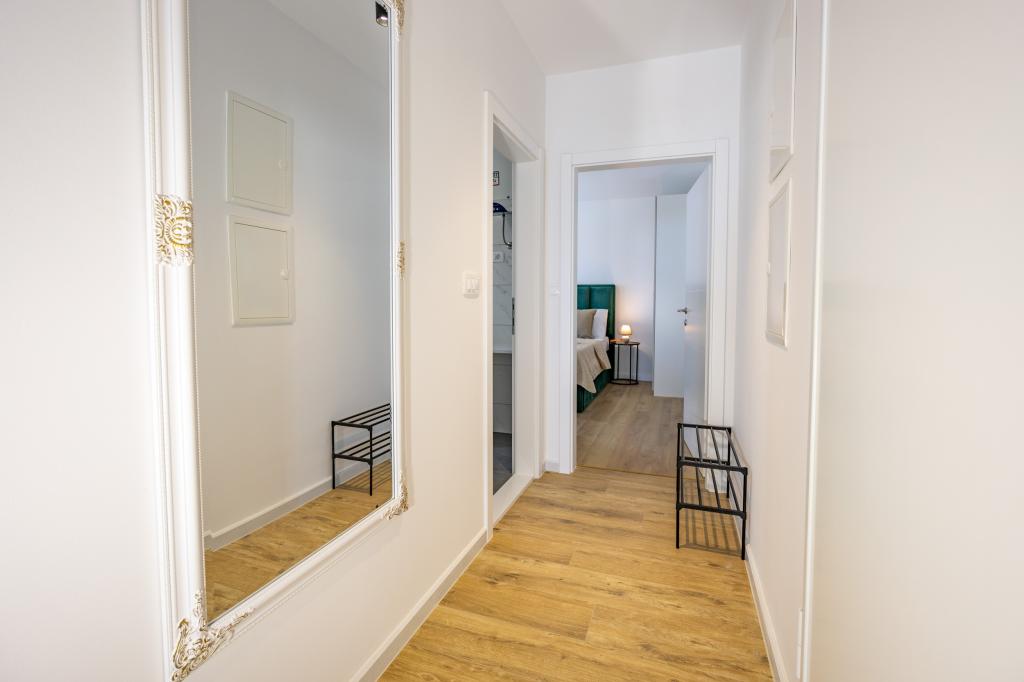 Hver lejlighed udstråler moderne design og nyrenoveret interiør. I den rummelige stue, der er indrettet med smagfulde møbler og moderne detaljer, vil du føle dig hjemme. Det åbne koncept forbinder naturligt stuen med et fuldt udstyret køkken, hvor elegante bordplader, kvalitetsapparater og al den plads, du har brug for til at tilberede dine yndlingsmåltider, venter på dig. Opholdsstuen åbner ud til en behagelig balkon - et ideelt sted til morgenkaffe eller aftenafslapning med et glas vin og en uforglemmelig solnedgang over Adriaterhavet. Hver lejlighed har to komfortable soveværelser med dobbeltsenge, udstyret med blødt sengetøj og masser af opbevaringsplads, et moderne badeværelse og et ekstra toilet. Lejlighederne har aircondition og er fuldt udstyrede: TV/SAT, internet, vaskemaskine, opvaskemaskine, kaffemaskine og alt hvad du behøver for et behageligt og ubekymret ophold.