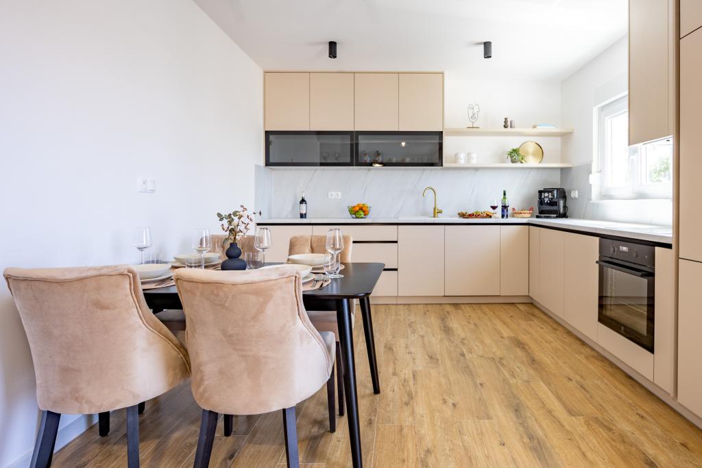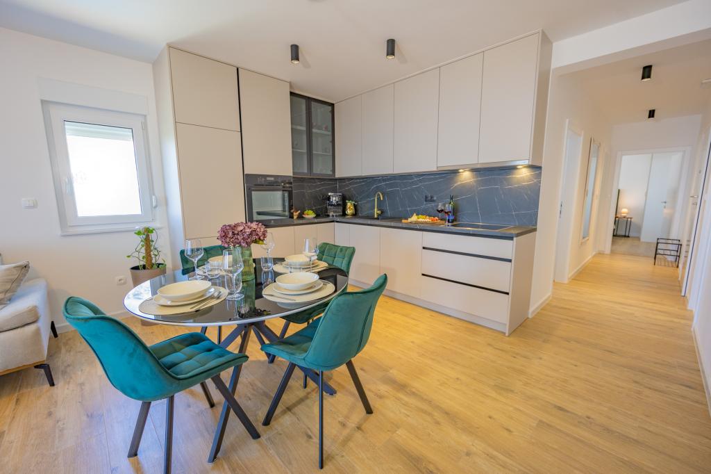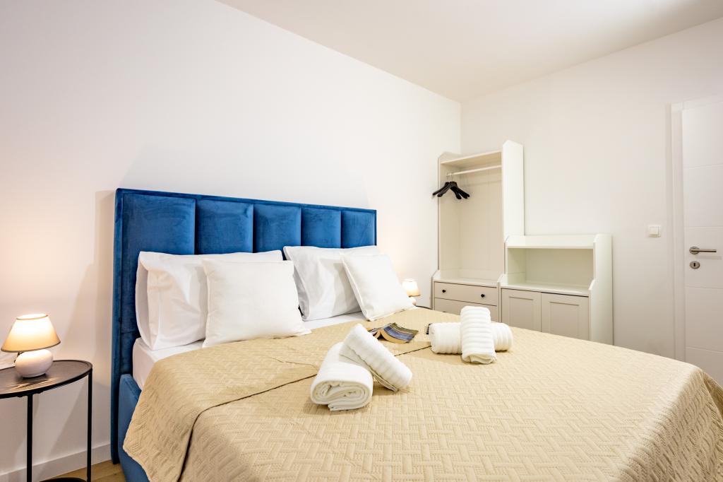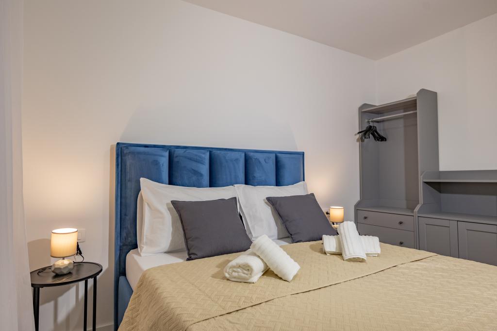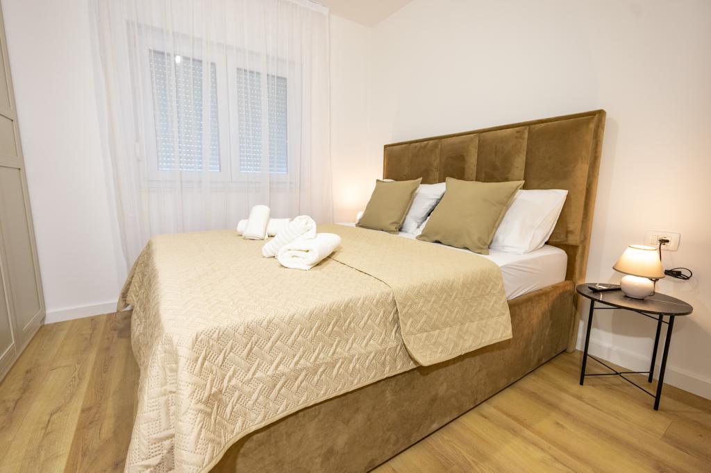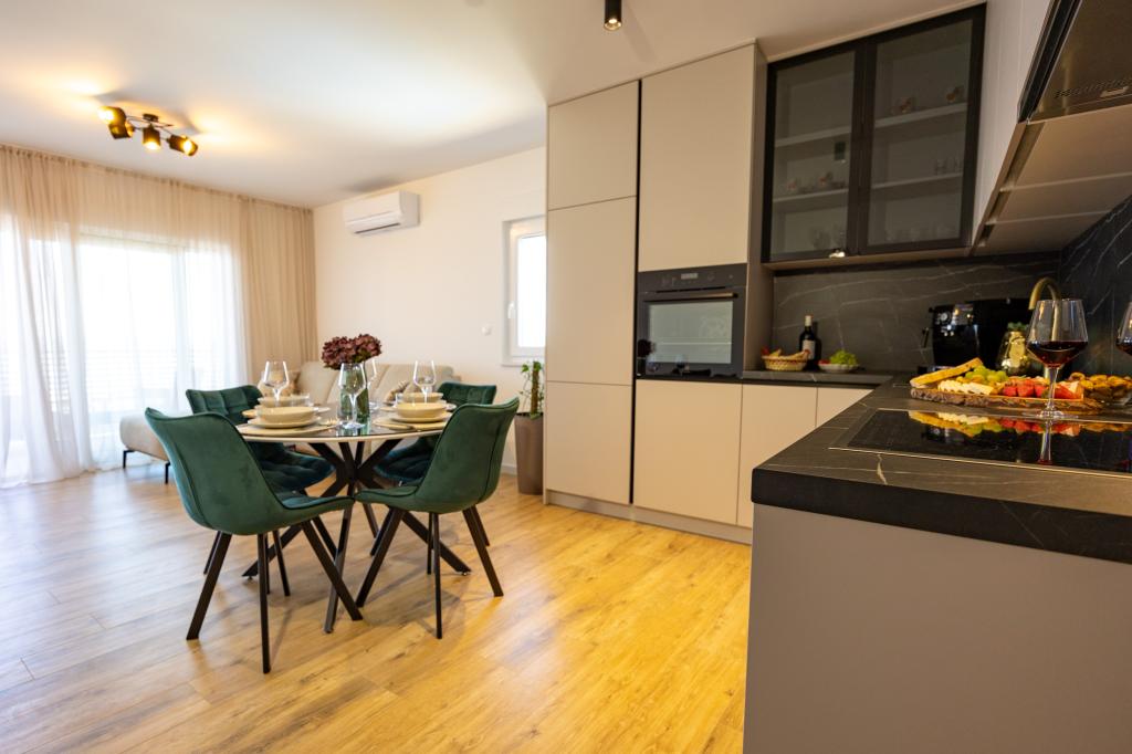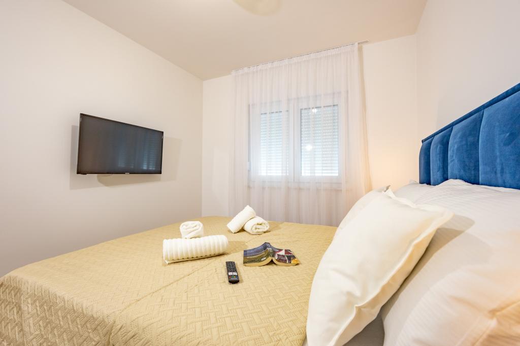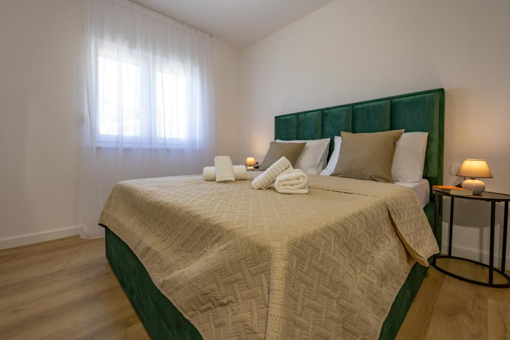 Hver lejlighed udstråler moderne design og nyrenoveret interiør. I den rummelige stue, der er indrettet med smagfulde møbler og moderne detaljer, vil du føle dig hjemme. Det åbne koncept forbinder naturligt stuen med et fuldt udstyret køkken, hvor elegante bordplader, kvalitetsapparater og al den plads, du har brug for til at tilberede dine yndlingsmåltider, venter på dig. Opholdsstuen åbner ud til en behagelig balkon - et ideelt sted til morgenkaffe eller aftenafslapning med et glas vin og en uforglemmelig solnedgang over Adriaterhavet. Hver lejlighed har to komfortable soveværelser med dobbeltsenge, udstyret med blødt sengetøj og masser af opbevaringsplads, et moderne badeværelse og et ekstra toilet. Lejlighederne har aircondition og er fuldt udstyrede: TV/SAT, internet, vaskemaskine, opvaskemaskine, kaffemaskine og alt hvad du behøver for et behageligt og ubekymret ophold.