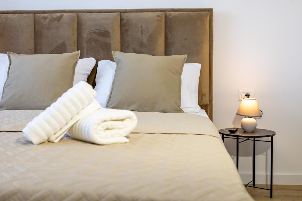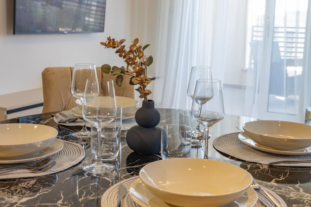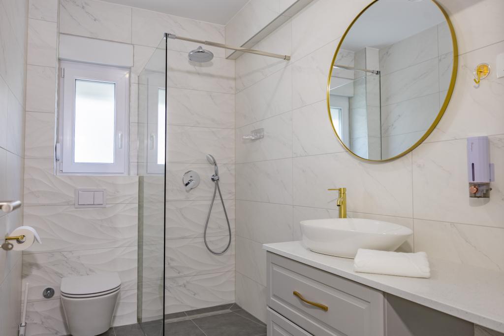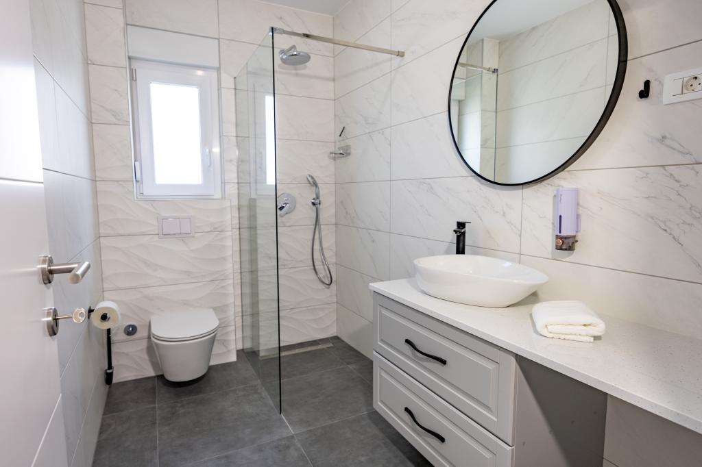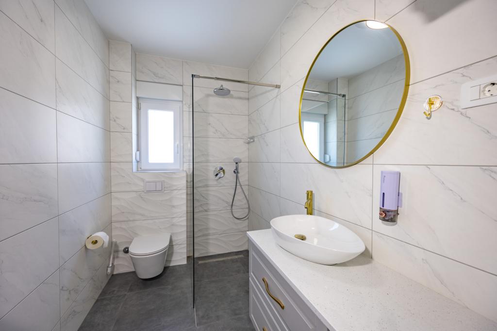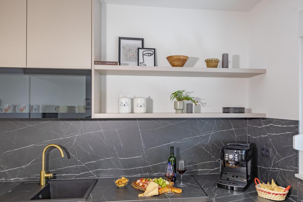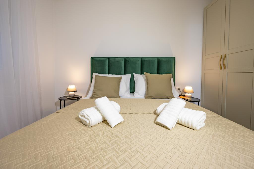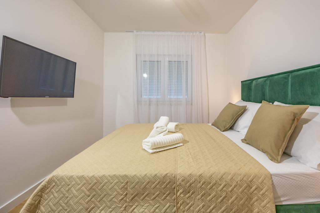 Hver lejlighed udstråler moderne design og nyrenoveret interiør. I den rummelige stue, der er indrettet med smagfulde møbler og moderne detaljer, vil du føle dig hjemme. Det åbne koncept forbinder naturligt stuen med et fuldt udstyret køkken, hvor elegante bordplader, kvalitetsapparater og al den plads, du har brug for til at tilberede dine yndlingsmåltider, venter på dig. Opholdsstuen åbner ud til en behagelig balkon - et ideelt sted til morgenkaffe eller aftenafslapning med et glas vin og en uforglemmelig solnedgang over Adriaterhavet. Hver lejlighed har to komfortable soveværelser med dobbeltsenge, udstyret med blødt sengetøj og masser af opbevaringsplads, et moderne badeværelse og et ekstra toilet. Lejlighederne har aircondition og er fuldt udstyrede: TV/SAT, internet, vaskemaskine, opvaskemaskine, kaffemaskine og alt hvad du behøver for et behageligt og ubekymret ophold.