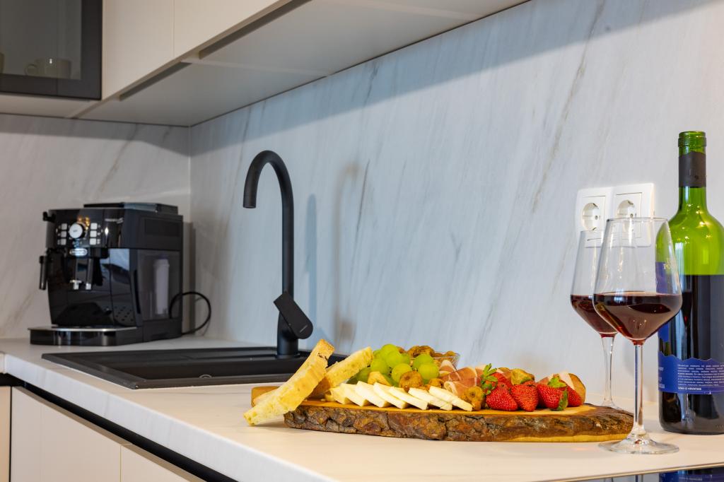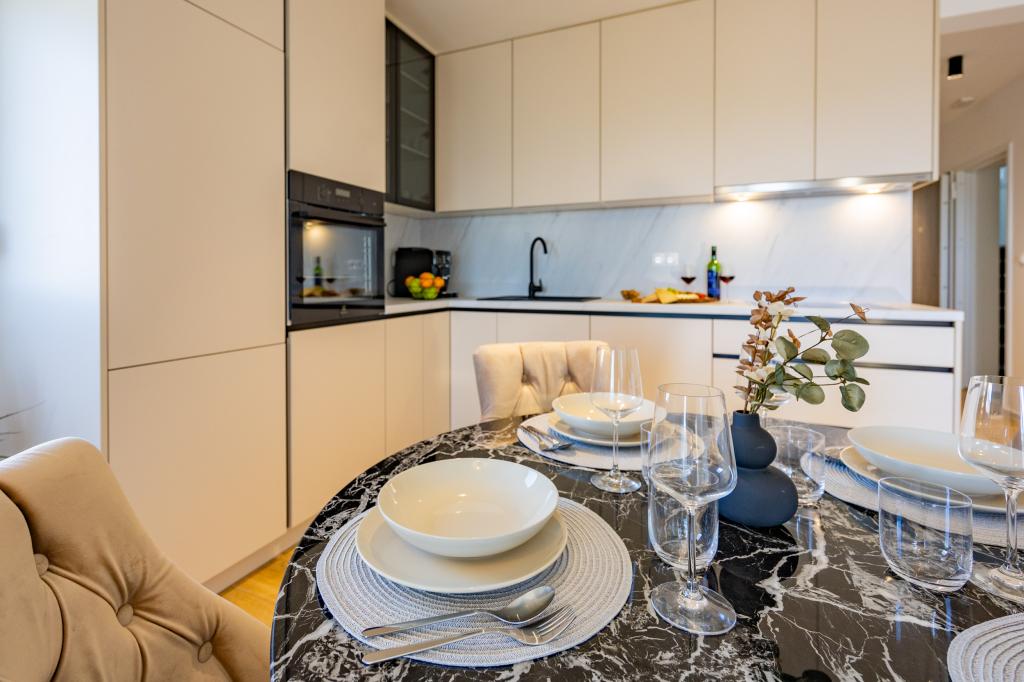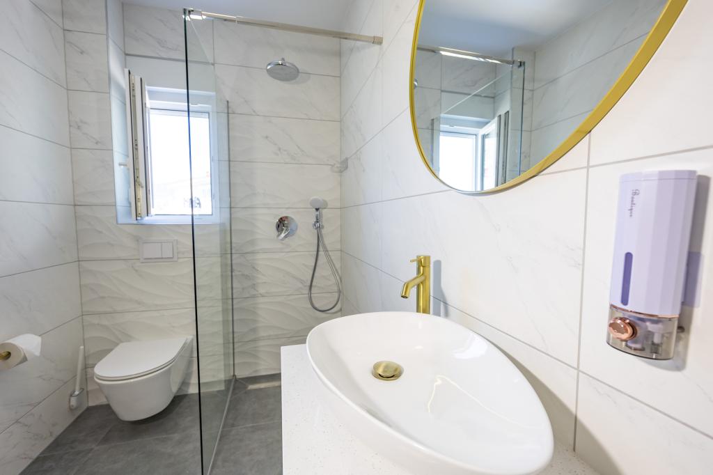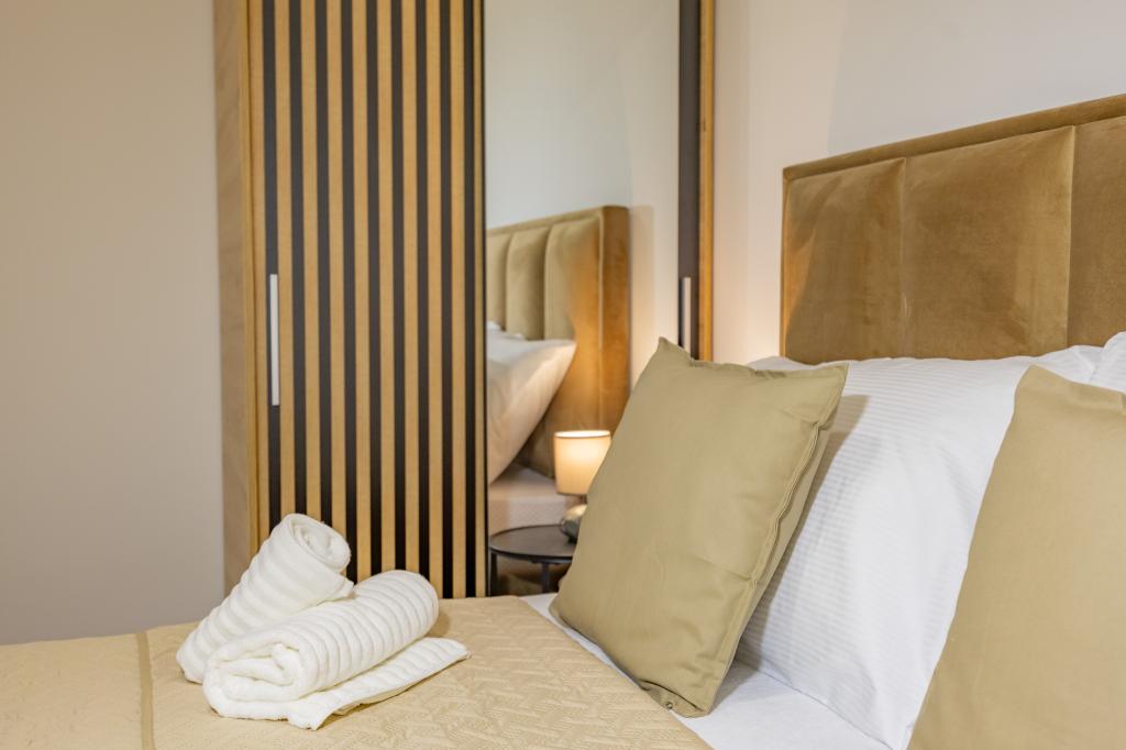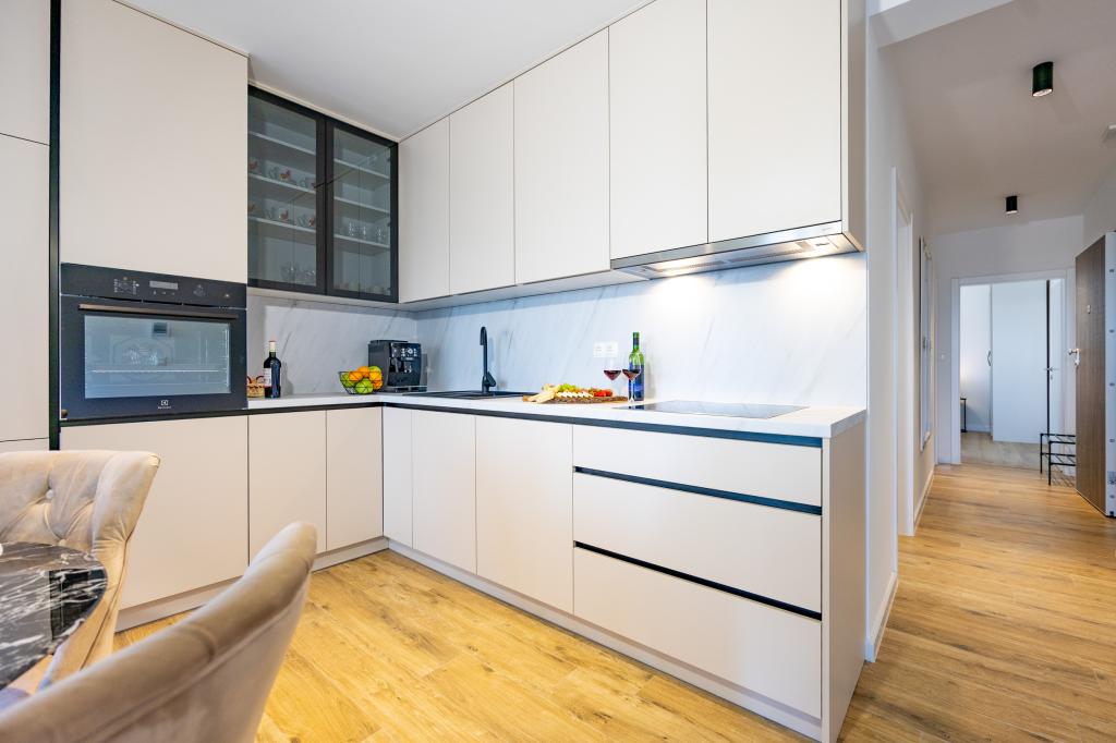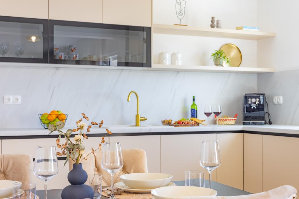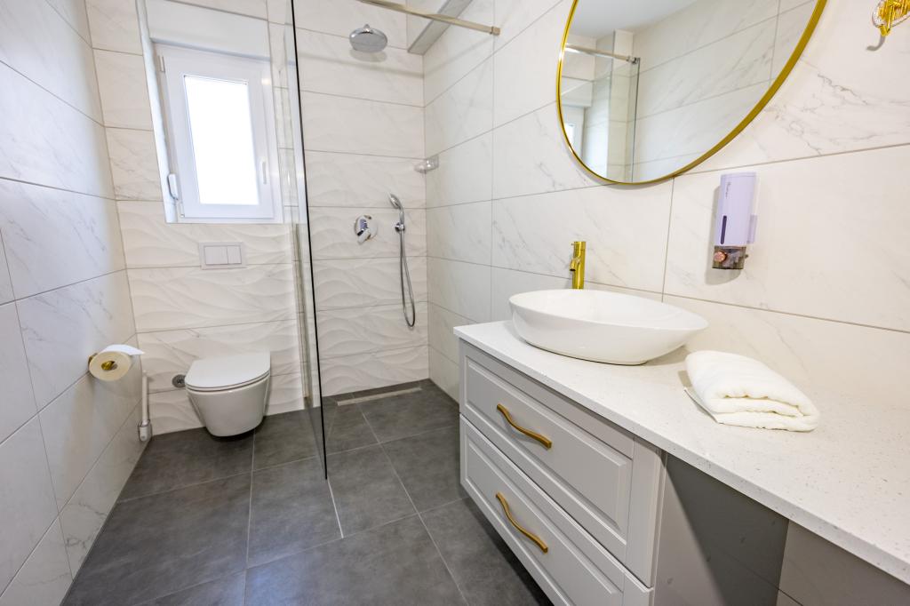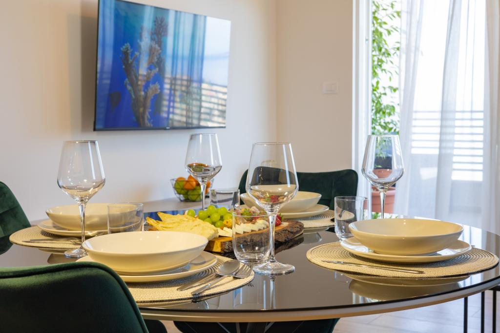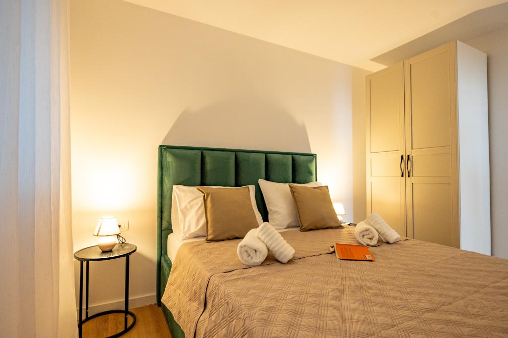 Hver lejlighed udstråler moderne design og nyrenoveret interiør. I den rummelige stue, der er indrettet med smagfulde møbler og moderne detaljer, vil du føle dig hjemme. Det åbne koncept forbinder naturligt stuen med et fuldt udstyret køkken, hvor elegante bordplader, kvalitetsapparater og al den plads, du har brug for til at tilberede dine yndlingsmåltider, venter på dig. Opholdsstuen åbner ud til en behagelig balkon - et ideelt sted til morgenkaffe eller aftenafslapning med et glas vin og en uforglemmelig solnedgang over Adriaterhavet. Hver lejlighed har to komfortable soveværelser med dobbeltsenge, udstyret med blødt sengetøj og masser af opbevaringsplads, et moderne badeværelse og et ekstra toilet. Lejlighederne har aircondition og er fuldt udstyrede: TV/SAT, internet, vaskemaskine, opvaskemaskine, kaffemaskine og alt hvad du behøver for et behageligt og ubekymret ophold.