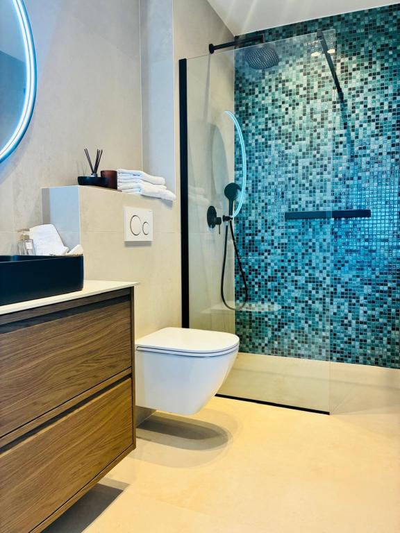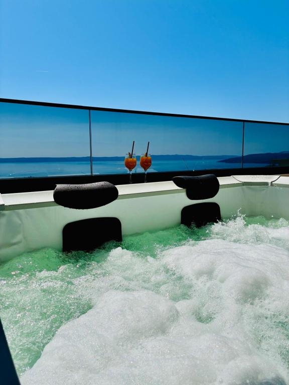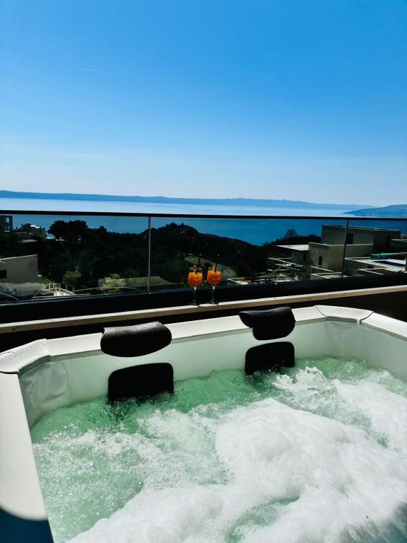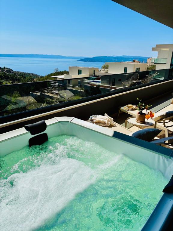 Villa 5 tilbyder indkvartering i Makarska med gratis WiFi og havudsigt samt udendørs swimmingpool, have og fælles opholdsstue. Denne lejlighed tilbyder gratis privat parkering og et fælles køkken. Lejligheden har aircondition, 4 soveværelser, en stue, et fuldt udstyret køkken med køleskab og kaffemaskine samt 3 badeværelser med bruser og gratis toiletartikler. Der er håndklæder og sengelinned i denne lejlighed. Villa 5 tilbyder 4-stjernet indkvartering med spabad og terrasse.