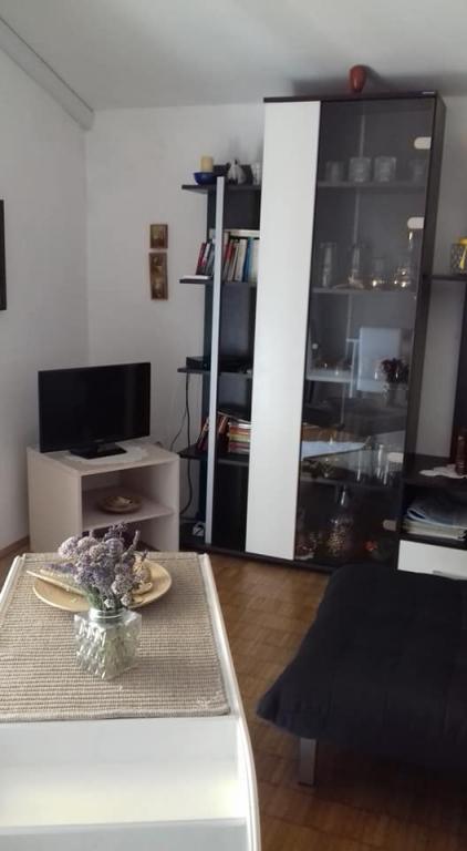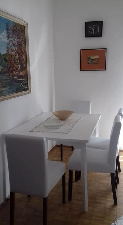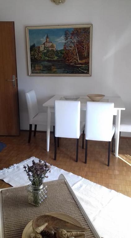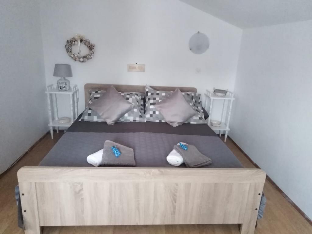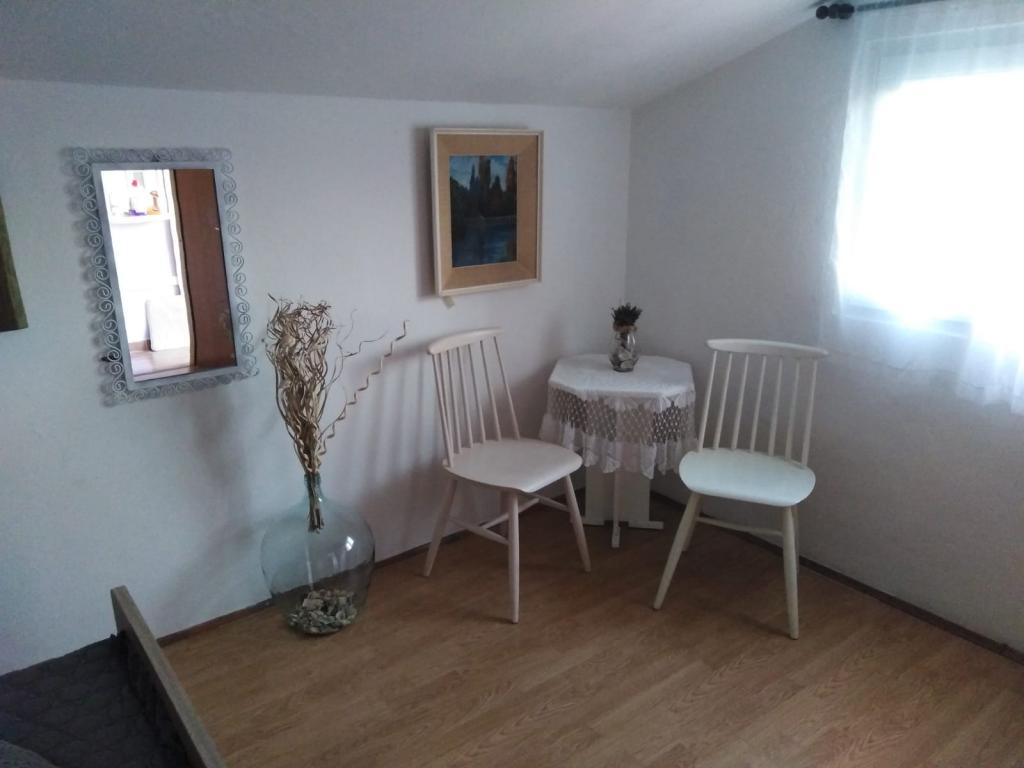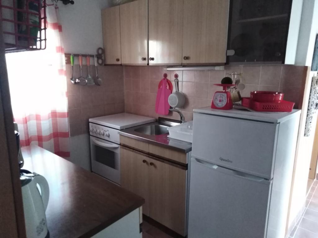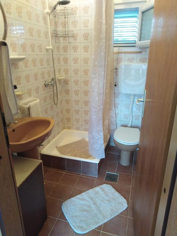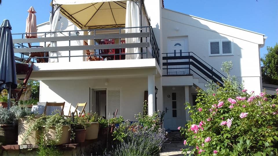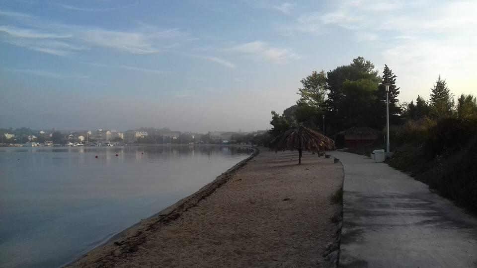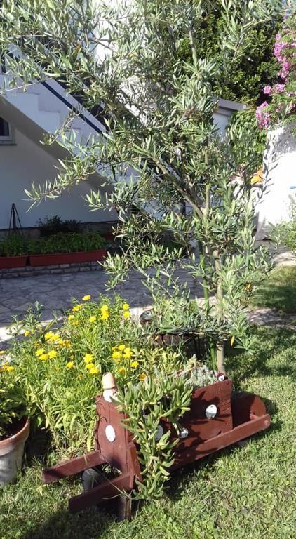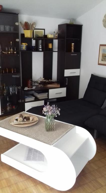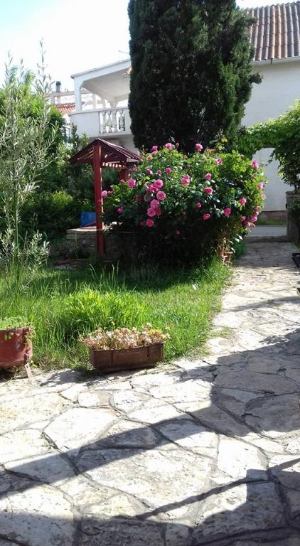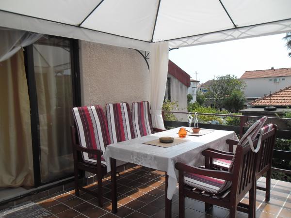 meget hjælpsomme dame ejer, bifaldt os hjem rakia og egen mynte lemonade, ren, hyggelig indkvartering, køkken fuldt møbleret, smuk terrasse, smuk have, stranden omkring 30 m, strandbeton, i vandet små sten kunne gå uden sko til vand, omkring 200 m strand fra disse sten, nærmeste restaurant ca. 5 minutter, til byen ved stranden omkring 15 minutters gang