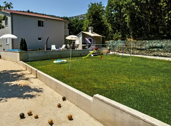 Turistskat er inkluderet i prisen.Vores gæster har en privat swimmingpool, et værelse med træningsudstyr, udendørs, traditionelle grill, legeplads for bowling og græsplæne med gynge. Sengetøj og håndklæder er også inkluderet. Dette er et fremragende valg for familier, eventyrere og grupper af venner, fordi placeringen er i et roligt miljø og er veludstyret og byder på masser af plads, og det er nær byen Omis (5km), flod Cetiina, hvor du kan prøve rafting, zip line, canyoning, gratis klatring eller bare nyde de smukke omgivelser, der tilbyder en flod canyon. Byen Split med sin gamle del, UNESCO Diocletians Palads, som du ser, er kun 21 km væk, eller en halv time, kan dette altid finde noget for enhver smag.
