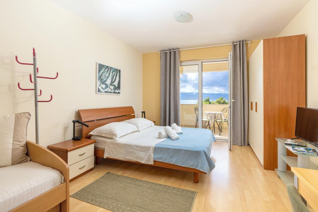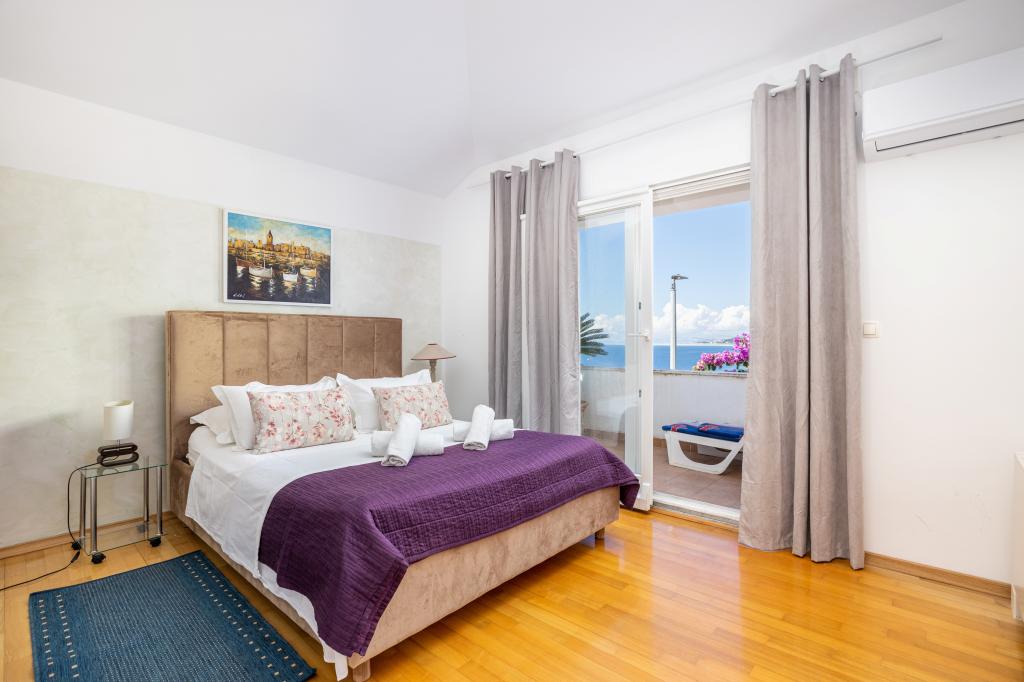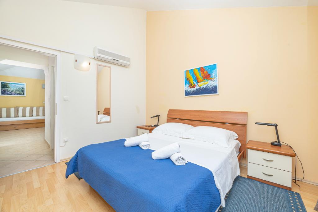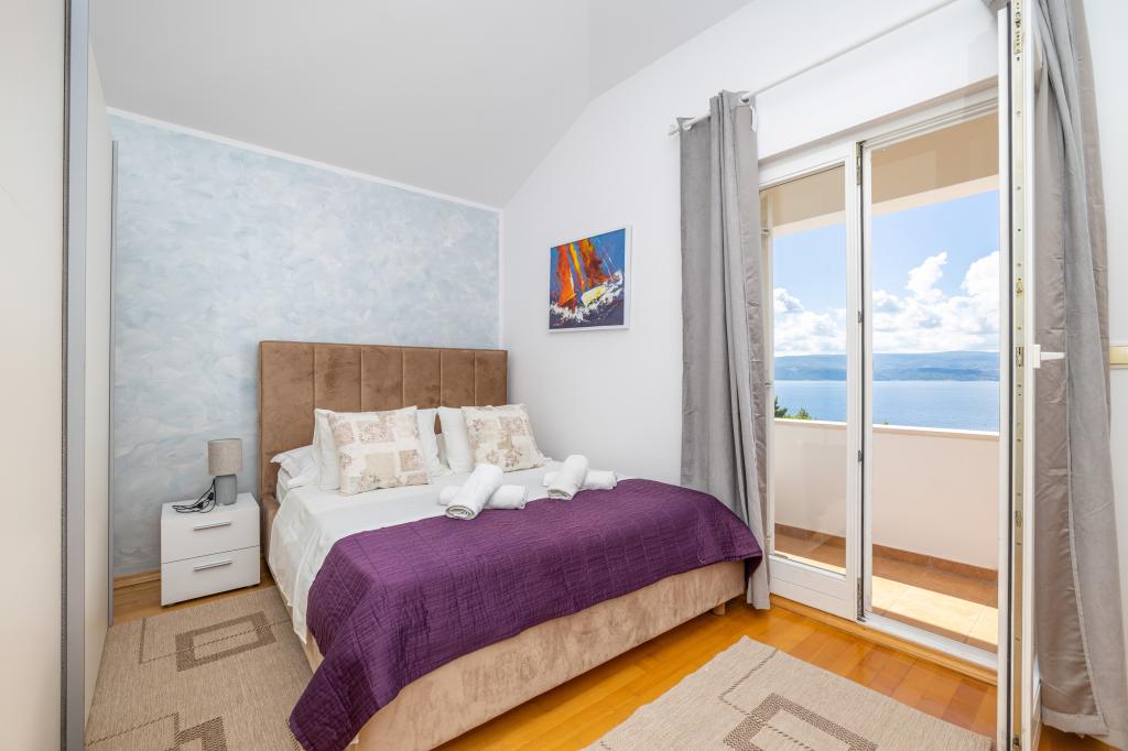 Indkvartering i nybyggede, yderst komfortable og veludstyrede lejligheder. Anlægget ligger 3 km fra Omiš centrum. I alt otte lejligheder, beliggende i første række til havet. Alle lejligheder har store terrasser med udsigt over havet og øen Brač. Parkeringspladser lige ved siden af villaen. Lejlighederne ligger nedenfor hovedvejen (300 meter), lige ved siden af havet og en stor stenstrand. Der er fire typer lejligheder, -- type 2+2 med et separat soveværelse med dobbeltseng og en stue med to senge, -- derefter lejligheder type 2+2 stort studio, -- store luksuslejligheder, type 4+2, med to dobbeltværelser og en stor stue med to udtrækssenge og -- stor de lux. lejlighed, type 14+2, i virkeligheden en villa i tre etager, 300m2 i areal, med en 9x4 meter swimmingpool med opvarmet vand, med syv dobbeltværelser, to store stuer med balkoner og terrasser, fire badeværelser, separat toilet, udendørs grill, sauna og fitnesscenter osv. Poolen bruges udelukkende af lejlighed A 14+2. De andre lejligheder gør ikke.