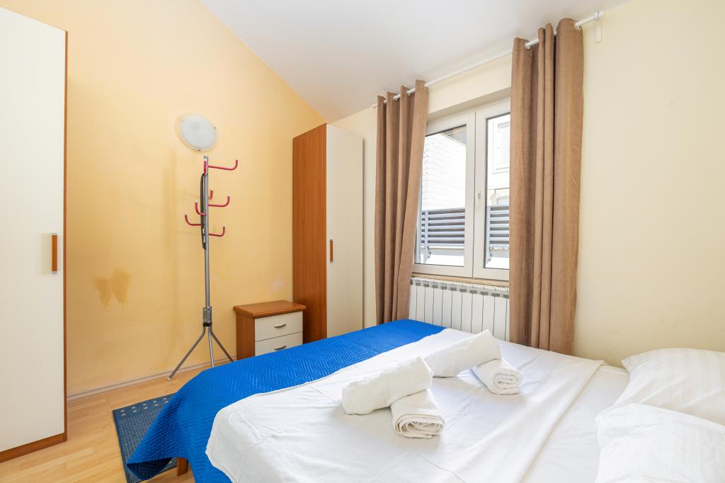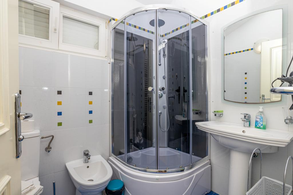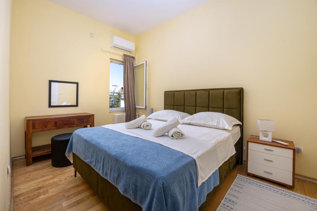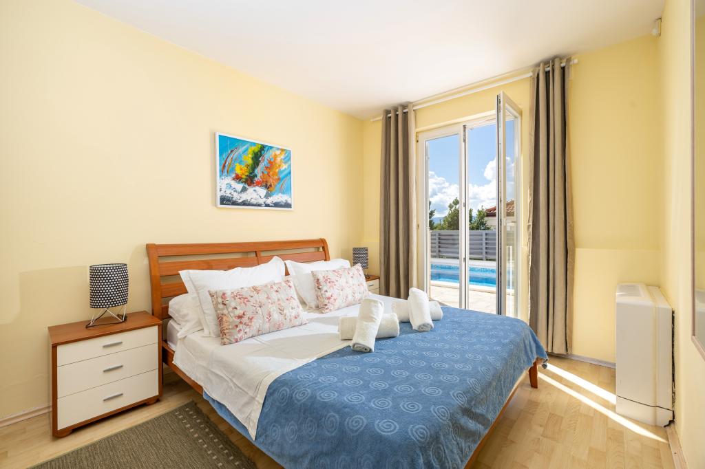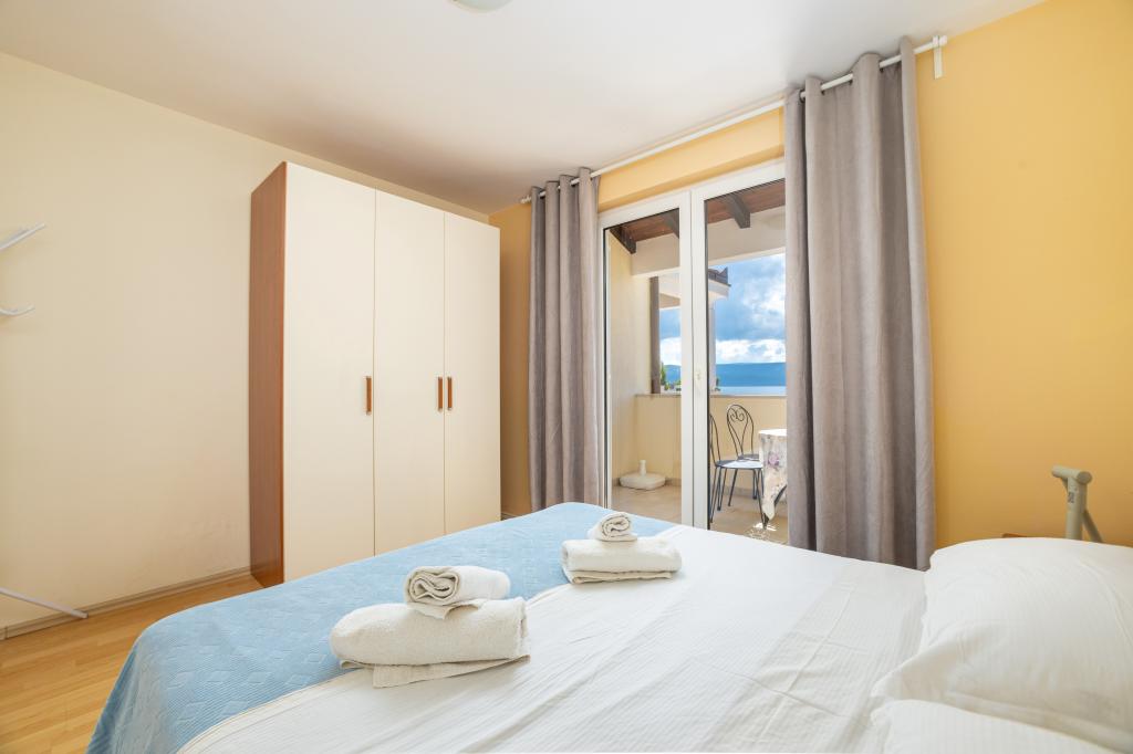 Indkvartering i nybyggede, yderst komfortable og veludstyrede lejligheder. Anlægget ligger 3 km fra Omiš centrum. I alt otte lejligheder, beliggende i første række til havet. Alle lejligheder har store terrasser med udsigt over havet og øen Brač. Parkeringspladser lige ved siden af villaen. Lejlighederne ligger nedenfor hovedvejen (300 meter), lige ved siden af havet og en stor stenstrand. Der er fire typer lejligheder, -- type 2+2 med et separat soveværelse med dobbeltseng og en stue med to senge, -- derefter lejligheder type 2+2 stort studio, -- store luksuslejligheder, type 4+2, med to dobbeltværelser og en stor stue med to udtrækssenge og -- stor de lux. lejlighed, type 14+2, i virkeligheden en villa i tre etager, 300m2 i areal, med en 9x4 meter swimmingpool med opvarmet vand, med syv dobbeltværelser, to store stuer med balkoner og terrasser, fire badeværelser, separat toilet, udendørs grill, sauna og fitnesscenter osv. Poolen bruges udelukkende af lejlighed A 14+2. De andre lejligheder gør ikke.