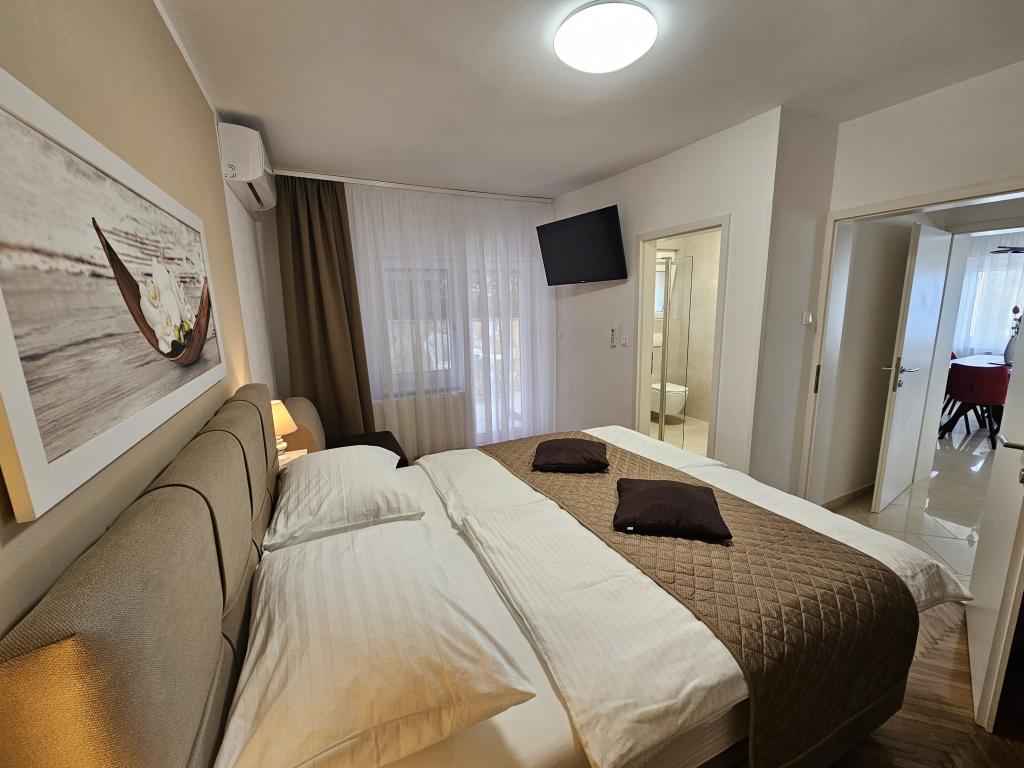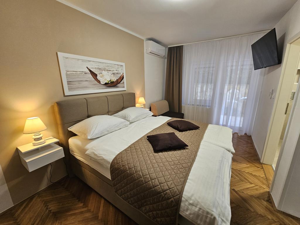 Lejlighederne Grozić ligger i et familiehus i en rolig del af Opatija, omgivet af terrasser, en smukt anlagt have med palmer og middelhavsplanter, en swimmingpool 7,0 x 3,5 m, dybde 1,5 m. Huset tilbyder indkvartering i to nyindrettede og komfortable lejligheder. Lejlighederne har en separat indgang, som yderligere giver den nødvendige privatliv for gæsterne. Lejlighed A2 (4-6 personer), 85 m2, ligger i stueetagen. Lejlighed A1 (4-6 personer), 90 m2, ligger på 1. sal. Der er parkeringspladser (overdækket). I den rummelige og smukt anlagte have er der en swimmingpool med solterrasser, som gæsterne kan benytte: en muret grill, overdækkede havemøbler (bord, stole), parasoller, liggestole... Nyd poolens privatliv og eksklusivitet. Velkommen!