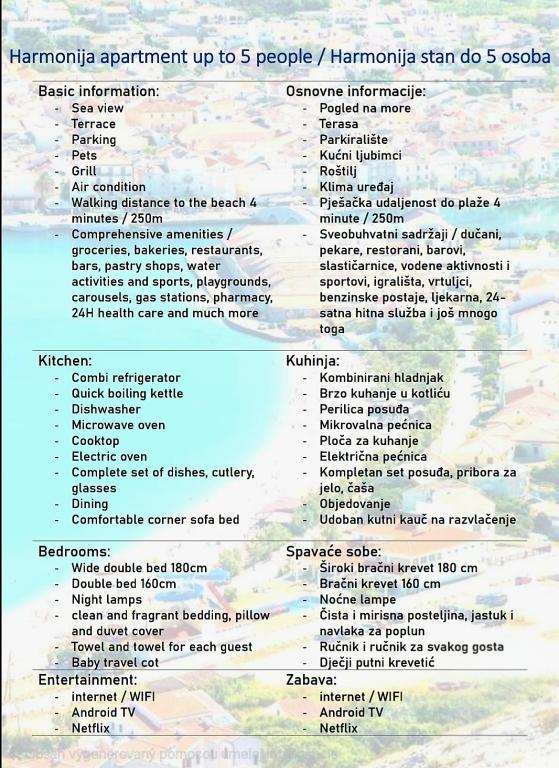 Vaskemaskine tilgængelig i teknikrummet – brug 2 gange på 7 dage inkluderet, hver ekstra vask €5 Tidlig ankomst til lejligheden (6:00-12:00) – €20* Sen afrejse fra lejligheden (11:00-19:00) – €20* Små kæledyr er velkomne – €5 pr. nat Andre tjenester efter aftale * Afhængig af tilgængelighed.