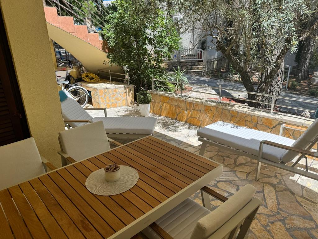Apartment Tina ligger i et lejlighedskompleks i Kozarica-lejren. En attraktiv lille lejlighed ligger i stueetagen med en rummelig terrasse på 20 m2 omgivet af fyrreskov og skygge. Afstanden fra stranden er 50m. Lejligheden består af en stue med køkken, to soveværelser og et badeværelse. Den er udstyret med alle husholdningsapparater og fornødenheder, som om du var i varmen i dit eget hjem. Der stilles parkeringsplads til rådighed. En lille oase af fred, ideel til to voksne og to børn.