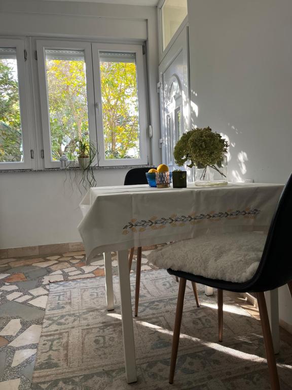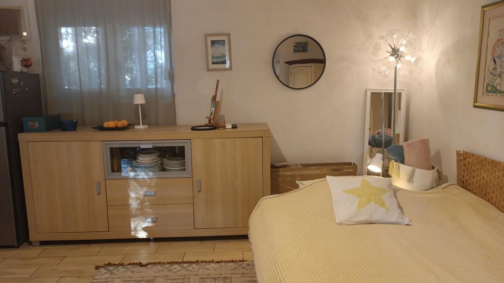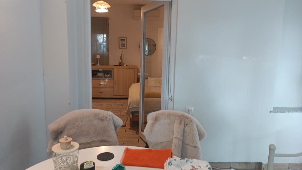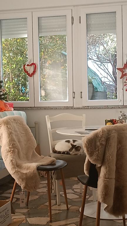 Log Inn-lejligheden ligger på første sal i et hus med kun to lejligheder, i en rolig gyde for familier. Husets have er skyggefuld med oliven-, figen- og fyrretræer, med en parkeringsplads i gården. Bymidten med butikker, bagerier, konditorier, caféer og restauranter ligger 10 minutters gang væk, og den første stenstrand ligger kun 5-10 minutters gang væk. Log Inn er behageligt at opholde sig i uanset vejret, rummeligt og med et separat værelse med en stue med legetøj og billedbøger. Det er veludstyret (service, elkedel, kaffemaskine, max-tv, wlan, aircondition), og i stuen om forårsaftenerne slapper man af ved ilden i brændeovnen. Terrassen med havemøbler er behagelig, og gæsterne er glade for at spise morgenmad på den, solbade eller nyde aftenen. Studiolejligheden er mindre og med et mindre tekøkken, men på grund af haven er den behagelig selv i sommervarmen. Den har udstyr til babyer: rejseseng, børneværelse, legetøj, måtte osv. Begge lejligheder har køling og varme. I lavsæsonen udlejes de med rabatter og på månedlig basis