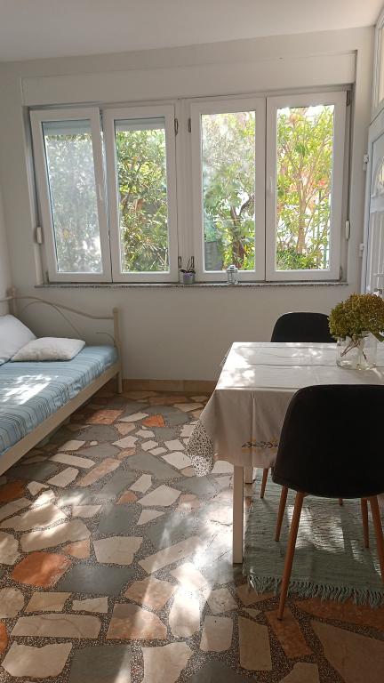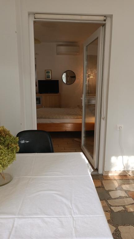 Log Inn-lejligheden ligger på første sal i et hus med kun to lejligheder, i en rolig gyde for familier. Husets have er skyggefuld med oliven-, figen- og fyrretræer, med en parkeringsplads i gården. Bymidten med butikker, bagerier, konditorier, caféer og restauranter ligger 10 minutters gang væk, og den første stenstrand ligger kun 5-10 minutters gang væk. Log Inn er behageligt at opholde sig i uanset vejret, rummeligt og med et separat værelse med en stue med legetøj og billedbøger. Det er veludstyret (service, elkedel, kaffemaskine, max-tv, wlan, aircondition), og i stuen om forårsaftenerne slapper man af ved ilden i den antikke brændeovn. Terrassen med havemøbler er behagelig at gå på (teak), og gæsterne er glade for at spise morgenmad på den, solbade eller nyde aftenen med opvask og god vin fra Šibenik-regionen. Studiolejligheden er mindre og med et mindre tekøkken, men på grund af haven er den behagelig selv i sommervarmen. Begge lejligheder har aircondition og varme. De udlejes med rabatter og på månedsbasis i lavsæsonen.