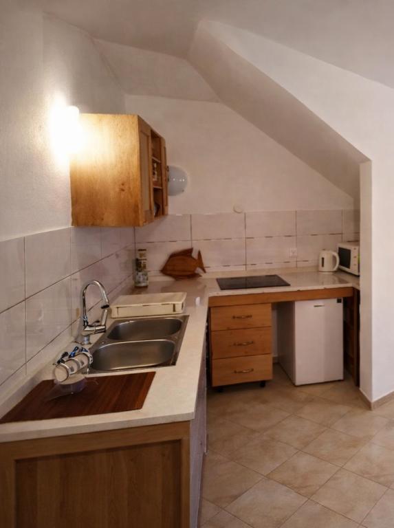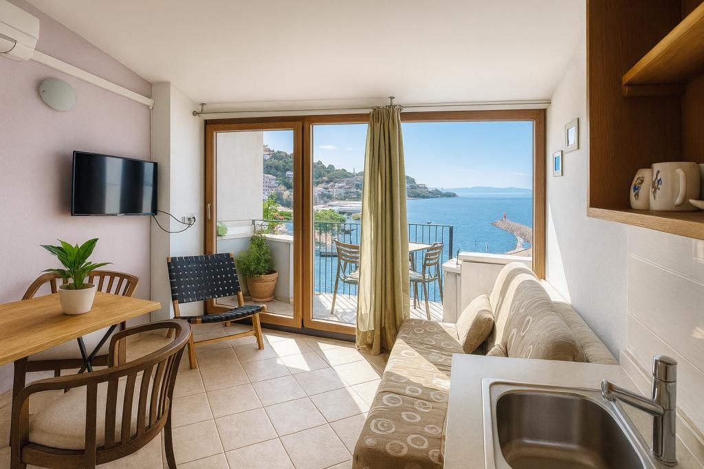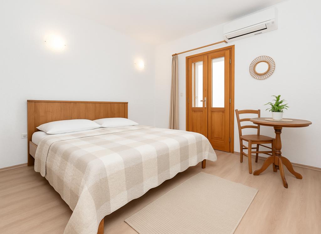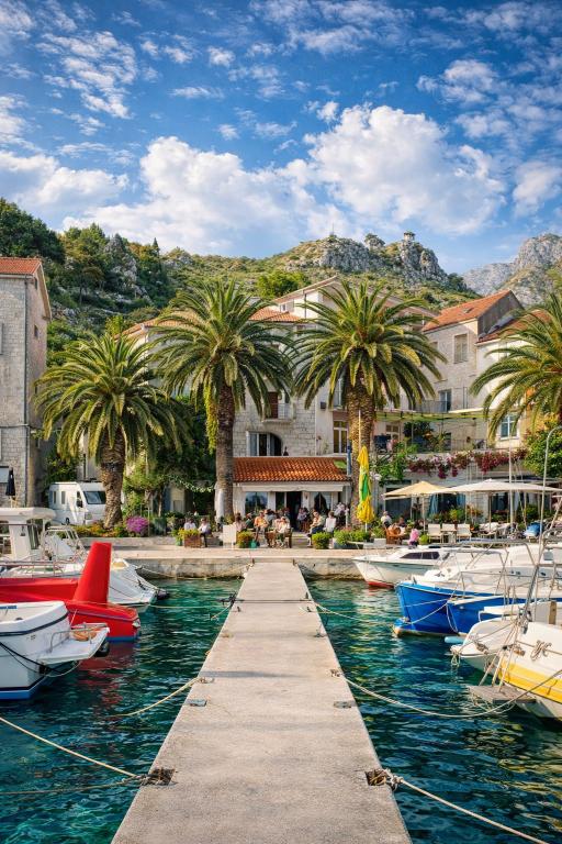 Et gammelt hus i selve marinaen, i en roligere del af Podgora, som ligger kun 5 m fra havet. Fuldstændig renoveret og indrettet. Vi tilbyder dig tre lejligheder, hver med et separat soveværelse, en stue med køkken og en balkon med udsigt over havet. Parkering er inkluderet i prisen. I husets stueetage ligger en stille og specialindrettet cafe, hvor man kan slappe af og nyde cocktails og en smuk udsigt over havet og øerne.