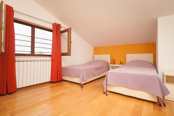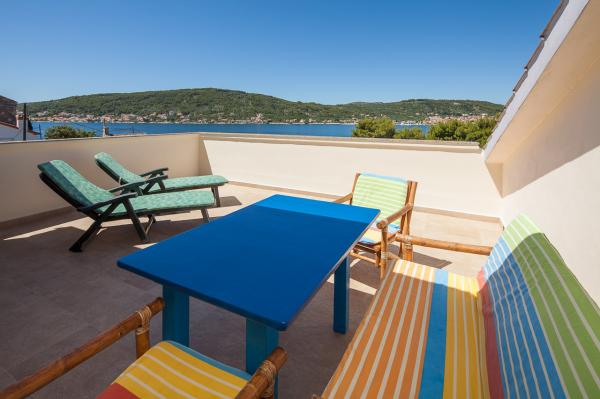 Rummelig lejlighed med havudsigt fra alle værelser, med en stor terrasse på 25 m2 med udsigt over havet og øen Ugljan. Lejligheden er beliggende på loftet af huset på en lille ø Osljak, den første ø til Zadar. Lejligheden har to soveværelser. Værelse med balkon har en dobbeltseng måler 180 x 200 cm og skab og udsigt over havet og øen Ugljan. Det andet soveværelse har to enkeltsenge måler 90 x 200 cm (der kan også nemt tilsluttes til en stor dobbeltseng) og et skab. Hvis det er nødvendigt, kan det sættes en ekstra børns krevetić.Ova værelse har udsigt over havnen, byen Zadar, Velebit og en del af øen Ugljan. Badeværelset er rummeligt med brus og vaskemaskine. Køkkenet har alle de nødvendige redskaber, køleskab, ovn og opvaskemaskine. En air-condition i stuen og den anden i soveværelser lejligheder. I stuen har en stor hjørnesofa og tv og en spisestue åbner op til en terrasse, som har et bord med stole og to komfortable lænestole. Terrassen er fuld, hvis det er nødvendigt, kan dækkes med en markise.