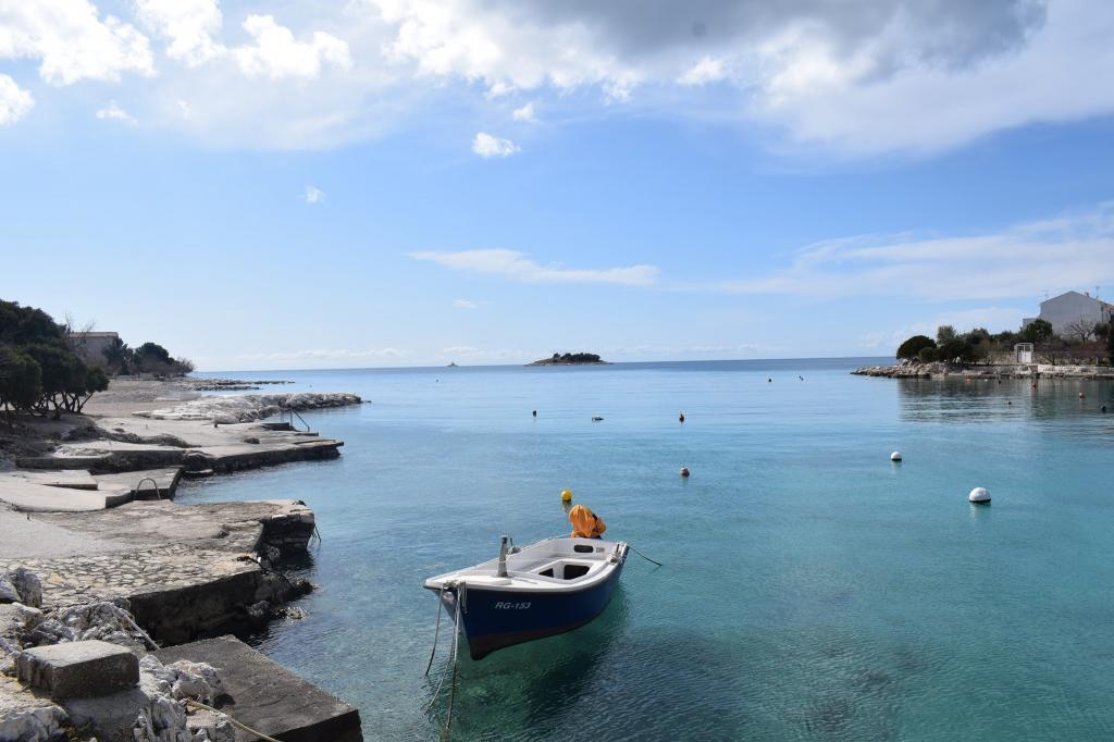 Apartment The D ligger i Rogoznica, Šibenik, i Lozica-bugten. Fuldt udstyret lejlighed beliggende i stueetagen af et familiehus, første række til havet. 30 m fra en skøn strand velegnet til børn og voksne. I nærheden ligger den verdensberømte Frapa Marina med alle faciliteter for unge mennesker.