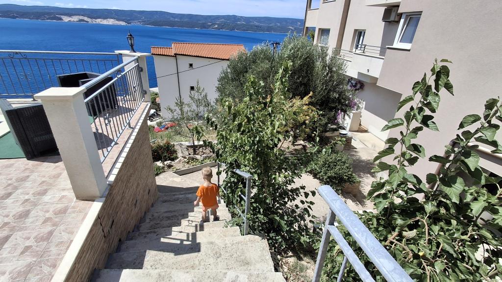 Lejlighed anbefalet, alle som beskrevet (opvaskemaskine, ovn, stort køleskab, bidet). Fantastisk havudsigt fra balkonen og køkkenet. I det ene soveværelse er der en ekstra balkon med udsigt over havet, og i det andet vindue med udsigt de smukke bjerge. På ejendommen er en swimmingpool med fantastisk udsigt over havet og bjergene. Den nærliggende strand (nedenunder) er meget intim, der var ikke en masse mennesker - en lille strand småsten og mange steder stenede / beton og hvad der er vigtigt lyssky. Meget nice vært (Ivo hilse på dig og din familie) - hjælpsomme og høflige. En dag, han bragte os varm cookies med påfyldning.