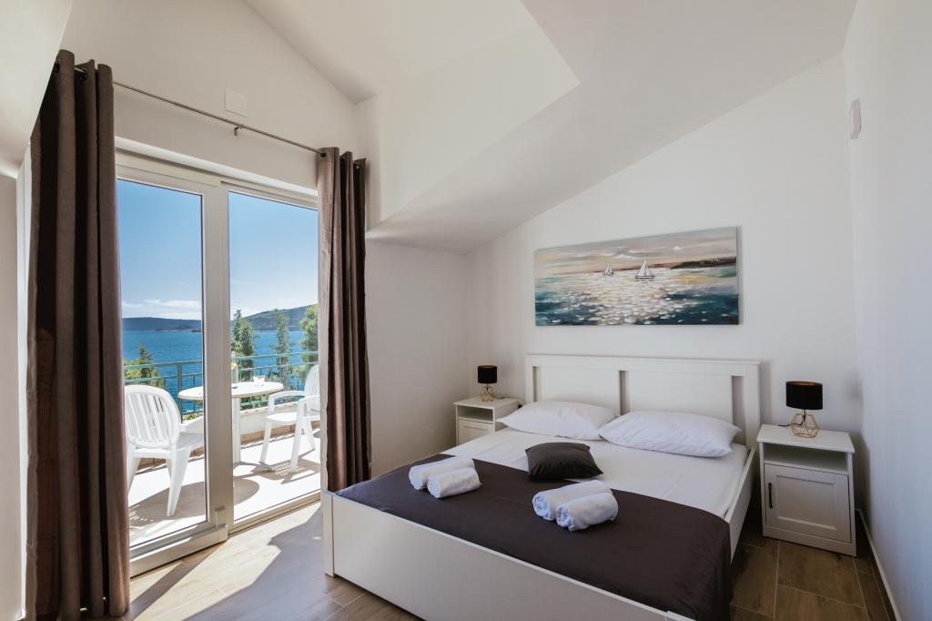 Lejligheder M er beliggende i den lille kystby Seget Vranjica. 5 km væk fra kendte, UNESCO beskyttede by Trogir og 7 km fra lufthavnen. Omkring Trogir og Seget Vranjica er karakteriseret af frodig vegetation, olivenlunde, talrige øer og øer, stenet og sandstrande. Fred, ro og gæstfrihed er de vigtigste kendetegn ved denne by. Ferielejligheder M tilbyder 4 lejligheder. Én dobbeltseng, et med ekstra seng, en lejlighed med fire senge og en stor lejlighed med kapacitet op til 6 personer. Hver lejlighed har eget køkken, bad og toilet, spisestue og balkon med udsigt over havet. Alle lejligheder har aircondition og er udstyret med TV fjernere med digital. satellit-tv og wi - fi internet. For alle gæster parkeringsplads. Stranden er kun 30 m. En del af stranden er ideel til solbadning. Havet er krystalklart og bunden er sten og grus.