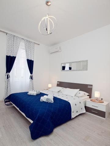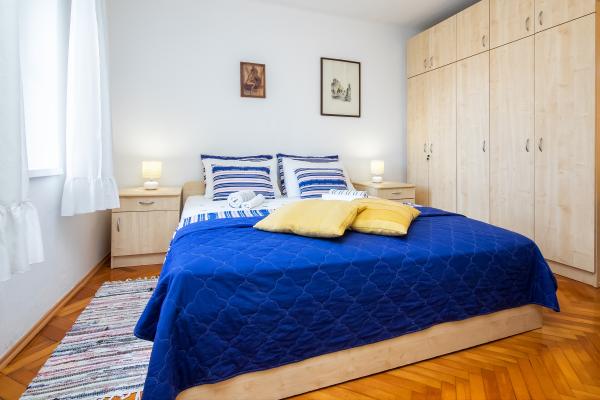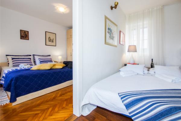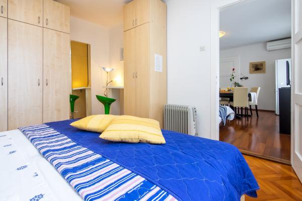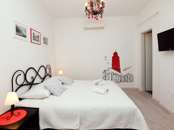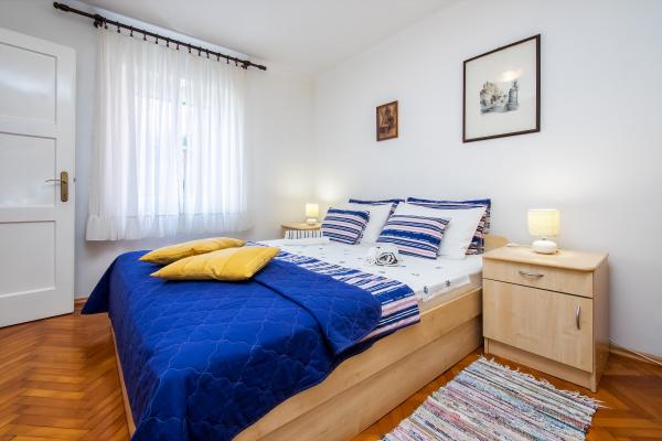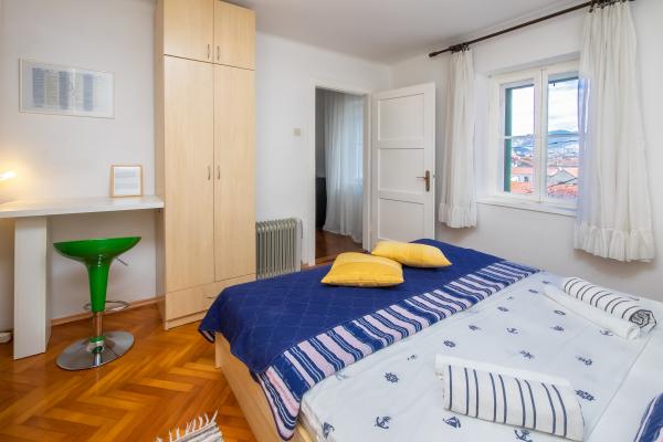 Lejlighederne ligger i stueetagen og på første sal i et typisk dalmatisk hus, i et meget roligt grønt område ved foden af Marjan Forest Park, i centrum af byen kaldet VELI VAROŠ. Det er kun 5 minutter væk. gå fra Diocletians palads, flodhavnen og havet til ACI-marinaen. Bus og togstation er 15 min. gå. Lejlighederne er veludstyrede. Første sal lejlighed indeholder: 1 soveværelse (16 m2) med stor dobbeltseng (180x220 cm, med latoflex podnica) 1 stort skab 1 lille garderobe, badeværelse med bruser, køkken med spiseplads og større ekstra seng (fold-out sofa , billedet er blåt). Stueetagen har 2 værelser med bad / ensuite (17m2) med store dobbeltsenge og klædeskab, LCD-tv og minibar. Mere information med billeder på hjemmesiden: http: // www. overnatning-Jerkovic. dk / eng / indledende side Andet: 3 parkeringspladser foran (obligatoriske nuværende reserveringer), terrasse / gård 70m2, med bord og stole og frugt haven med pejs.