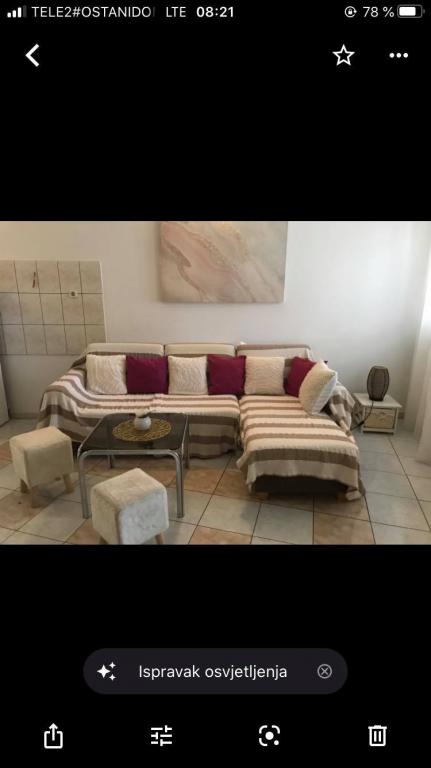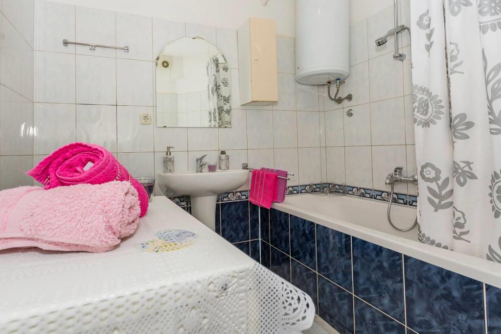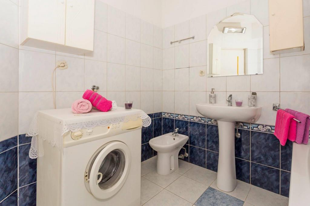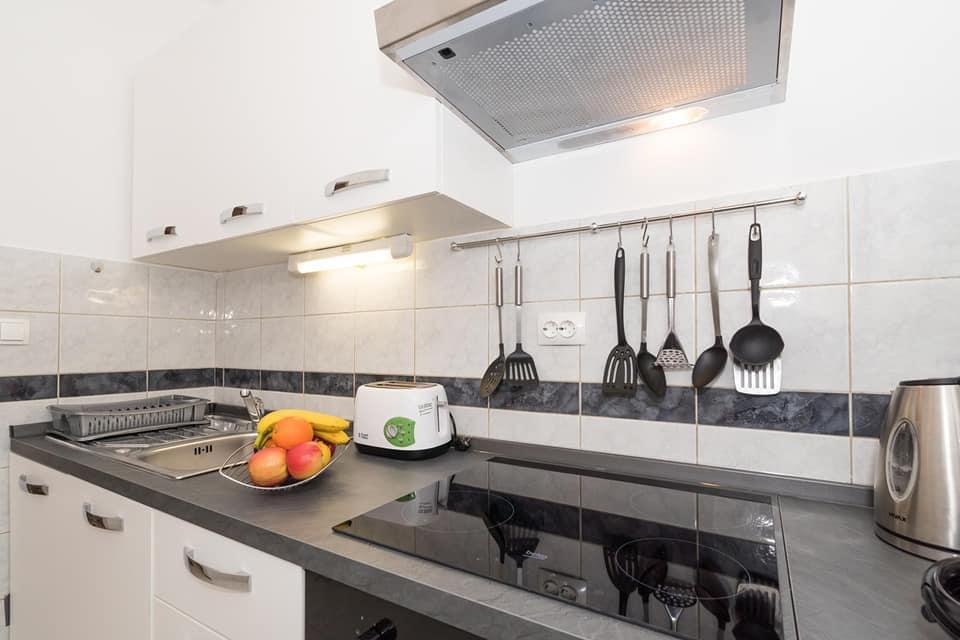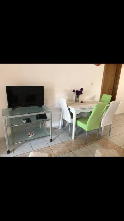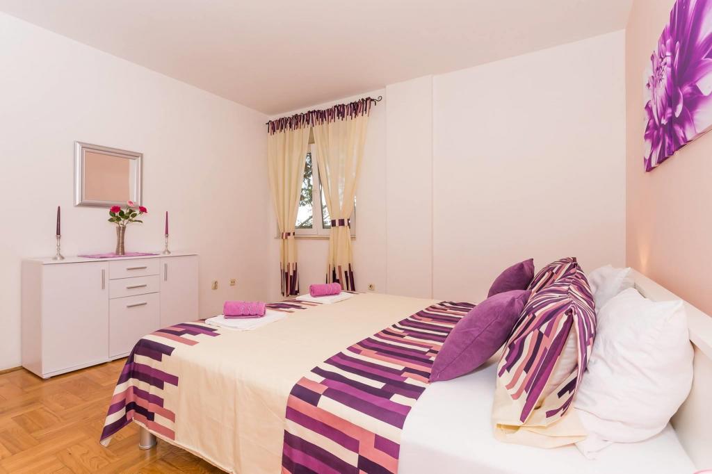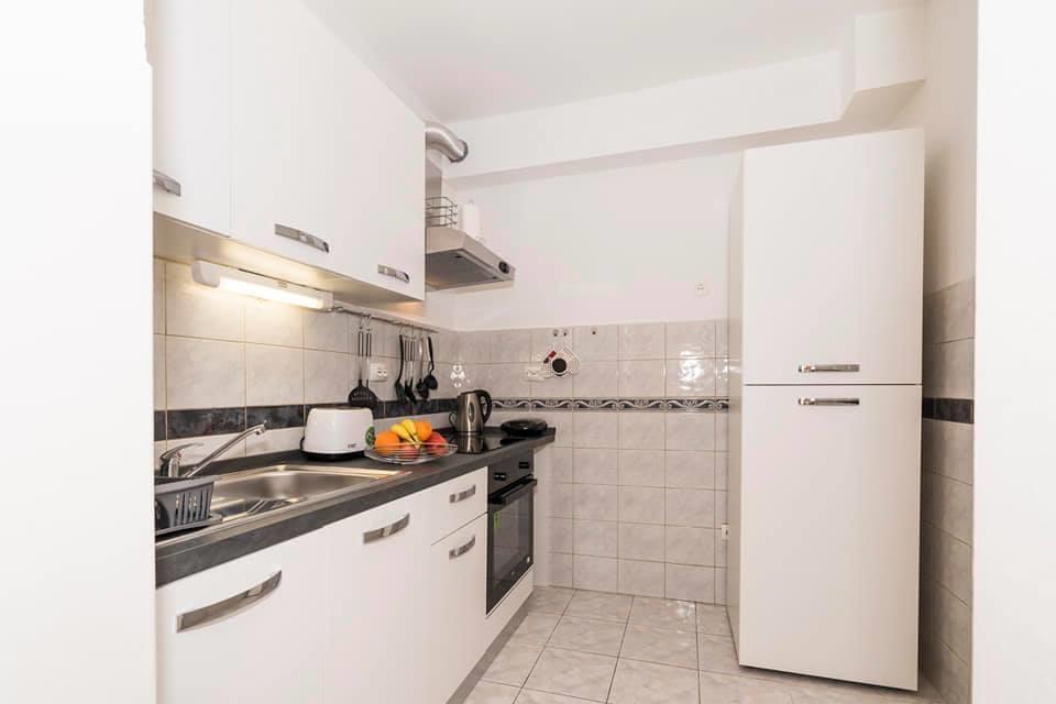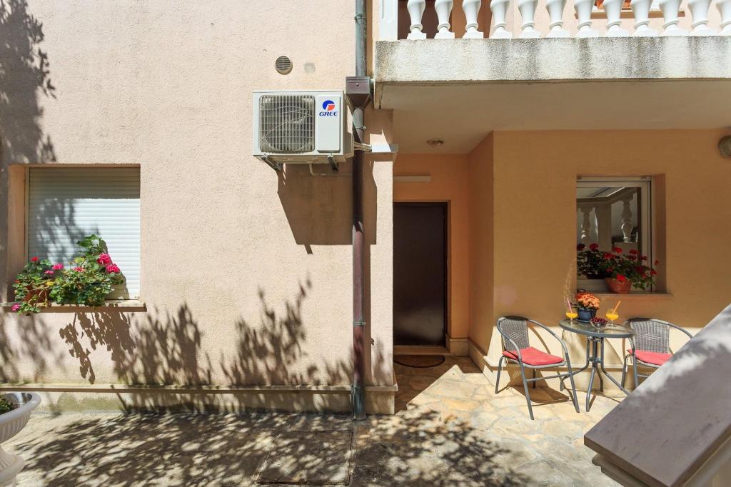 Lejligheden ligger i den første række mod havet i en ny bygning. Lejligheden indeholder to store soveværelser med dobbeltsenge, to toiletter, køkken, spisestue, stue og terrasse. Lejligheden ligger 200 m fra den første stenstrand og 300 m fra sandstranden. Afstanden til den første café og restaurant er mindre end 100 m, café Renato, Tennisbar og Mythos, restaurant Velo Misto og Barkarola. Afstanden til byens centrum er omkring 20 minutter til fods. I en afstand af 100 m er der tennisbaner til leje.