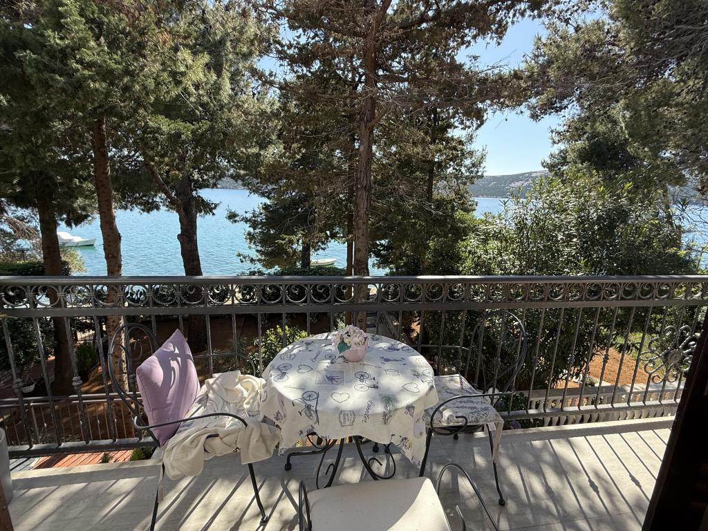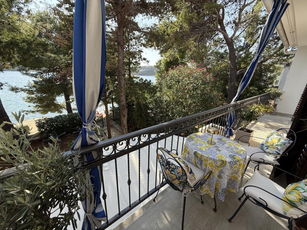 Alle 4 lejligheder benytter en privat strand foran huset med liggestole og bruser samt skygge fra fyrretræer. 1. Lejlighed A4+2 i stueetagen i et romantisk hus, første række til havet (10 m). Den har to soveværelser og en sovesofa i stuen. Lejligheden har adgang til sin egen store terrasse med en smuk havudsigt. Ideel til en familie med børn og også til en gruppe på op til 5 venner. Det er muligt at leje lejlighed A4+1 på første sal i samme hus og bruge hele huset. 2. Lejlighed A4+1 på 1. sal har 2 soveværelser og en ekstra seng i stuen. Den har en balkon med en fantastisk udsigt og en privat terrasse på 20m2. 3. Studiolejligheden ligger i et andet mindre hus i haven bag det første hus, 30 meter fra havet. 4. Lejlighed A2+2 ligger i et andet mindre hus i haven bag det første hus, 30 meter fra havet. Fred og privatliv, især i juni og september, er fordelene ved disse lejligheder, som mange har kaldt som himlen på jorden. Kæledyr er ikke tilladt (små hunde op til 7 kg efter anmodning).