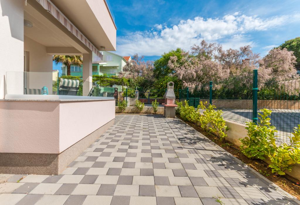 Bygningen er opført som et hus med 6 lejligheder, der bevidst blev bygget som fritliggende enheder (lejligheder), med separat indgang, inde i en fælles trappe. Lejlighed Turquoise 1 er velegnet til familier med børn, fordi den på 58 m2 byder på 2 soveværelser, et komfortabelt køkken med åben stue. Køkkenet indeholder opvaskemaskine, mikroovn, kaffemaskine, stort køleskab med fryser, el-komfur med ovn og keramisk kogeplade. I stuen er der 52" TV, gratis WIFI. Ved siden af stuen er der stor terrasse og gårdhave med grill. Badeværelset byder på vaskemaskine, hårtørrer, håndklæder og basale hygiejneprodukter. Lejligheden ligger 50m fra strand med små sten og kysten, 100 m fra centrum og øvrige faciliteter.Lejlighed 2 ligger på 1. sal i bygningen og har ingen brugsret til gården.Inde i badeværelset er der ingen vaskemaskine.