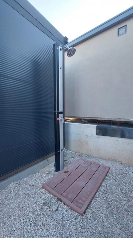 Udendørs bruser, 2 liggestole med et lille bord, parasol og stativ. Mini cocktailbar. SUP, IPTV/Netflix. 1 x Parkeringsplads gratis.