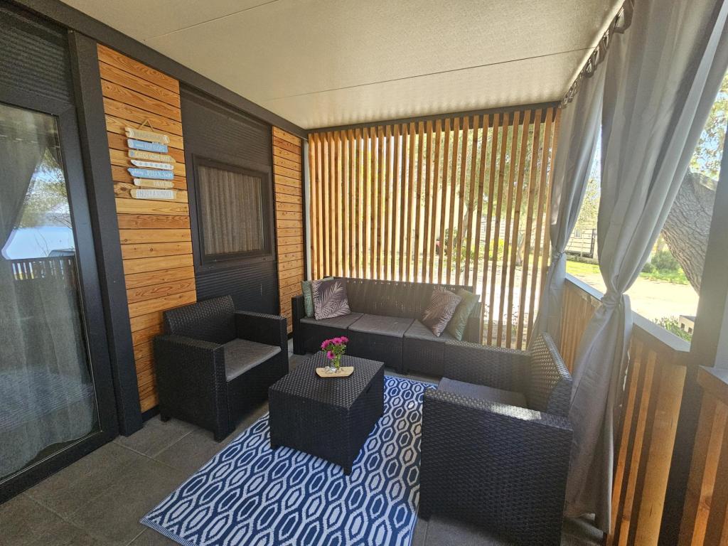 Nyt moderne mobilhome. Beliggende i en rolig og lille landsby, kun få skridt fra stranden. Direkte havudsigt, stor terrasse, gasgrill og liggestole til din perfekte ferie. Den består af 2 soveværelser, badeværelse, køkken og stue med sovesofa. Ejendommen ligger lige ved kysten, i første række til havet, og det er kun 5 minutters gang til butikker, bagerier, restauranter og caféer. Gæsterne har adgang til tv, internet, aircondition, gasgrill, hårtørrer og gratis parkering.