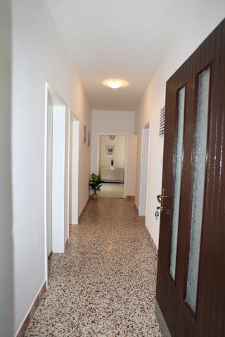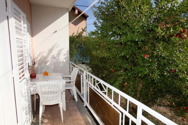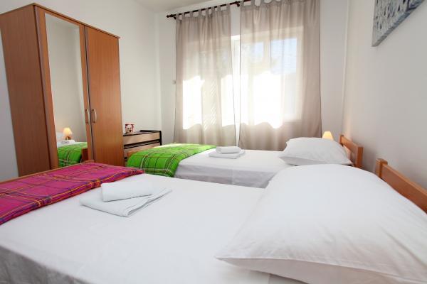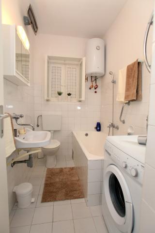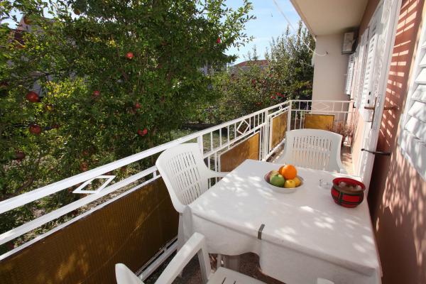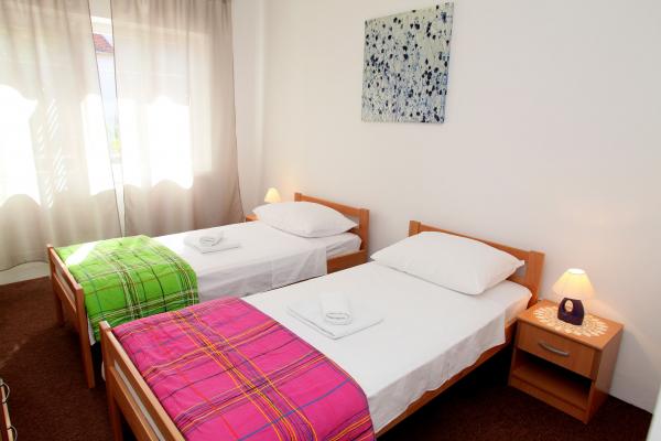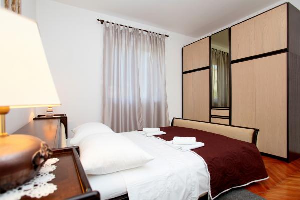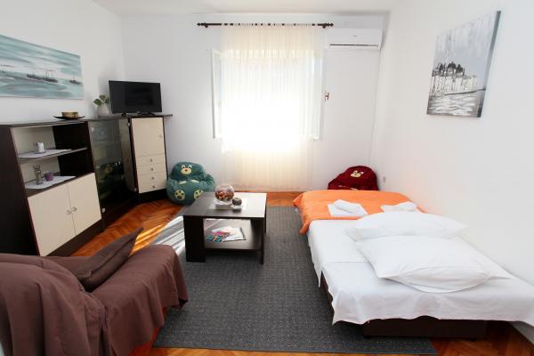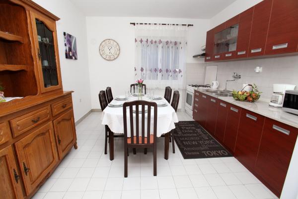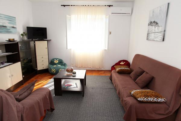 Lejligheden er 80 m2, komfortabelt og omgivet af grønne områder og ligger i familiens hus nær den gamle bydel (ca. 10 minutters gang). Lejligheden er fuldt udstyret og består af to soveværelser (en tredobbelt og en dobbelt), køkken, stue, badeværelse og et lille toilet. I stuen er der en ekstra seng til to personer (klik-klak). Lejligheden har en balkon med bord og stole og en terrasse foran lejligheden med et bord til et behageligt ophold i skyggen. Bag bygningen er der en lille grill og gratis parkeringsplads til to biler. Lejligheden er aircondition. Ny offentlig stenstrand er omkring 500 m væk. Den mest berømte Trogir sandstrand er to busstationer og 1 km fra lejligheden. Med Trogir havnefronten, hver 20 minutter, til overkommelige priser, køre en taxa båd til de mest berømte strande i Trogir område.