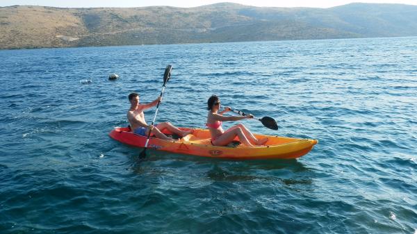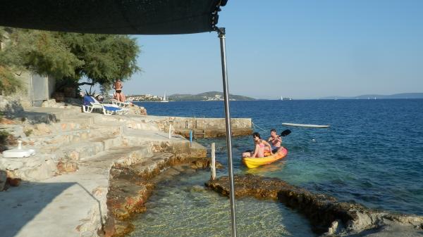 Huset ved havet med privat strand, 6 km fra Trogir. På stranden for vores gæster forudsat liggestole og skygge i skyggen af tamarisk. Parkering er inde i gården, så du behøver ikke bekymre dig for deres biler. Værftet er indhegnet, hvilket bidrager til sikkerheden for dit ophold. Hvis du ønsker at tilbringe ferien tynget ved at organisere ture til stranden, tilbyder vi dig 3 lejligheder. Ap. 1 i stueetagen: 4 personer 2: 3 soveværelser, 2 badeværelser, køkken, spisestue, 40m2 terrasse med udsigt over stranden. Ap. 2 Etage: 4 personer: room no. 1 med badeværelse, værelse nr. 2 med badeværelse, køkken på første sal, terrasse 20m2, alle med udsigt over havet. På terrassen er en grill til gæster. Du er velkommen til at bruge kajakken. Ifølge aftalen, kan vi tilbyde en foran huset båd fortøjning.