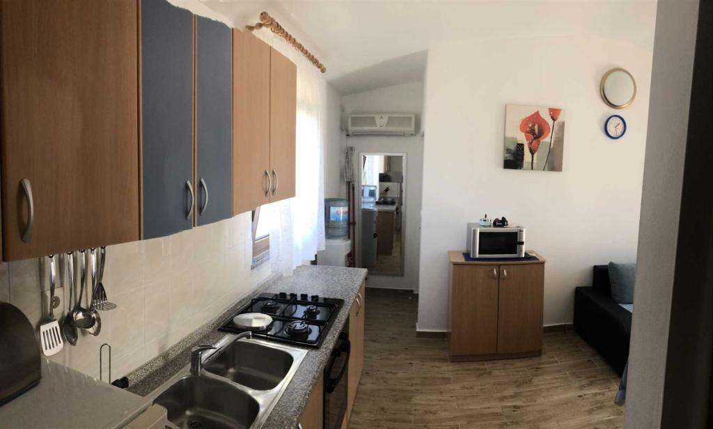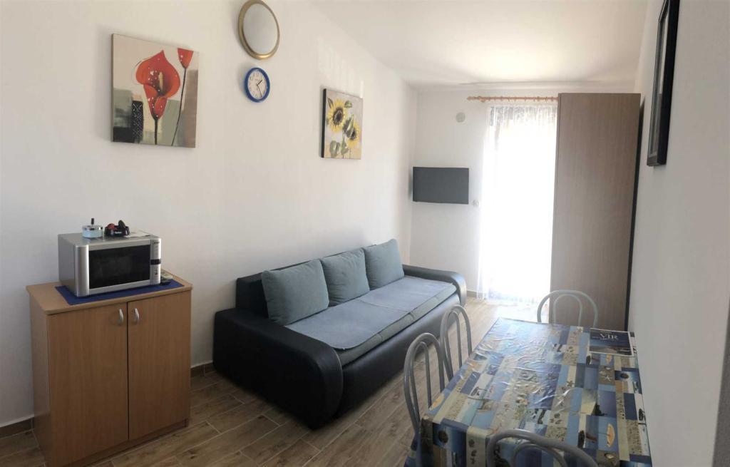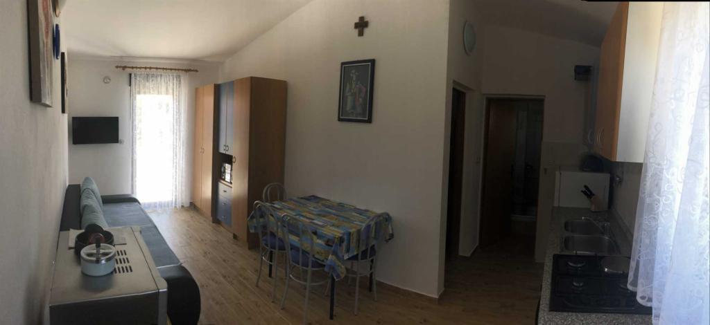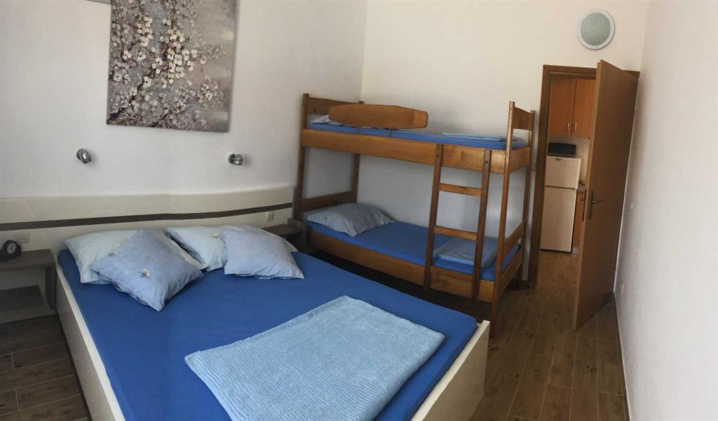 Lejlighed (***) til 4 personer, 70 m fra stranden Žitna uvala, ligger på første sal. Lejligheden er udstyret med LED-TV (TV+SAT), radio, Wi-Fi, parkeringsplads til et køretøj i den indhegnede have, aircondition (brug inkluderet i prisen). I køkkenet finder du alt nødvendigt udstyr og apparater (såsom køleskab med stor fryser, mikrobølgeovn, vandvarmer osv.), soveværelset indeholder en dobbeltseng og en køjeseng, en ekstra seng er placeret i stuen (med en ekstra seng kan lejligheden rumme 5 personer), en rummelig overdækket balkon på 20 m2 med udsigt over havet (øerne Pag og Velebit) med bord, stole og liggestole.