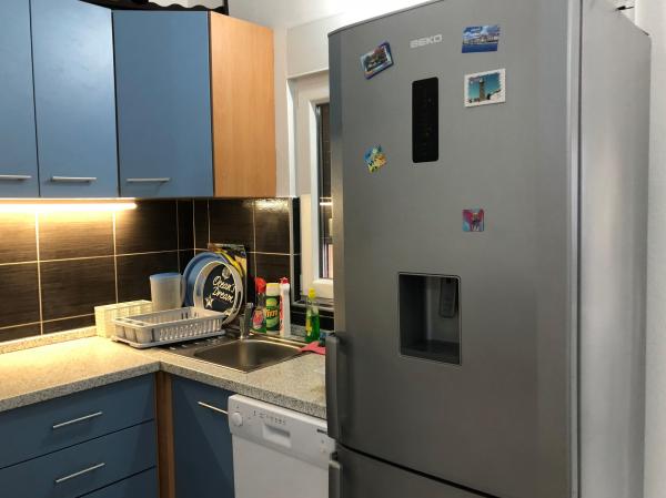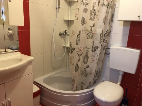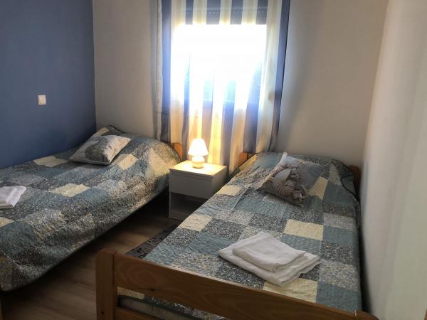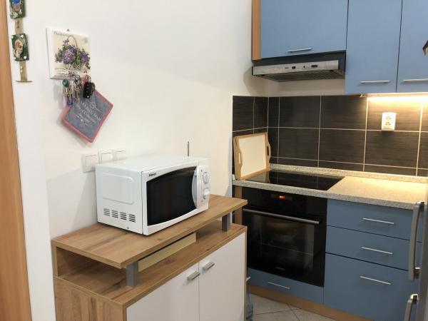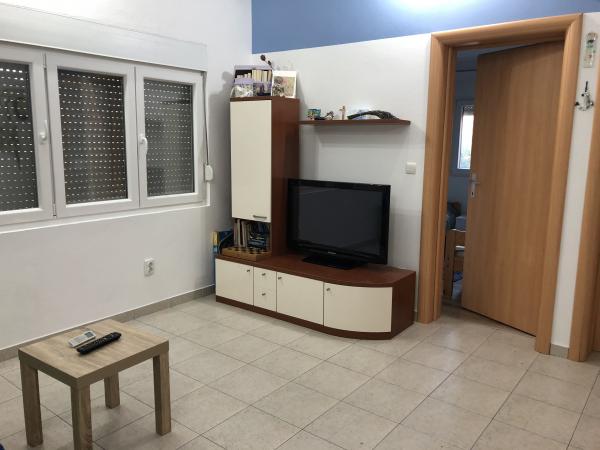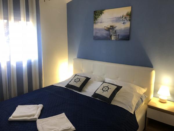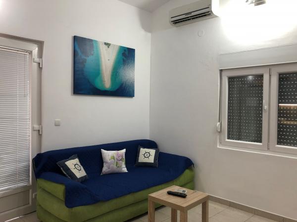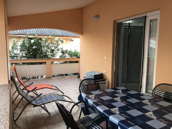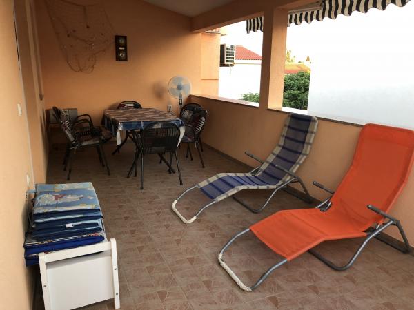 Moderne udstyret lejlighed 200 m fra stranden og beliggende i den første del af øen. Lejligheden (60 m2) ligger på første sal og består af to soveværelser (en dobbeltseng og to separate senge). Rummelig stue med køkken, badeværelse, fladskærms-tv og trådløst internet. Køkkenet har opvaskemaskine, mikroovn, stort køleskab, elkedel, ovn og kogeplader. Den rummelige terrasse (15 m2) har en markise og er overdækket; på terrassen er der liggestole og et rummeligt bord til 6 personer. I lejligheden er der mulighed for at bruge en fælles grill og en vaskemaskine. Vandet i lejligheden er drikkeligt (fra byens vandforsyning). Der tilbydes parkering i bygningen. Rygning er kun tilladt på terrassen.