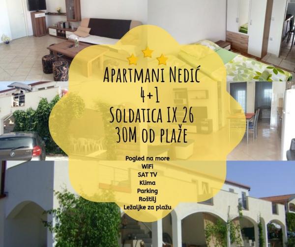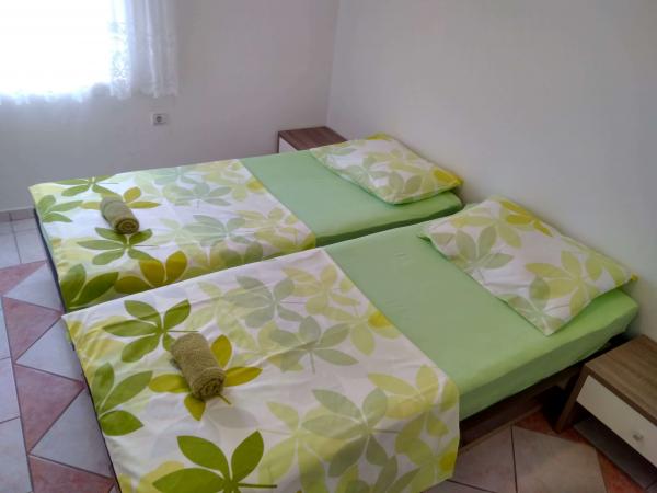 Rummelige og fuldt udstyrede lejligheder på den rolige østlige side af Vir, kun 30 meter fra grusstrand. Hver af de 3 lejligheder har 70 kvadratmeter og kan rumme op til 5 personer. Lejlighederne har to soveværelser, en stor stue, et fuldt udstyret køkken og terrasser med udsigt over havet. Ideelt valg for familier med børn eller yngre par. Der er også en grill i gården, og hver lejlighed har sin egen parkeringsplads.