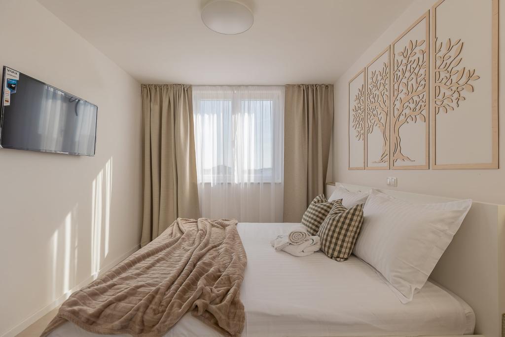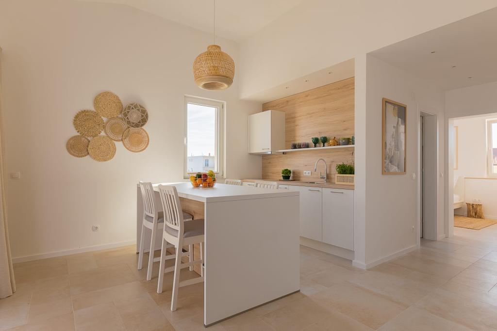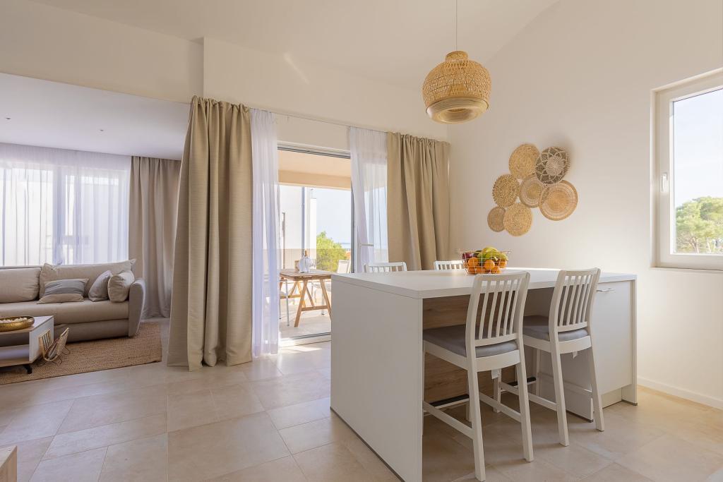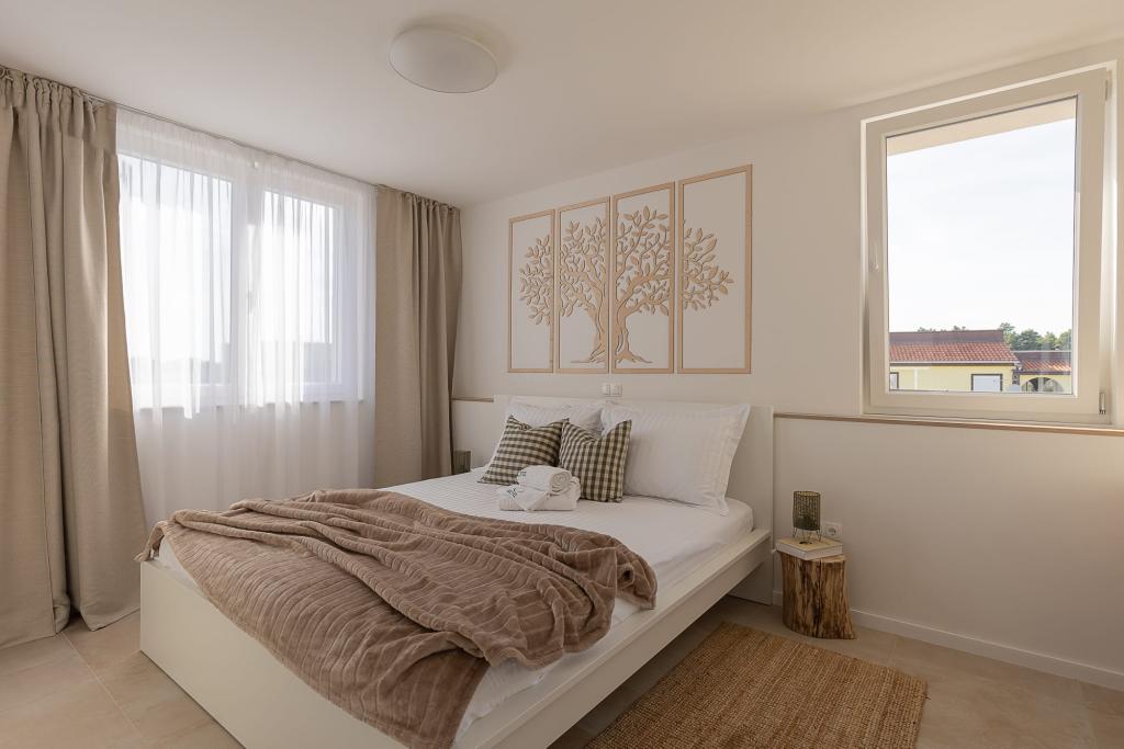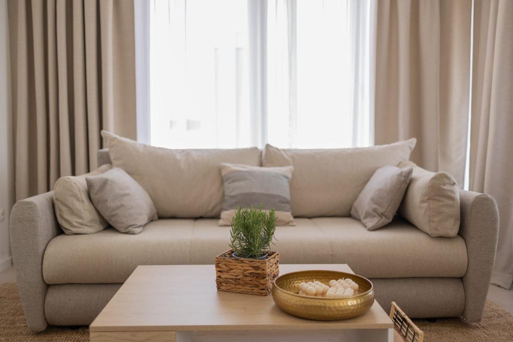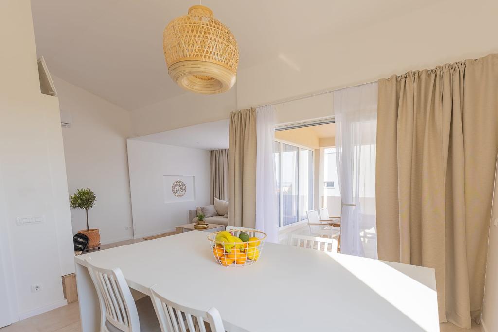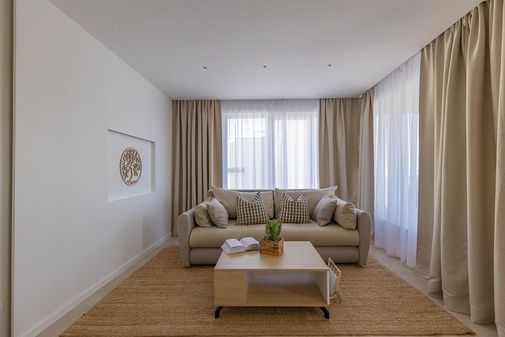 Vores luksuslejligheder er centralt beliggende, tæt på alle restauranter, butikker og hovedattraktioner, hvilket gør dem til det perfekte valg for en ubekymret ferie uden behov for en bil. Stranden ligger en kort gåtur væk. Ejendommen er en helt ny bygning, indrettet med særlig vægt på stil, elegance og kvalitet. De rummelige og luksuriøst møblerede lejligheder tilbyder et højt niveau af komfort, og hver lejlighed har en balkon eller terrasse, der er ideel til afslapning i løbet af dagen og aftenen. Interiøret er omhyggeligt designet og udstyret med naturlige materialer, der skaber en behagelig, varm og sofistikeret atmosfære. Gæsterne har privat parkering direkte ved indgangen til bygningen, hvilket yderligere bidrager til bekvemmeligheden og komforten under deres ophold. Disse lejligheder er ideelle for gæster, der søger en kombination af en førsteklasses beliggenhed, moderne luksus og en følelse af hjem.